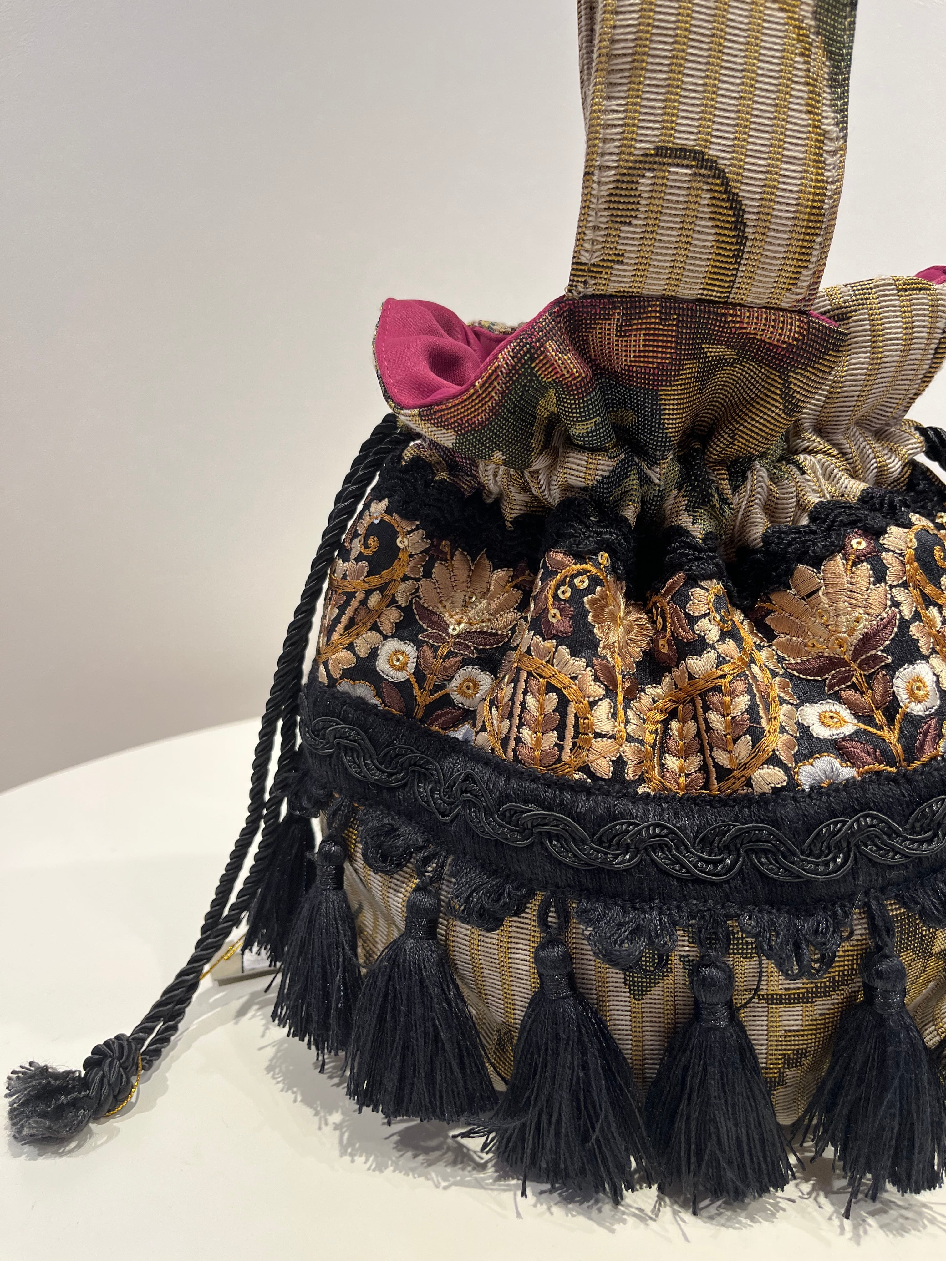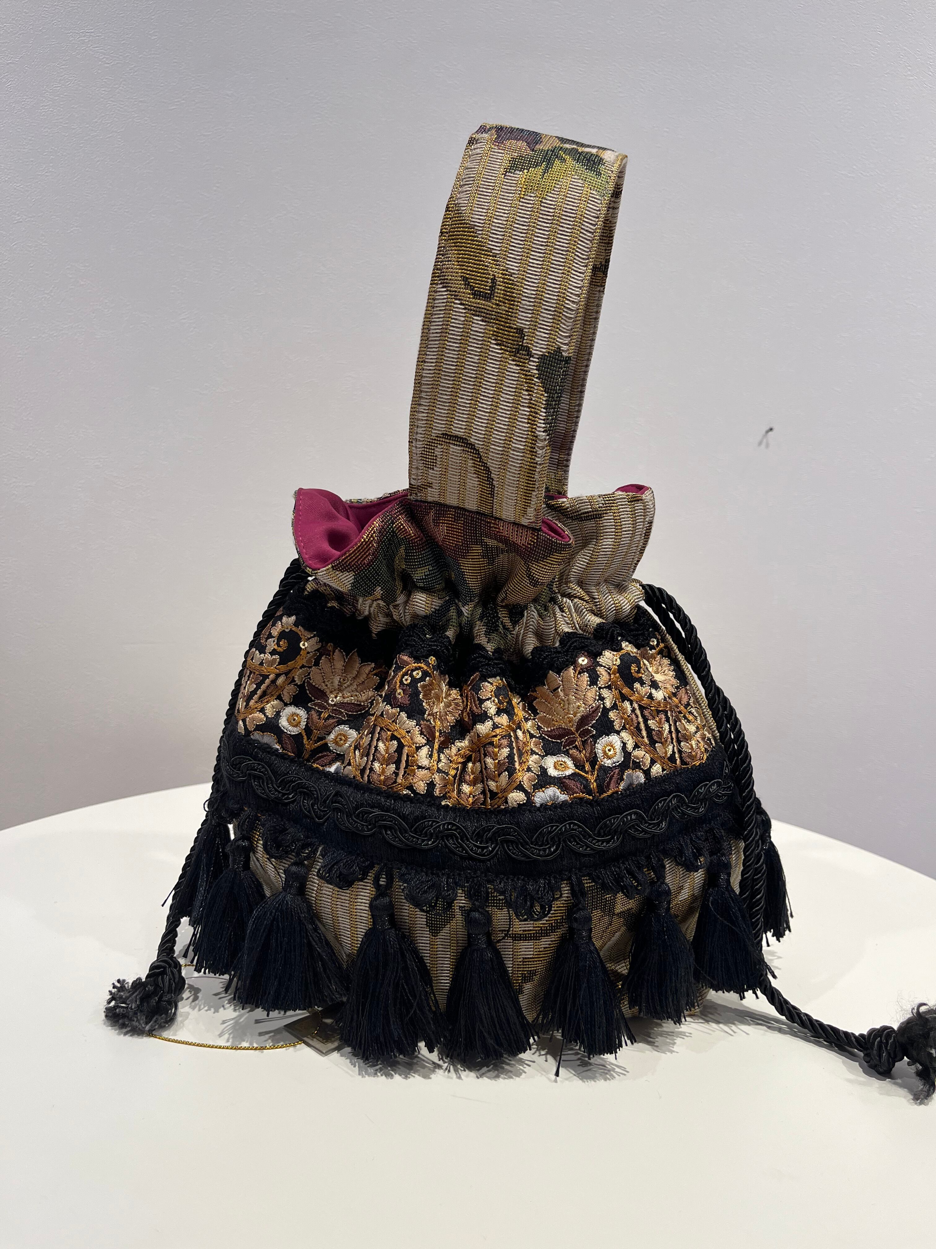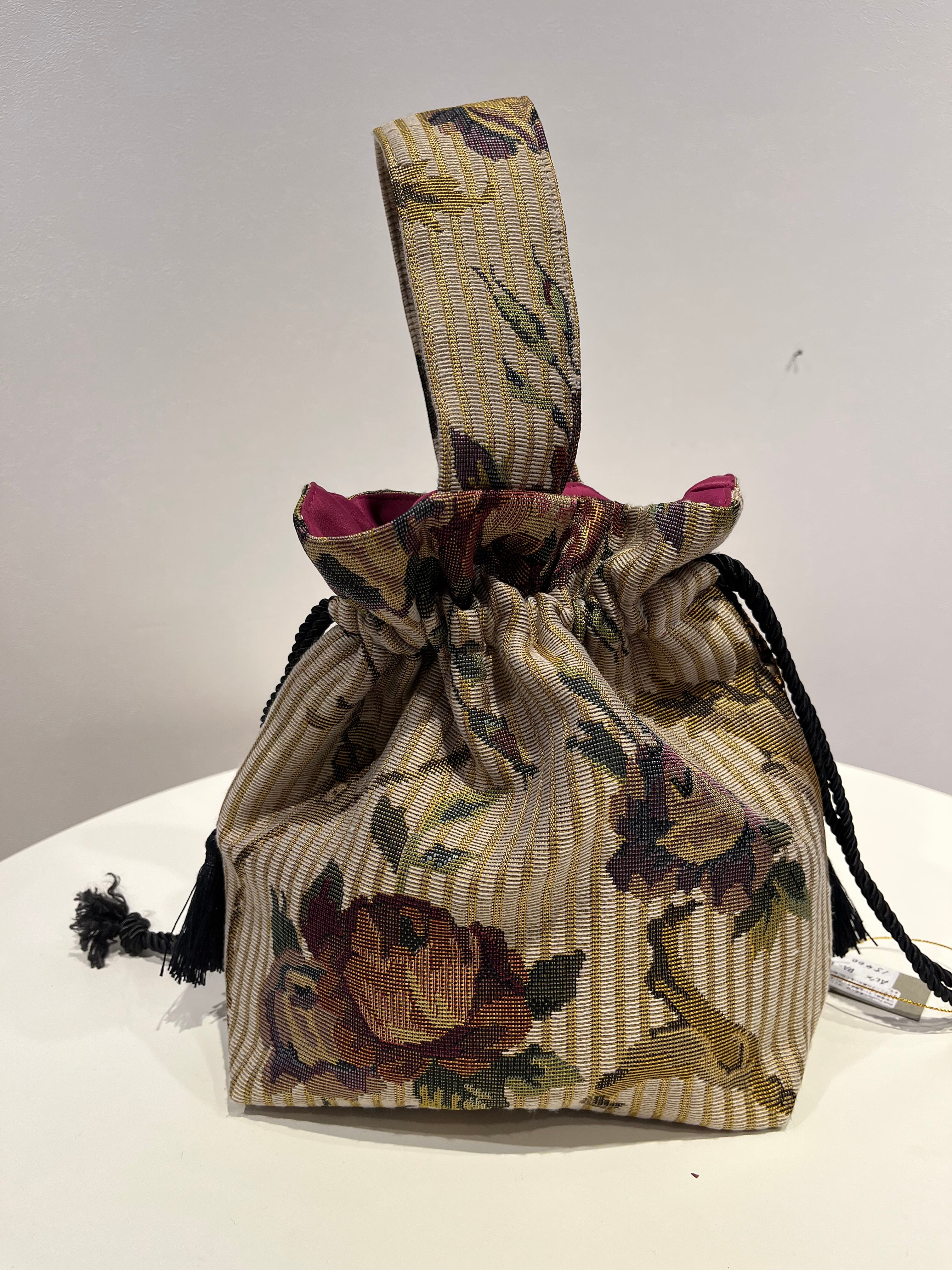 アンティーク生地の巾着は、味わい深い風合いが魅力のアイテムです。しっかりとした素材感が心地よく、日常使いにも特別なお出かけにもぴったりです。シンプルでありながら個性的なデザインは、さまざまなシーンで活躍すること間違いありません。