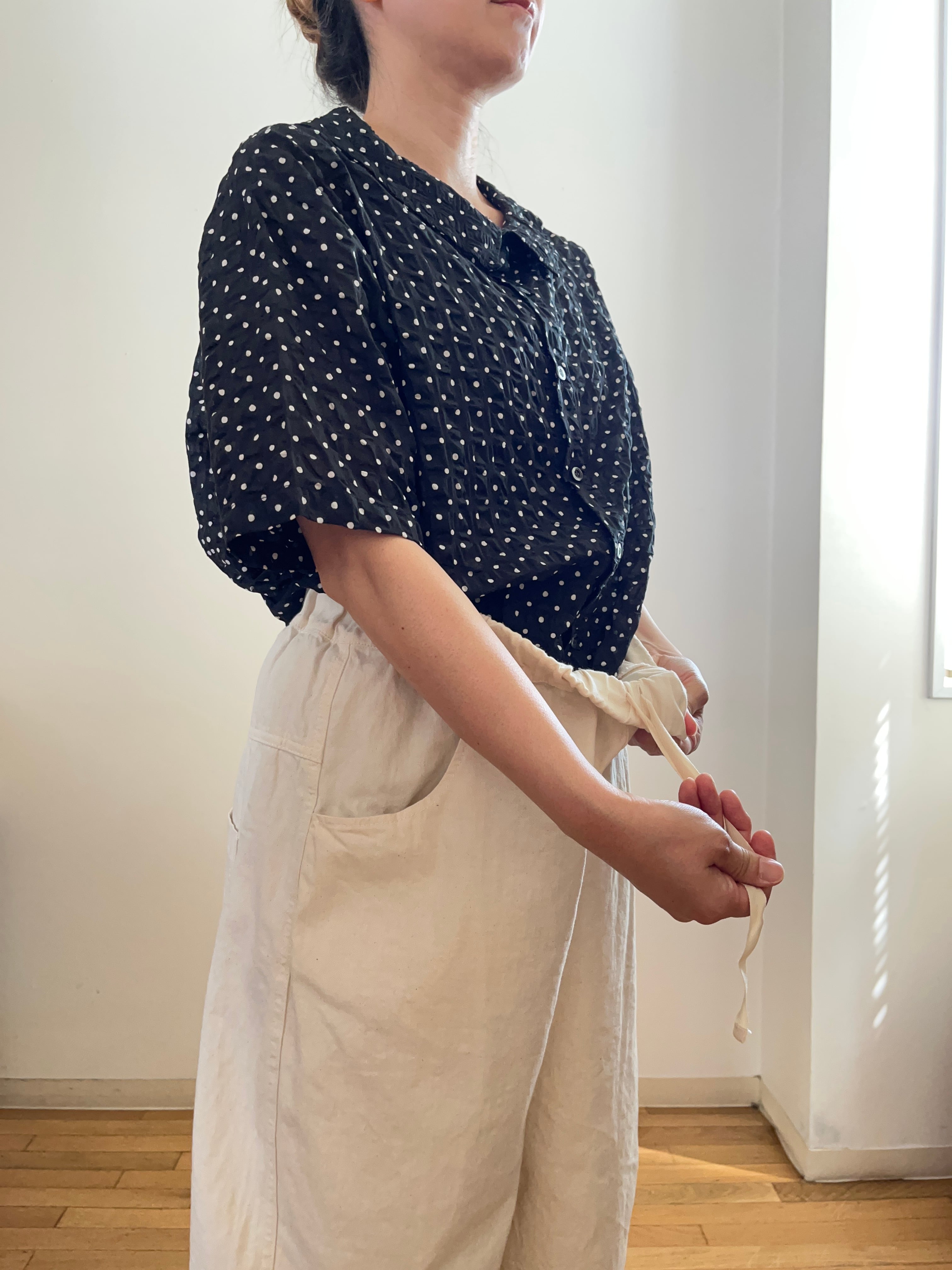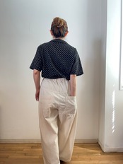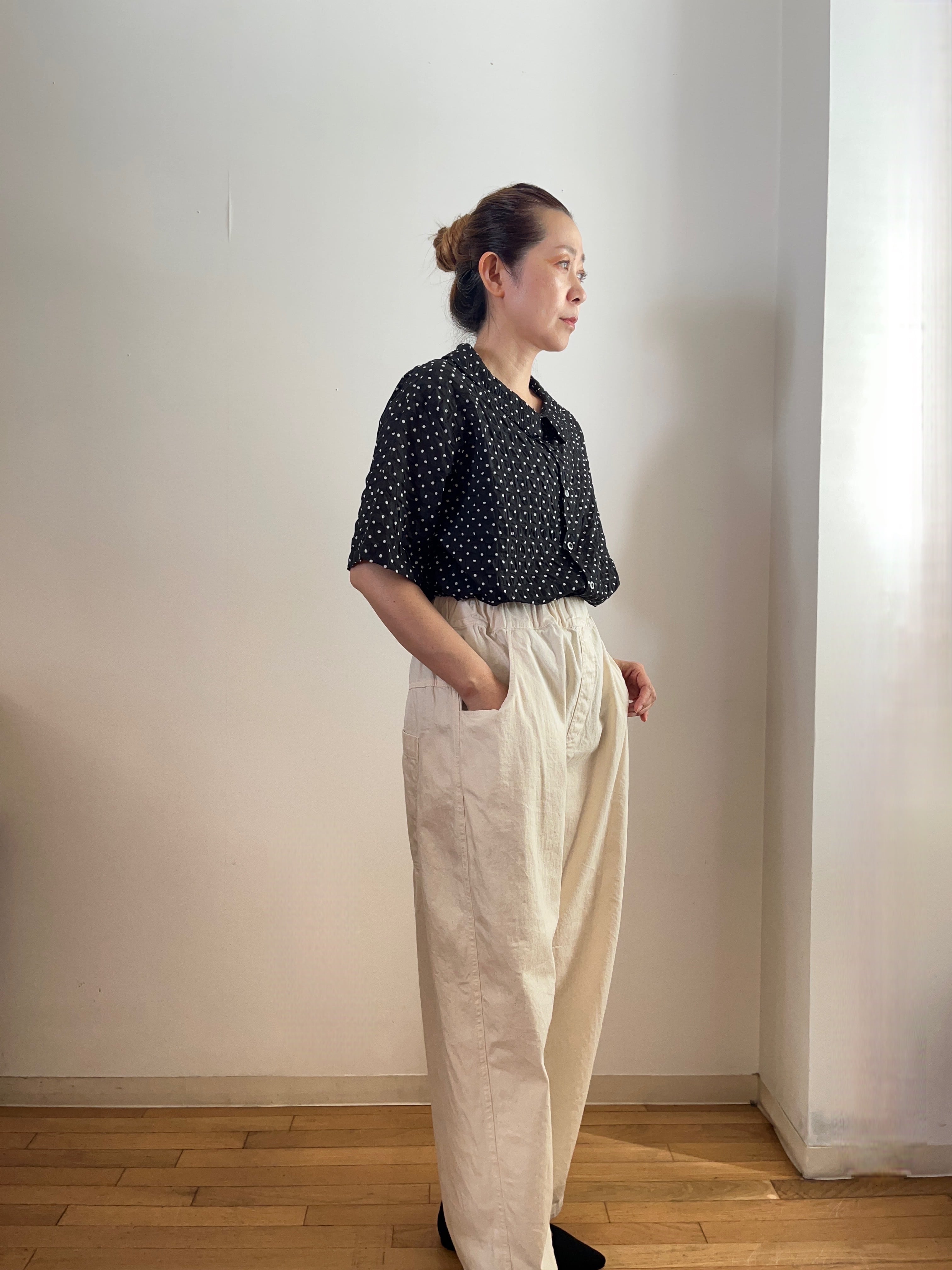 ゆったりとしたシルエットながらも綺麗なラインを演出してくれる8オンスムラデニムです。気になる部分をさりげなく隠して、おしゃれに決まるストレートシルエットです。もちろんウエストゴムで楽に履いていただけます。フェイクのフライ部分は、飾りステッチでメンズライクな印象に。口の大きいポケットは、手がすっぽりと入ります。バックにも印象的なポケットを配置しています。
