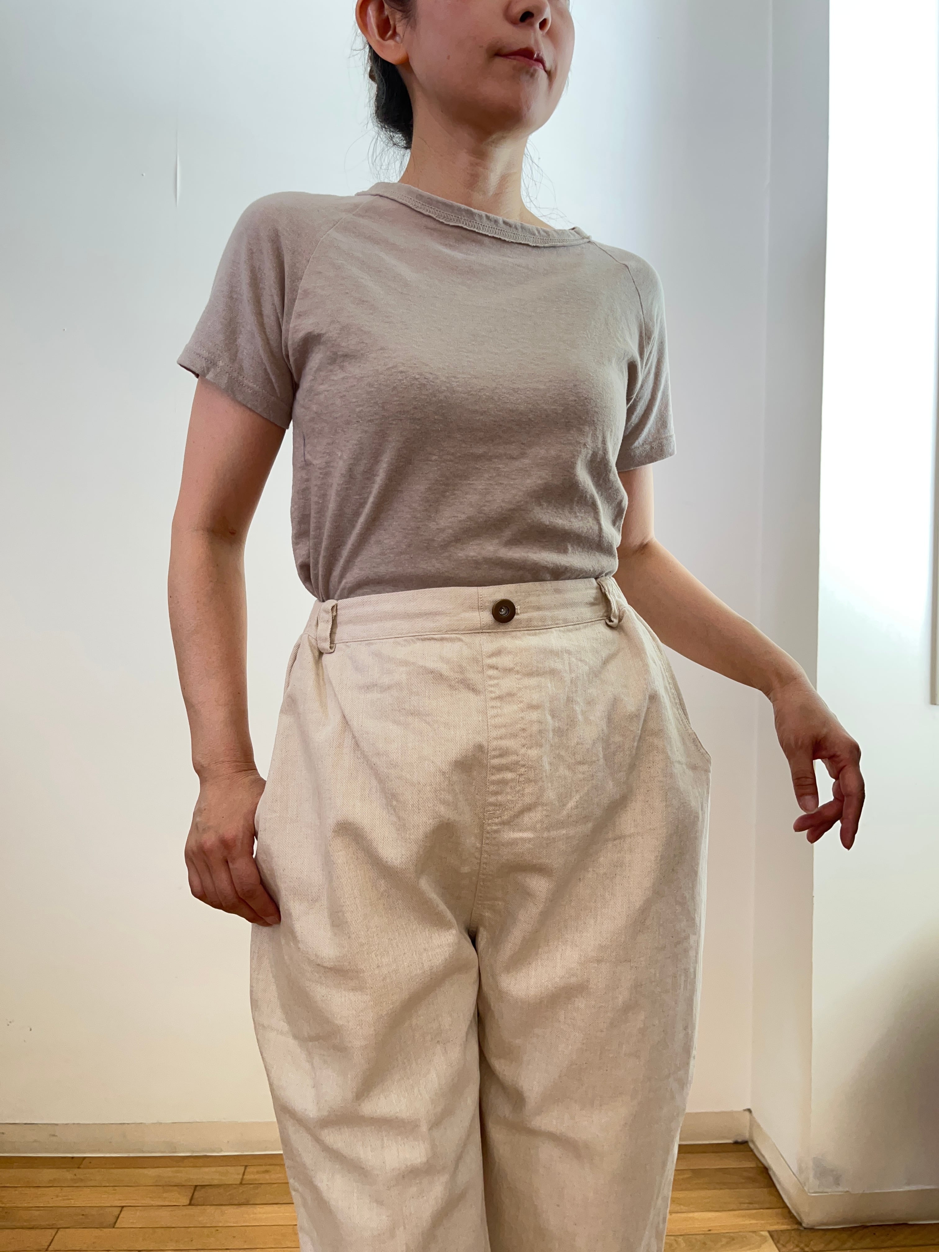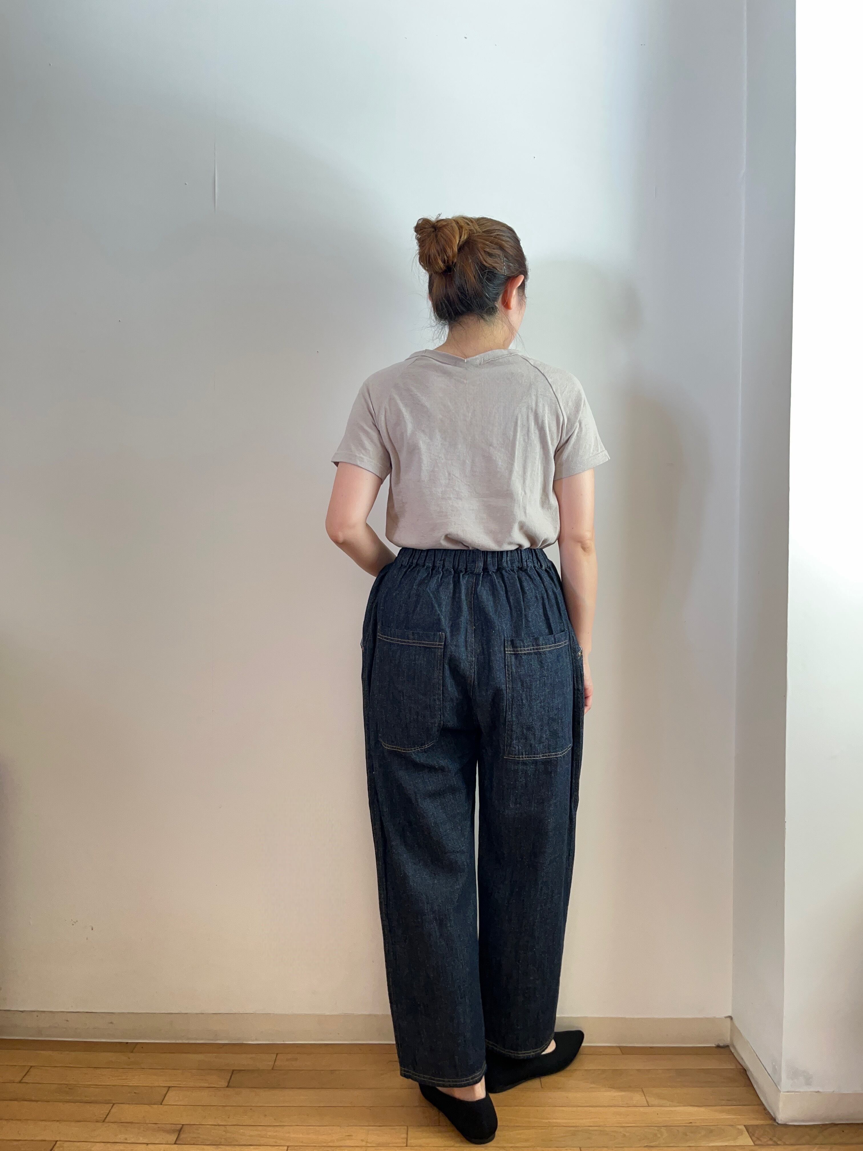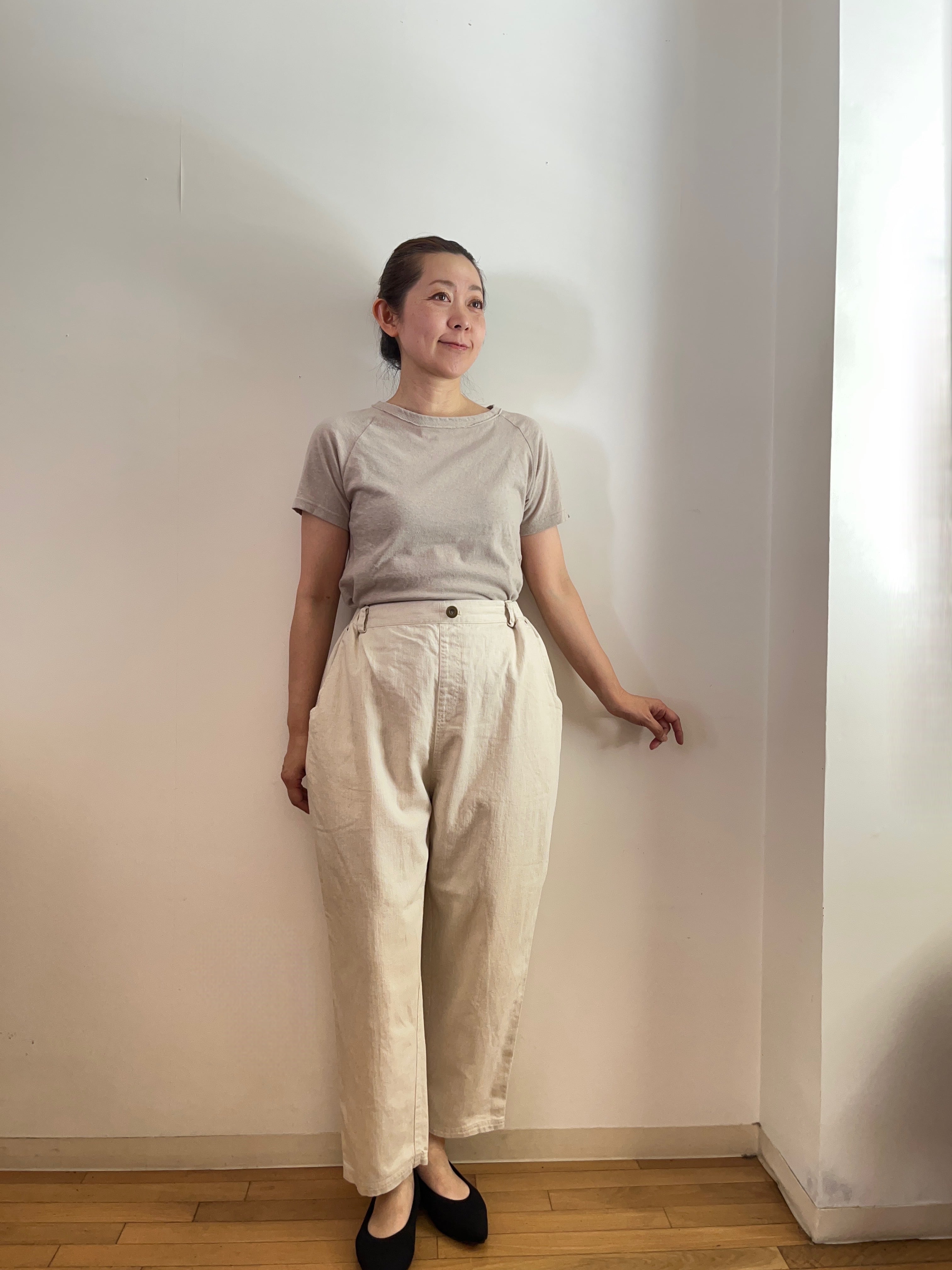 ルーズなシルエットが、履くだけでこなれ感を演出するパンツです。ウエスト背面にはゴムを施していて、締め付け感の少ない履き心地です。