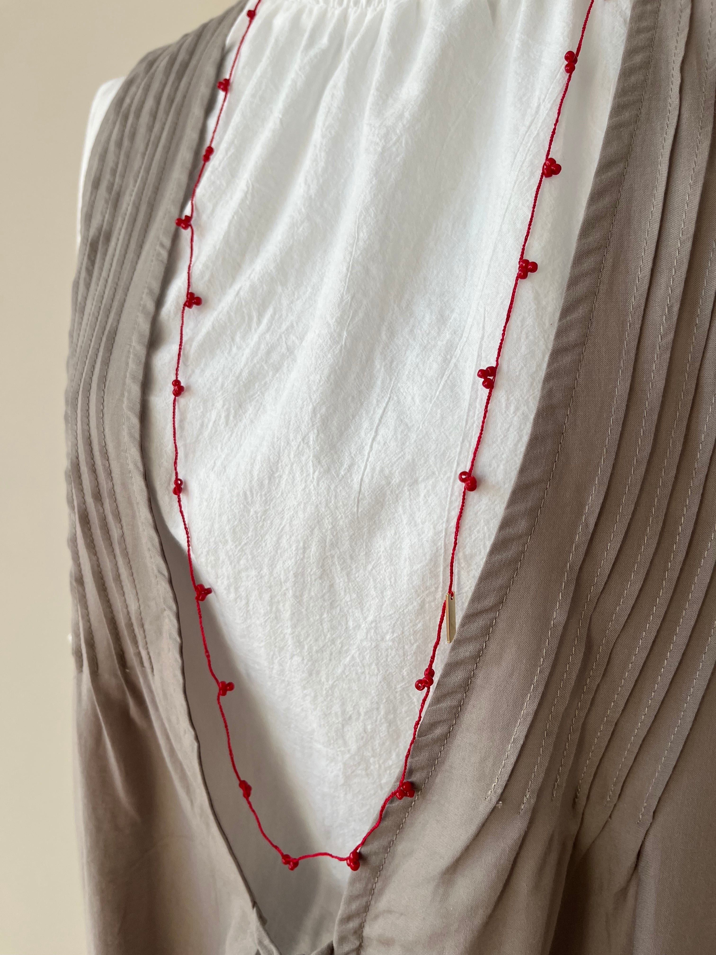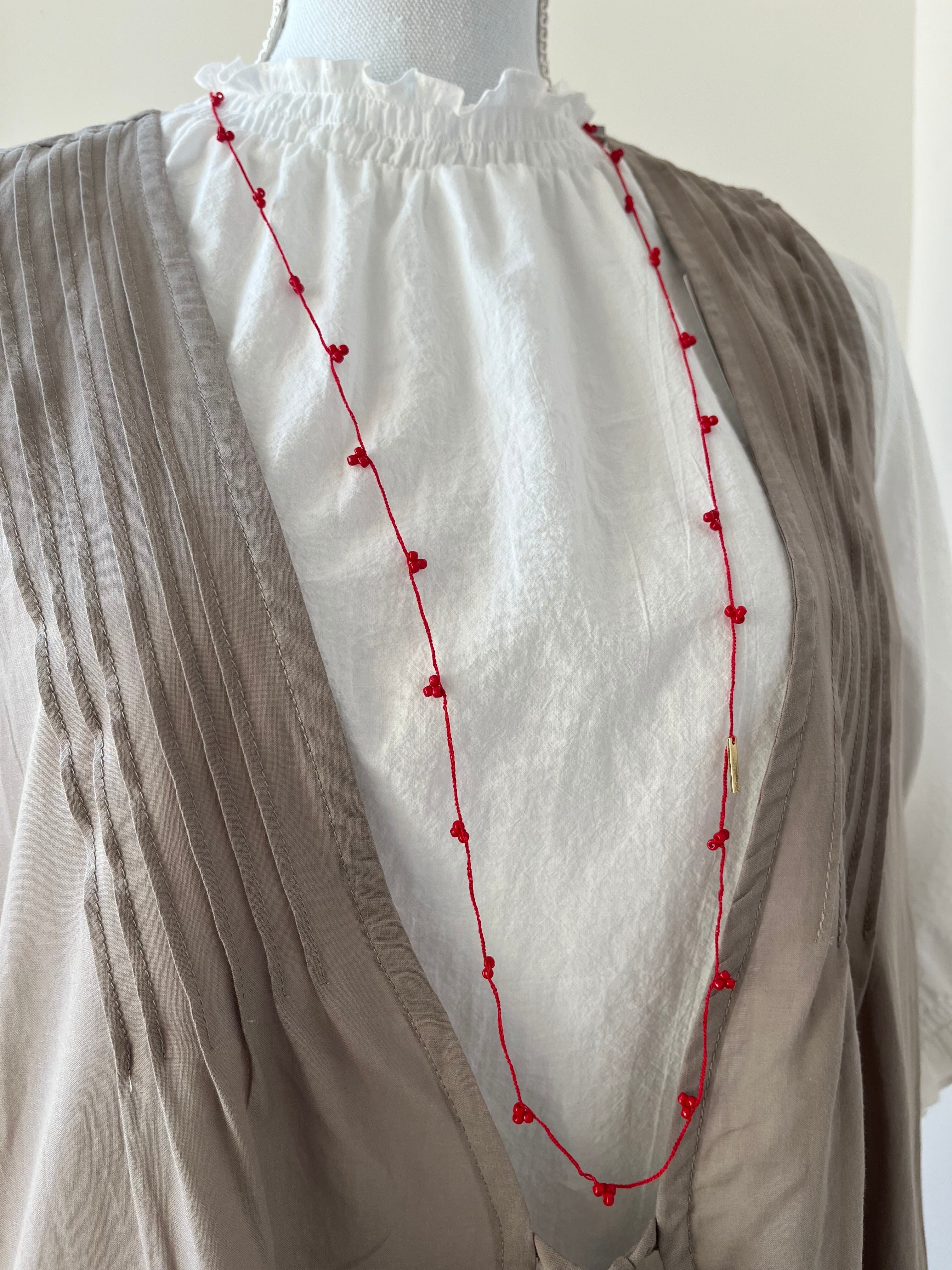 カラーはレッド、とブラックビーズにネイビーの糸の2色展開です。
