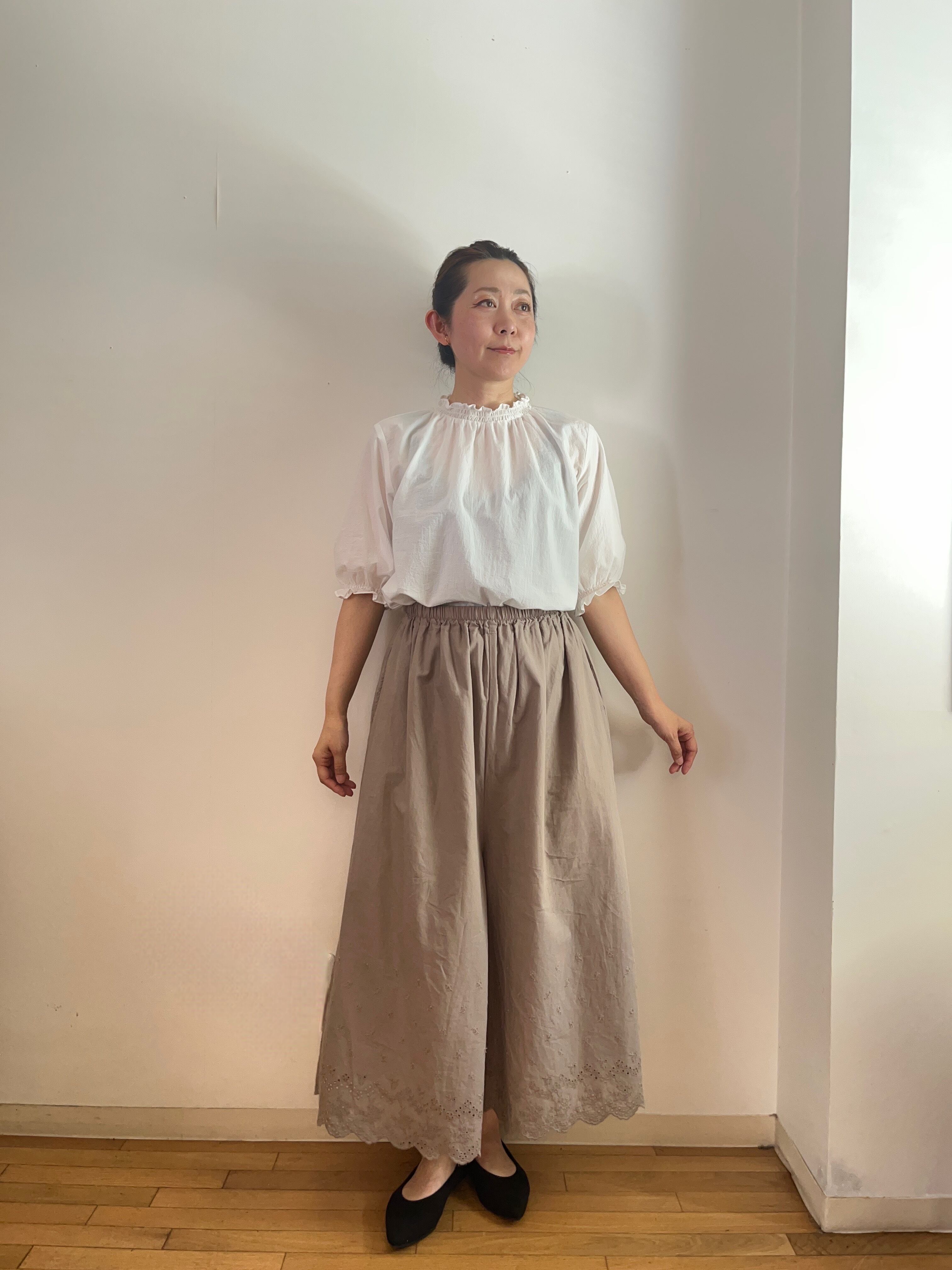 エレガントなスカラップ刺繍が施されたフレアパンツです。柔らかな素材感が心地よく、スタイルを美しく見せながらも動きやすさを兼ね備えています。