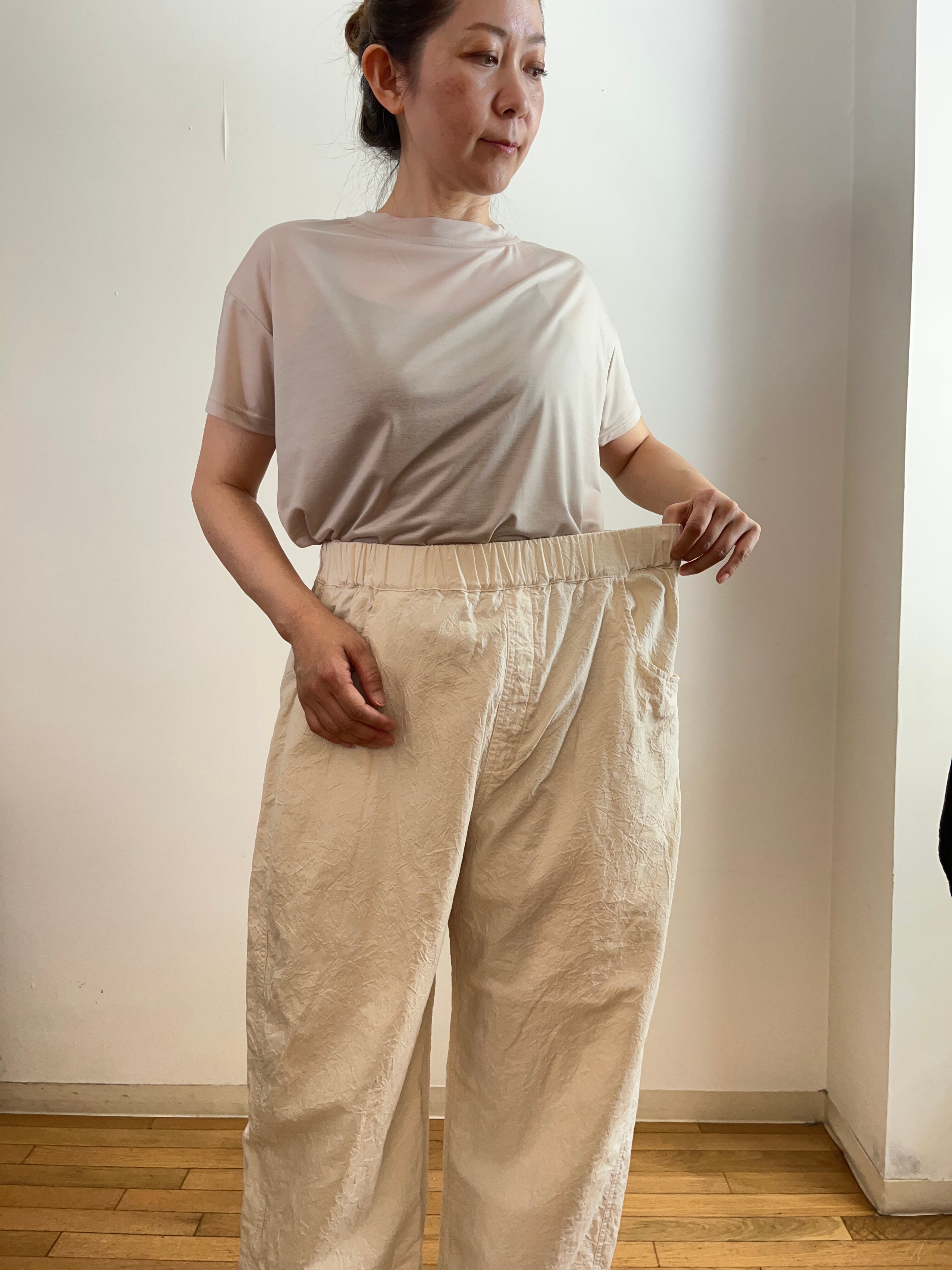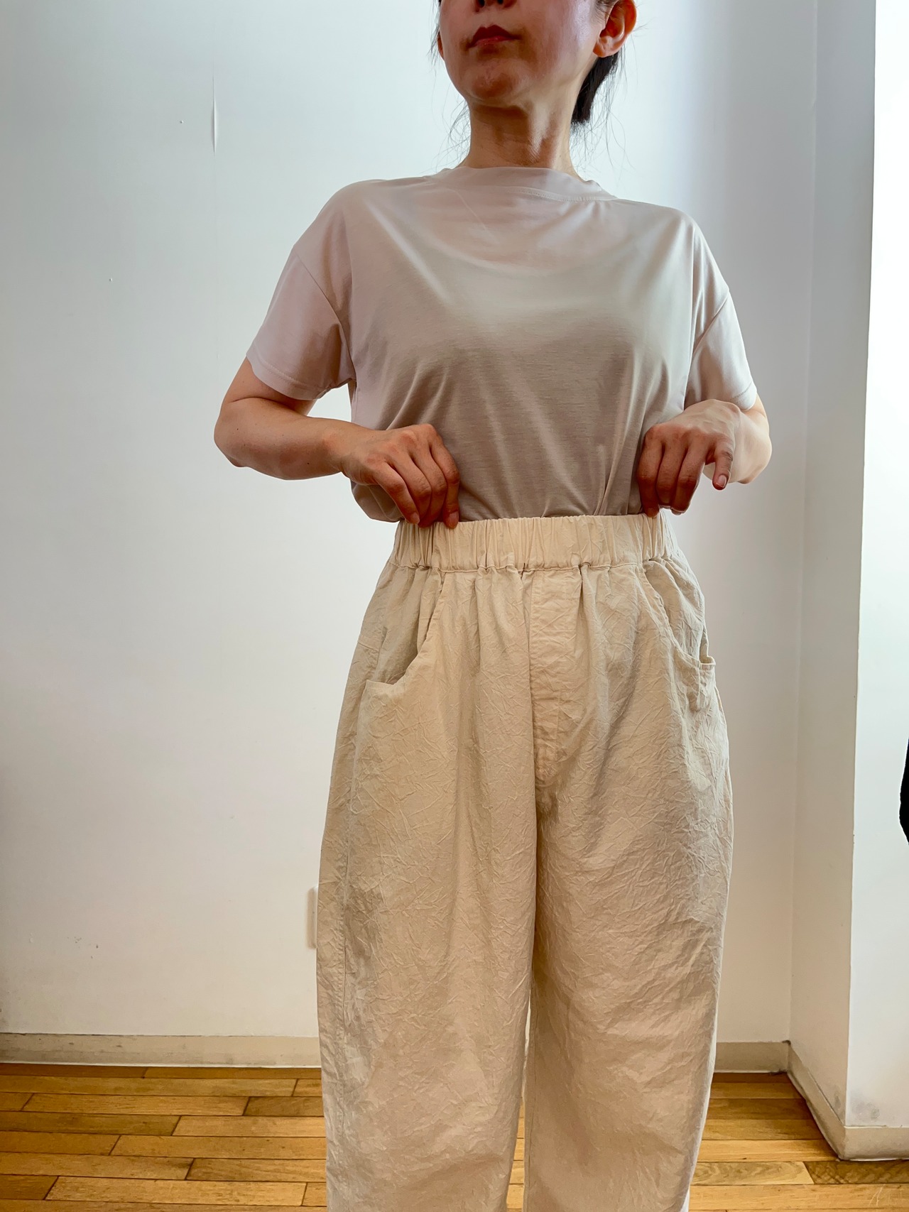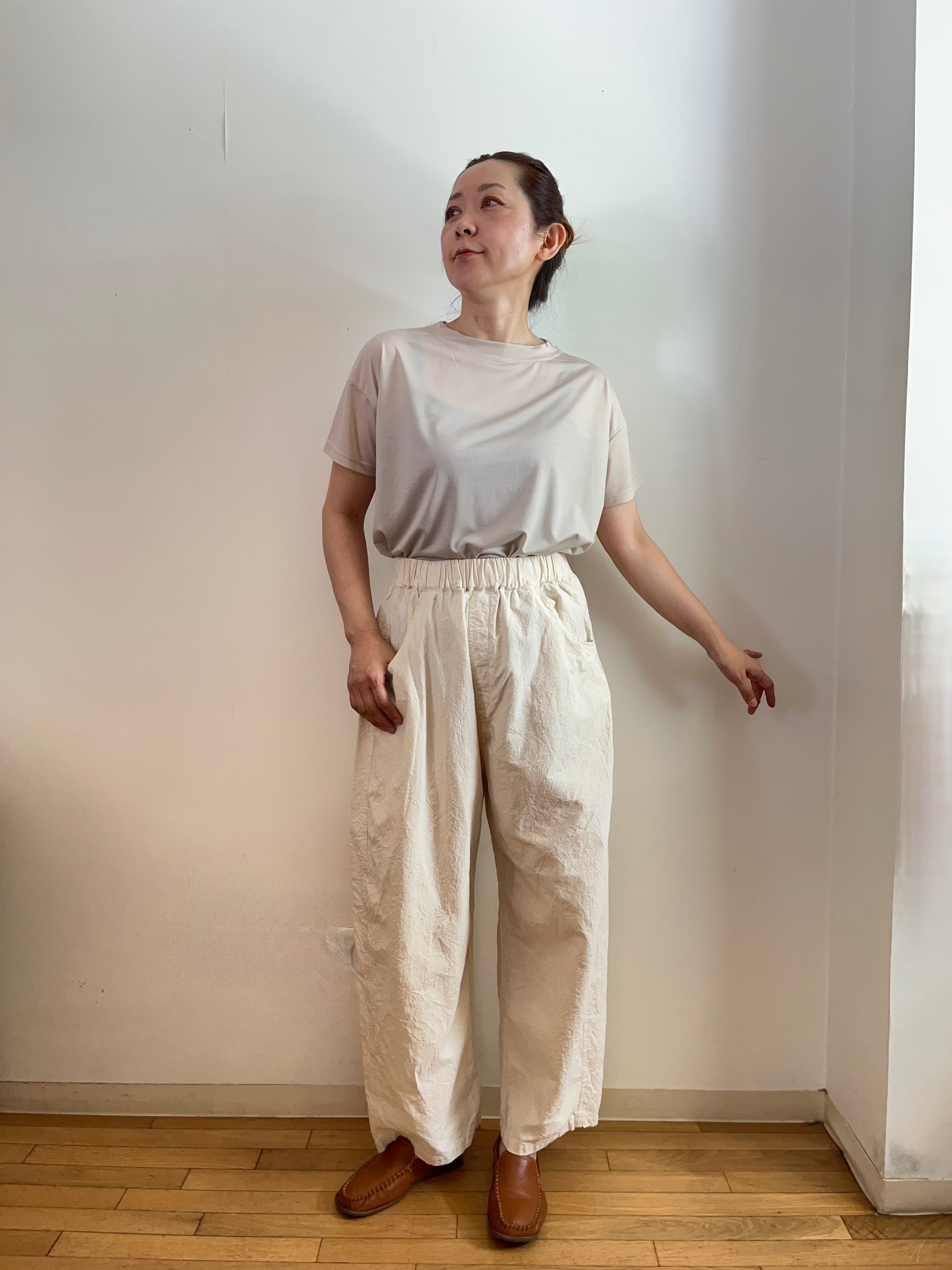 春夏をノンストレスで過ごすことが出来るシーチングハンドワッシャーノッポパンツです。綿素材 + ゆるっとしたストレートシルエットで、シーチング生地なので、通気性が良く柔らかく、暑い夏も快適におしゃれを楽しむことができるアイテムです。サンダルなどに合わせるとシーズンムード漂う清涼感のある着こなしがお楽しみいただけます。