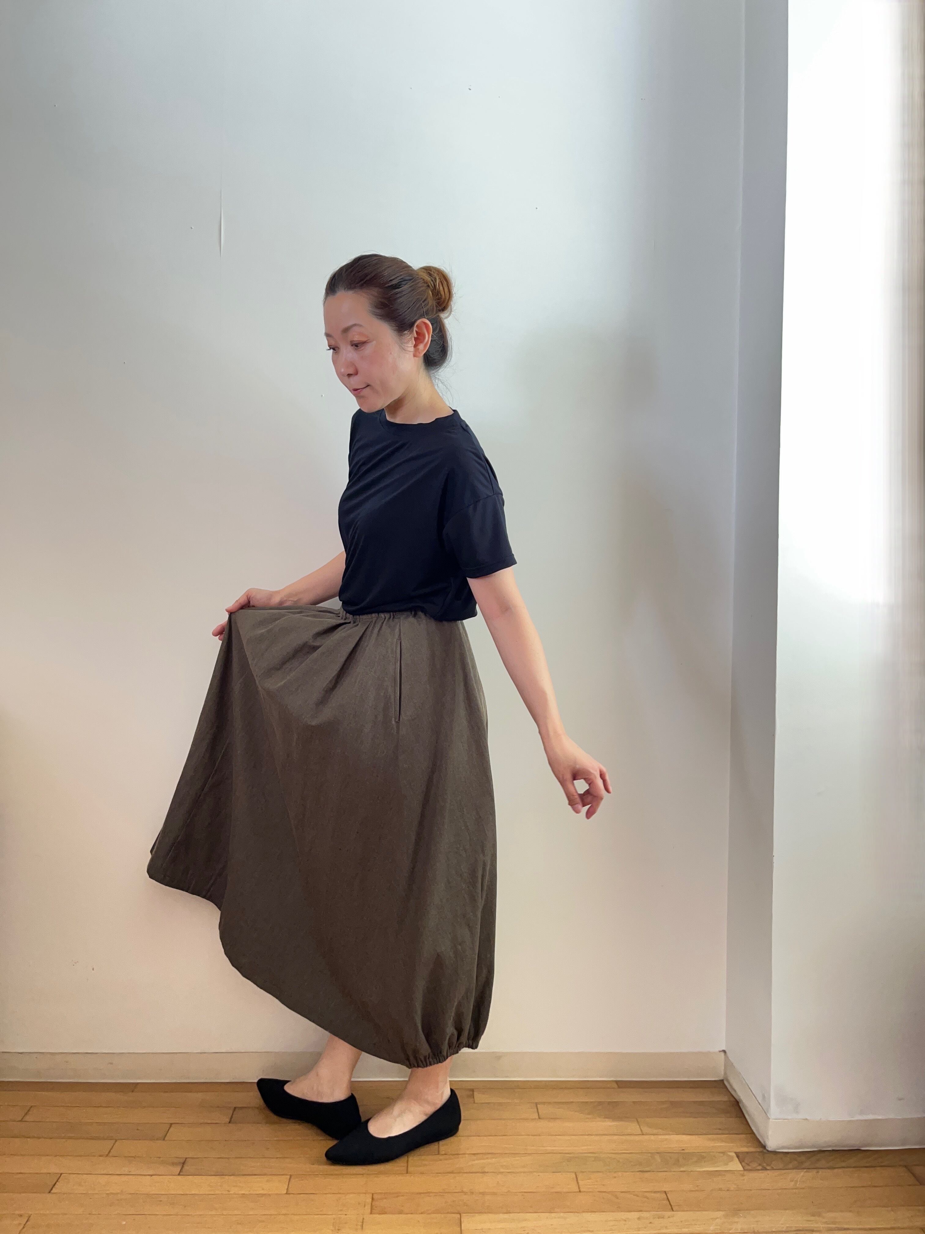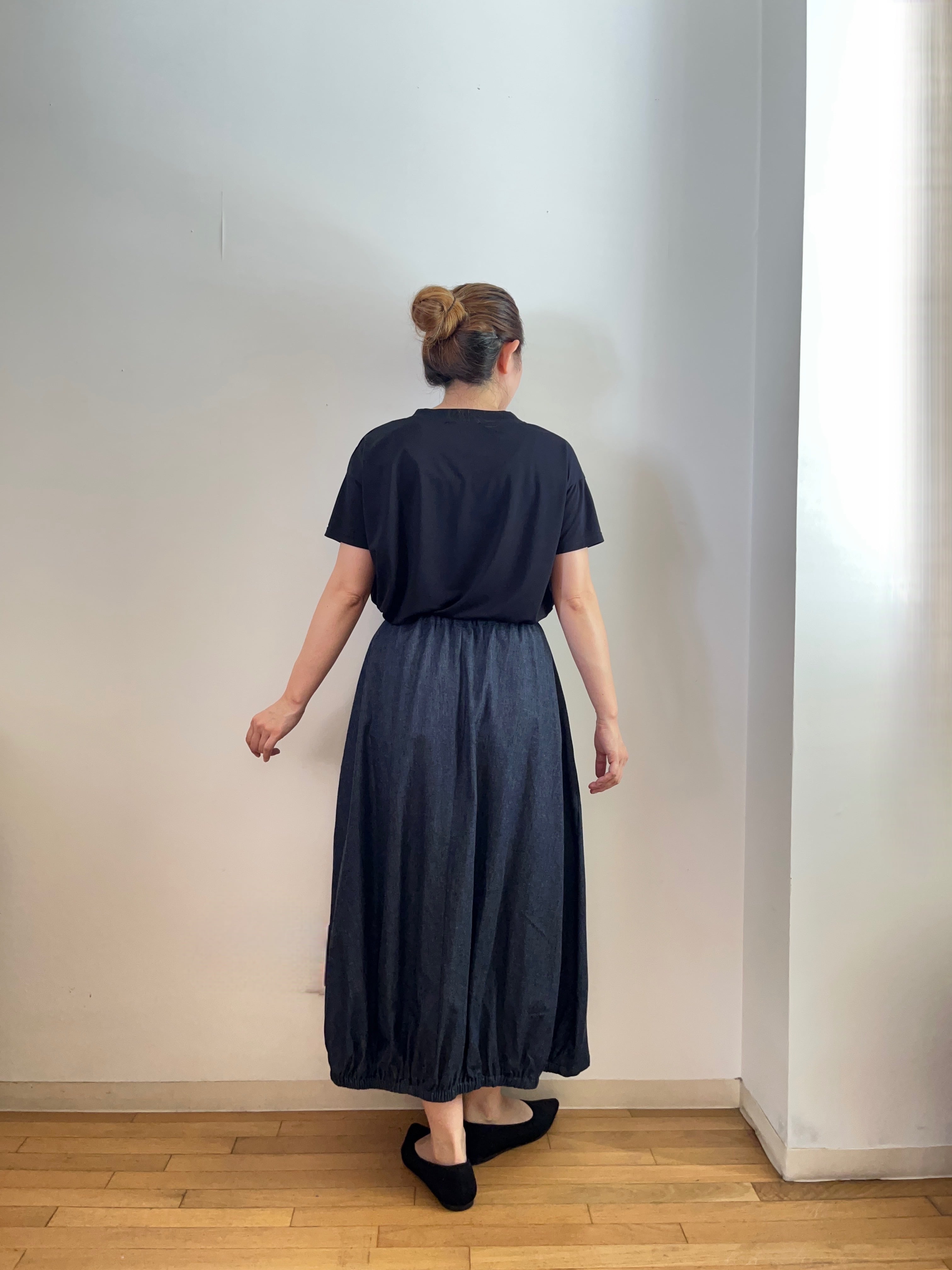 後ろ裾にゴムが入っていて、バックスタイルはふんわりしたシルエットになります。
