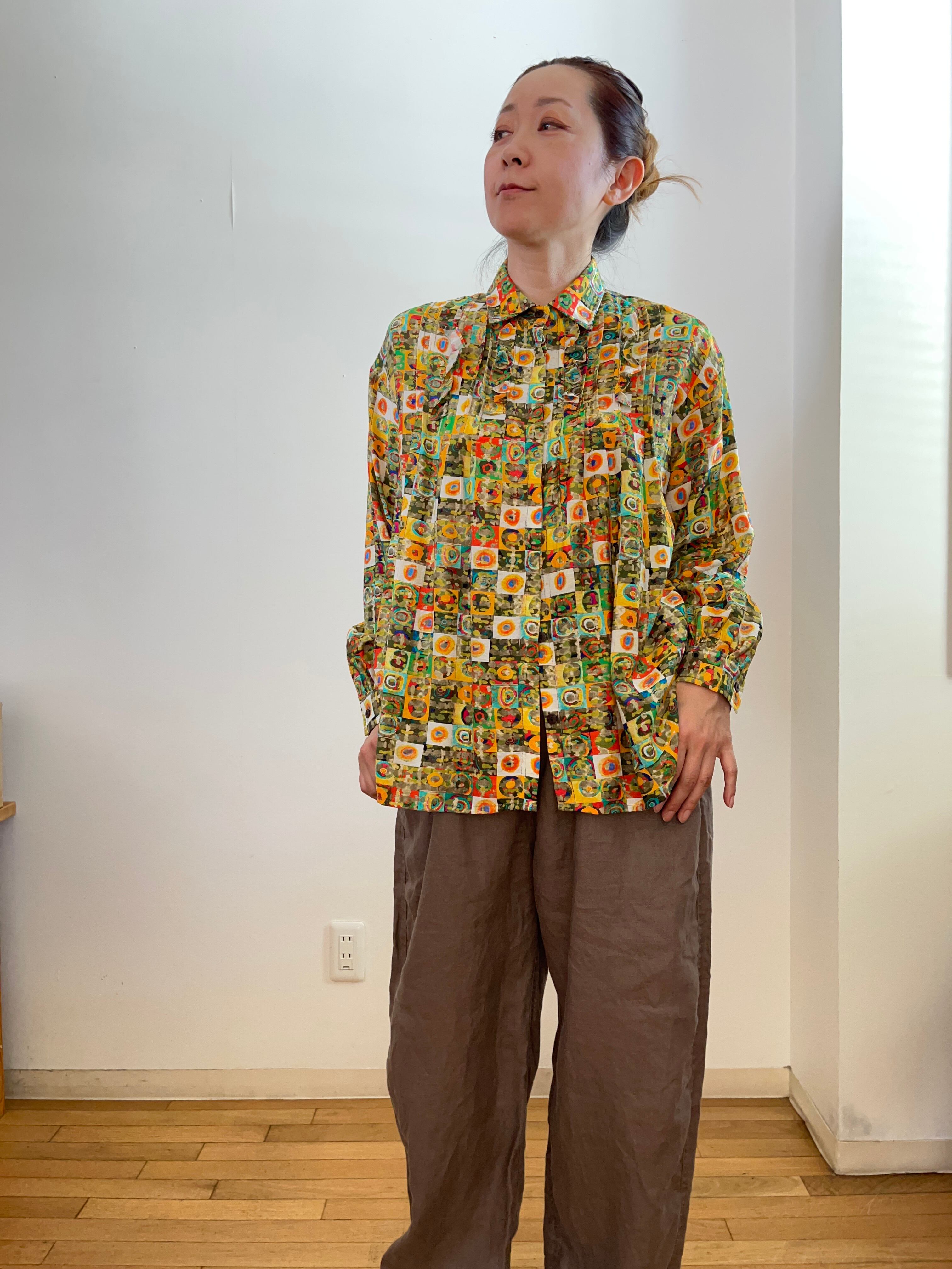 大人のカジュアルにぴったりな、イエローベースの胸元フリル柄シャツが登場です!