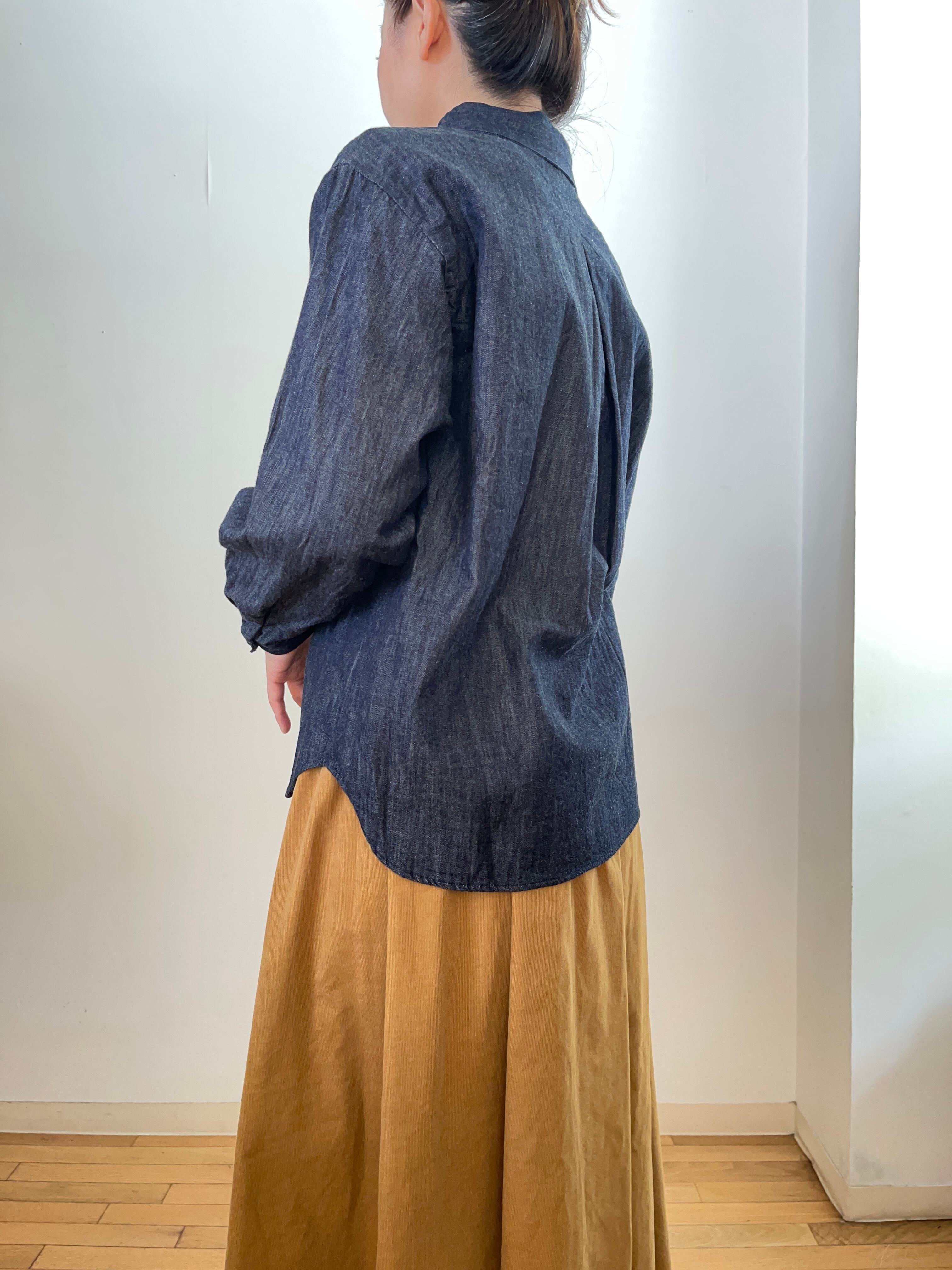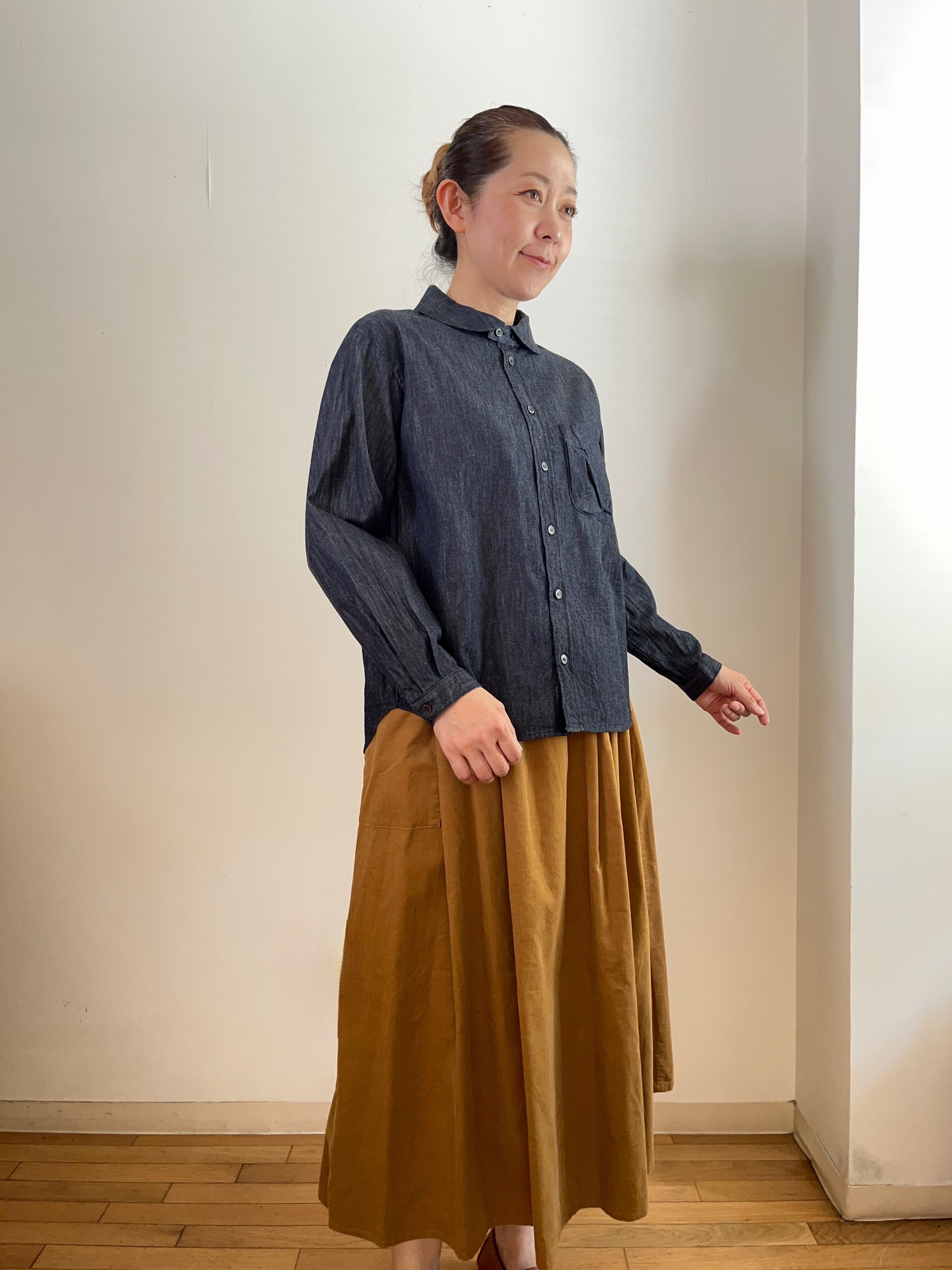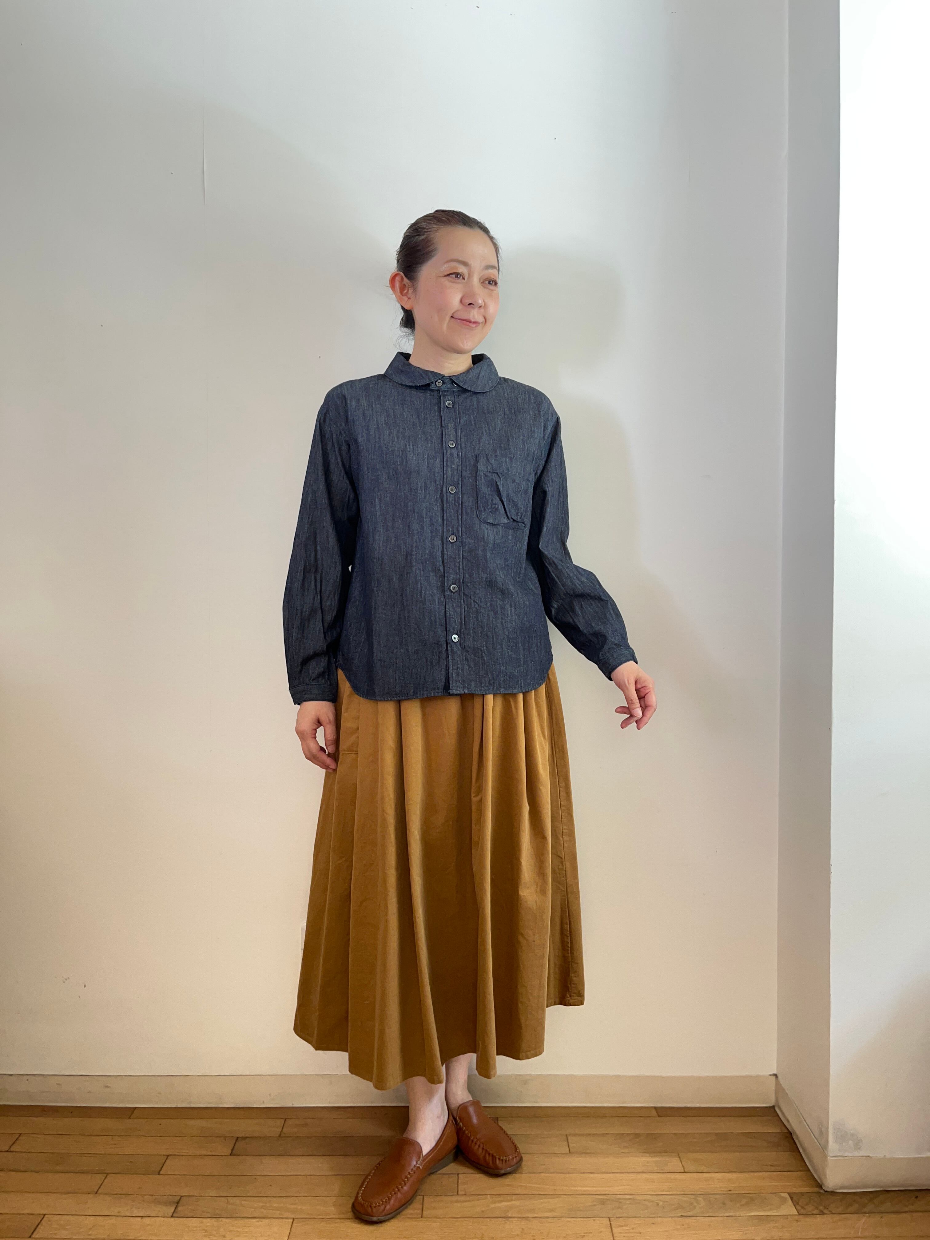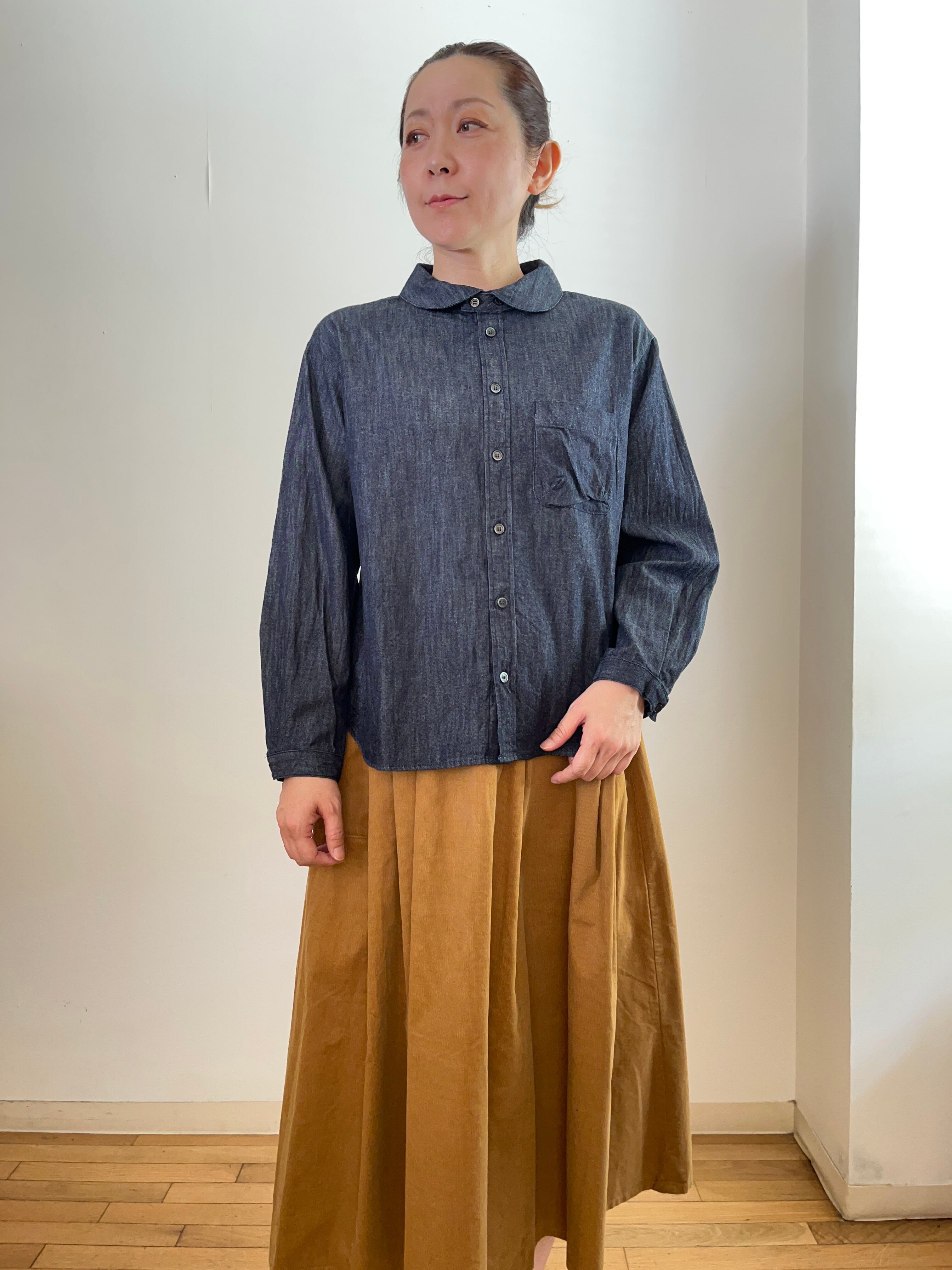 程よいカジュアル感と丸襟デザインが特徴で、シンプルながらもおしゃれな雰囲気を漂わせます。柔らかなデニム素材により、日常のコーディネートをより一層楽しませてくれる一着です。