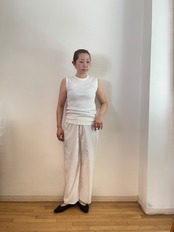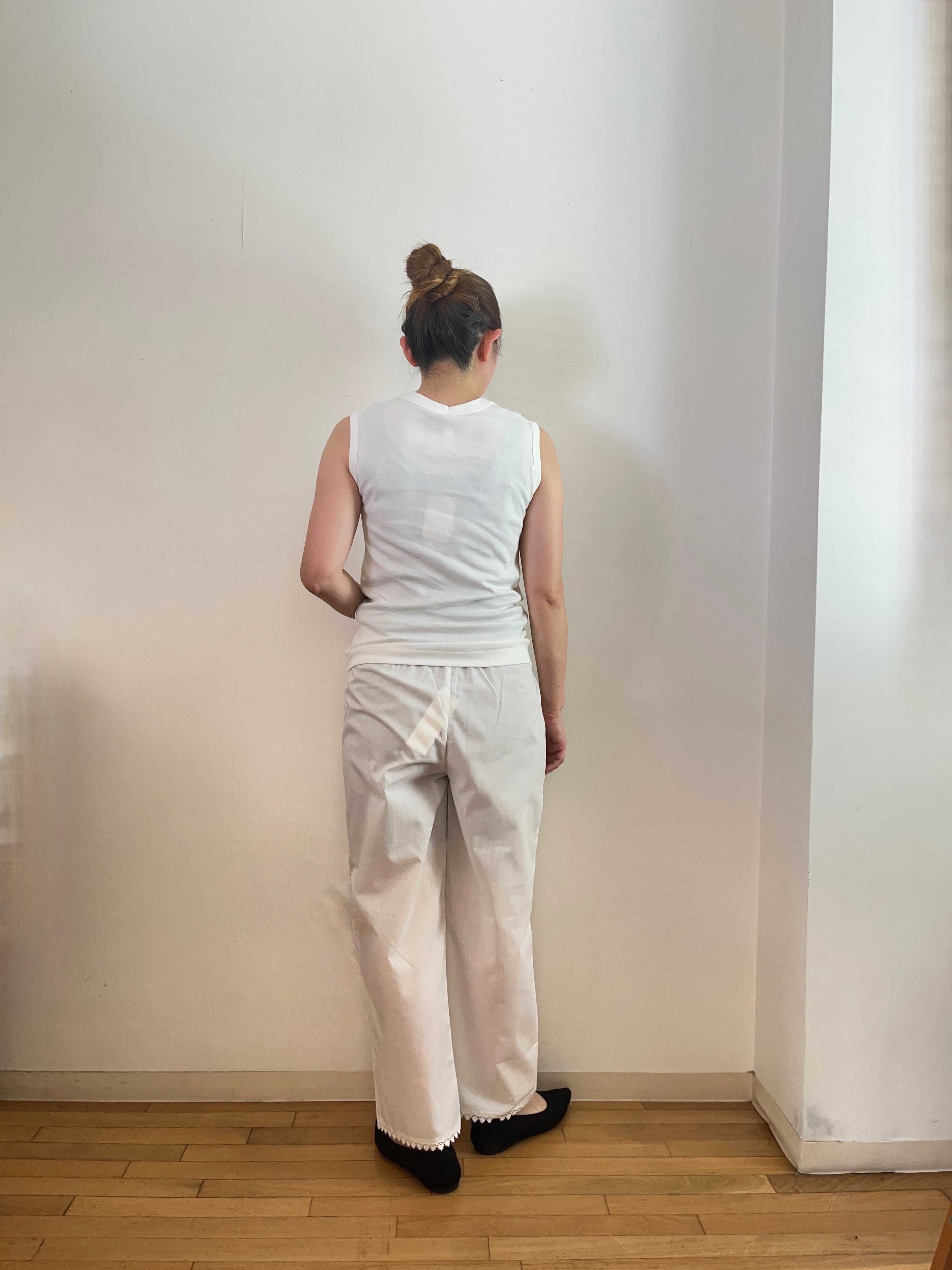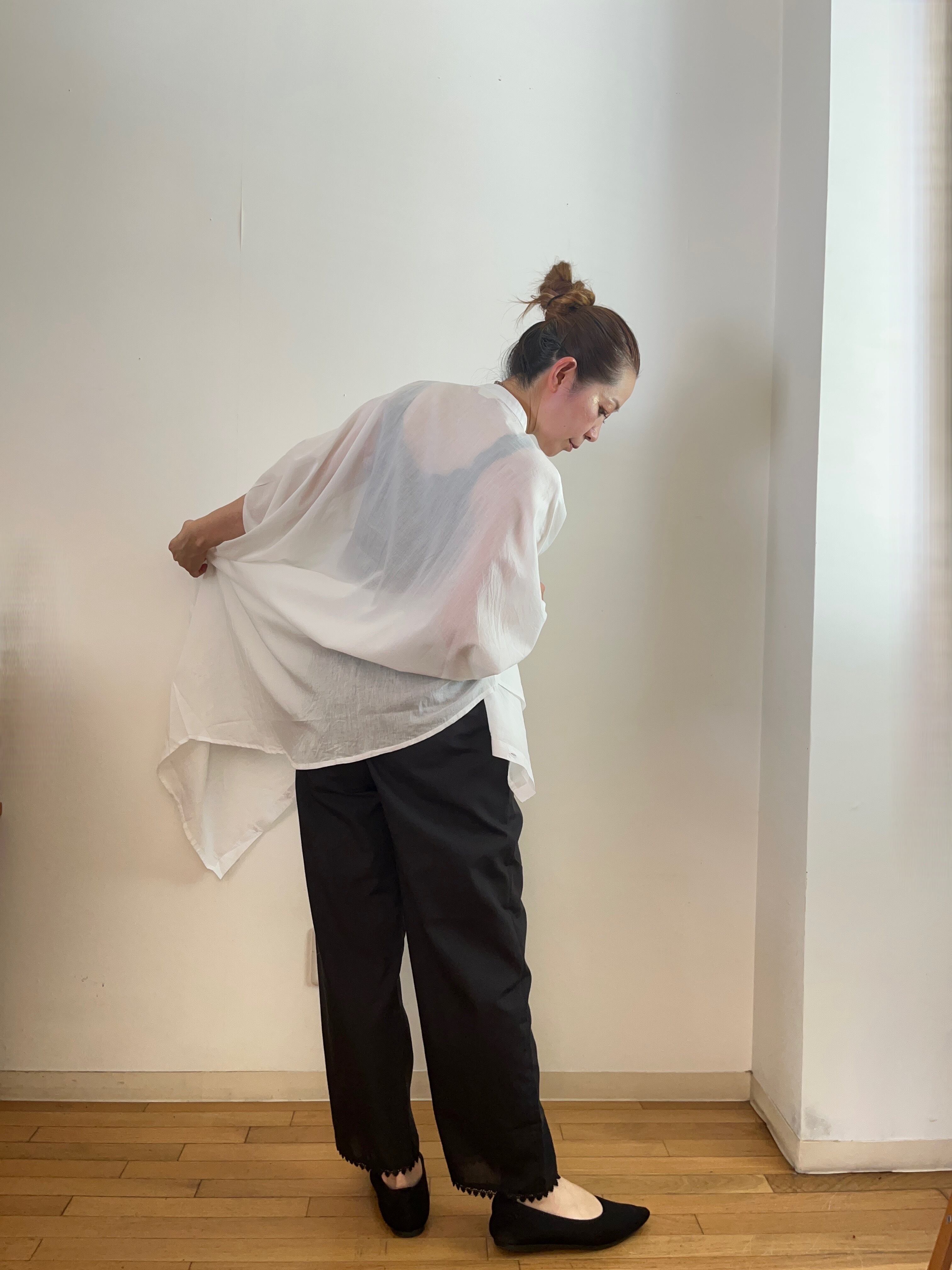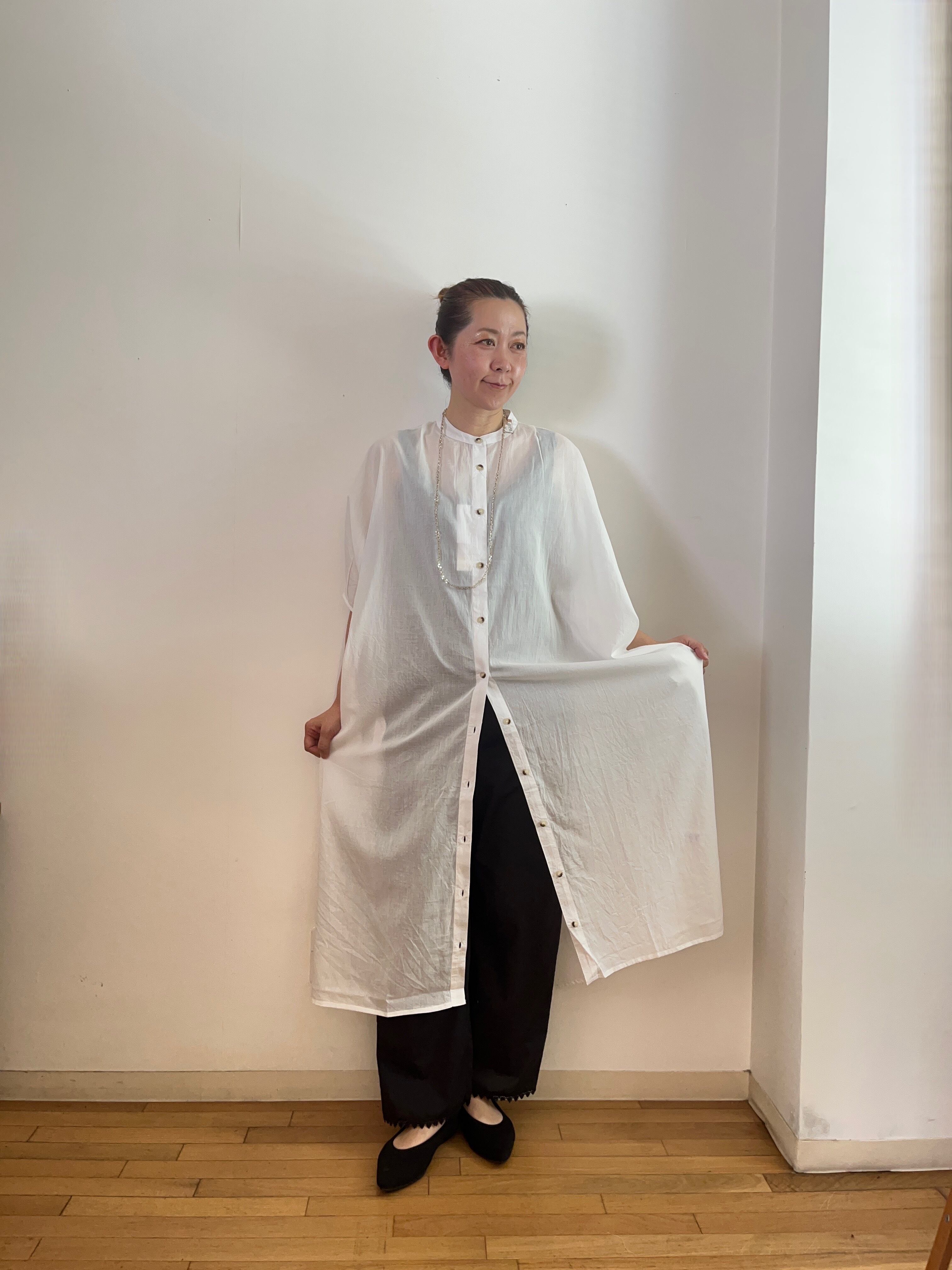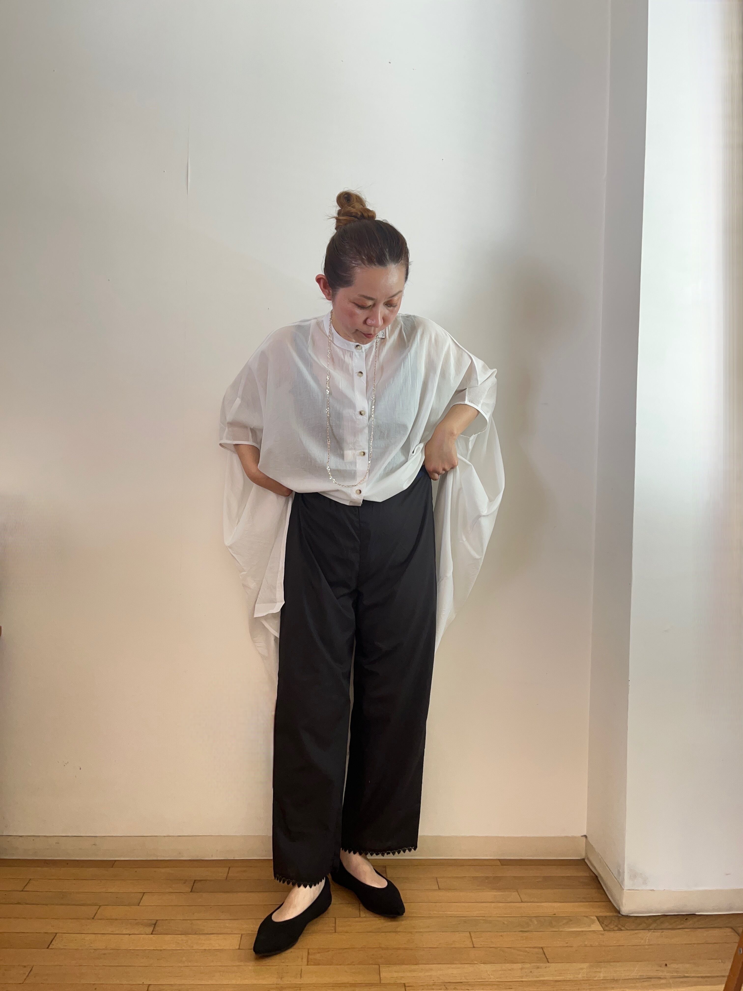 繊細な刺繍が施された裾と柔らかな素材感が特徴で、シンプルながらも印象的なスタイルを演出します。軽やかで快適な着心地は、日常のコーディネートをより一層楽しませてくれる一着です。