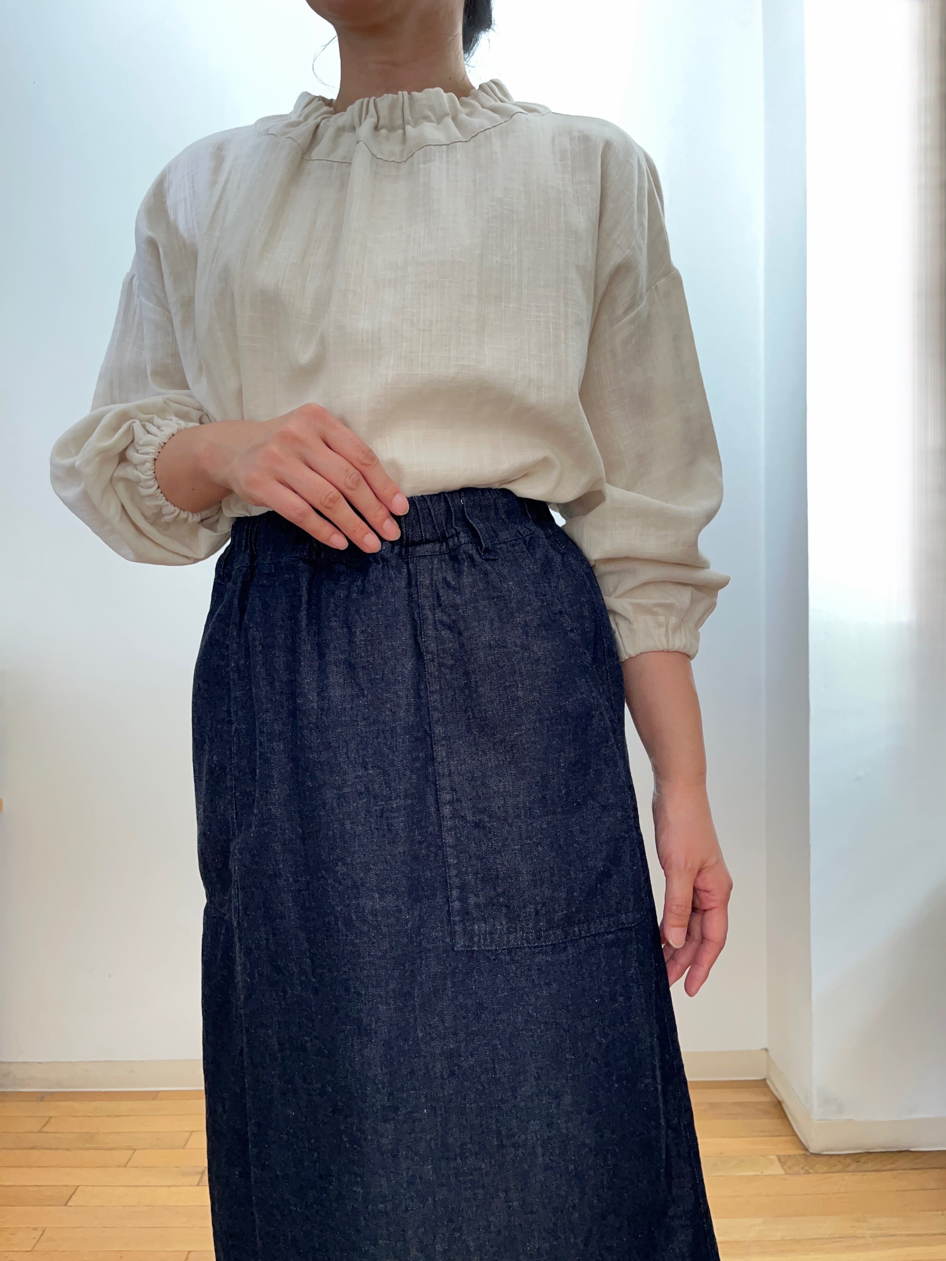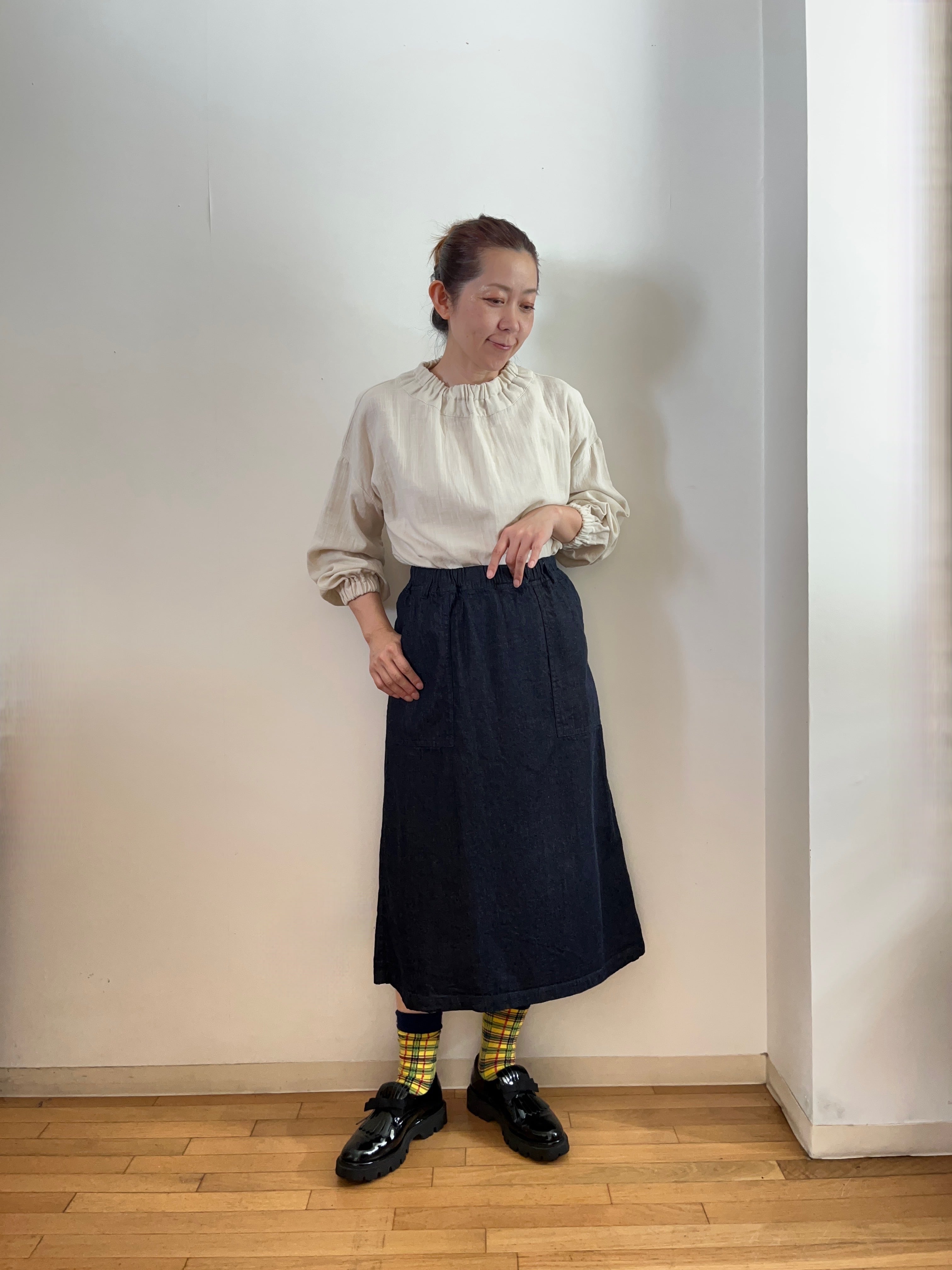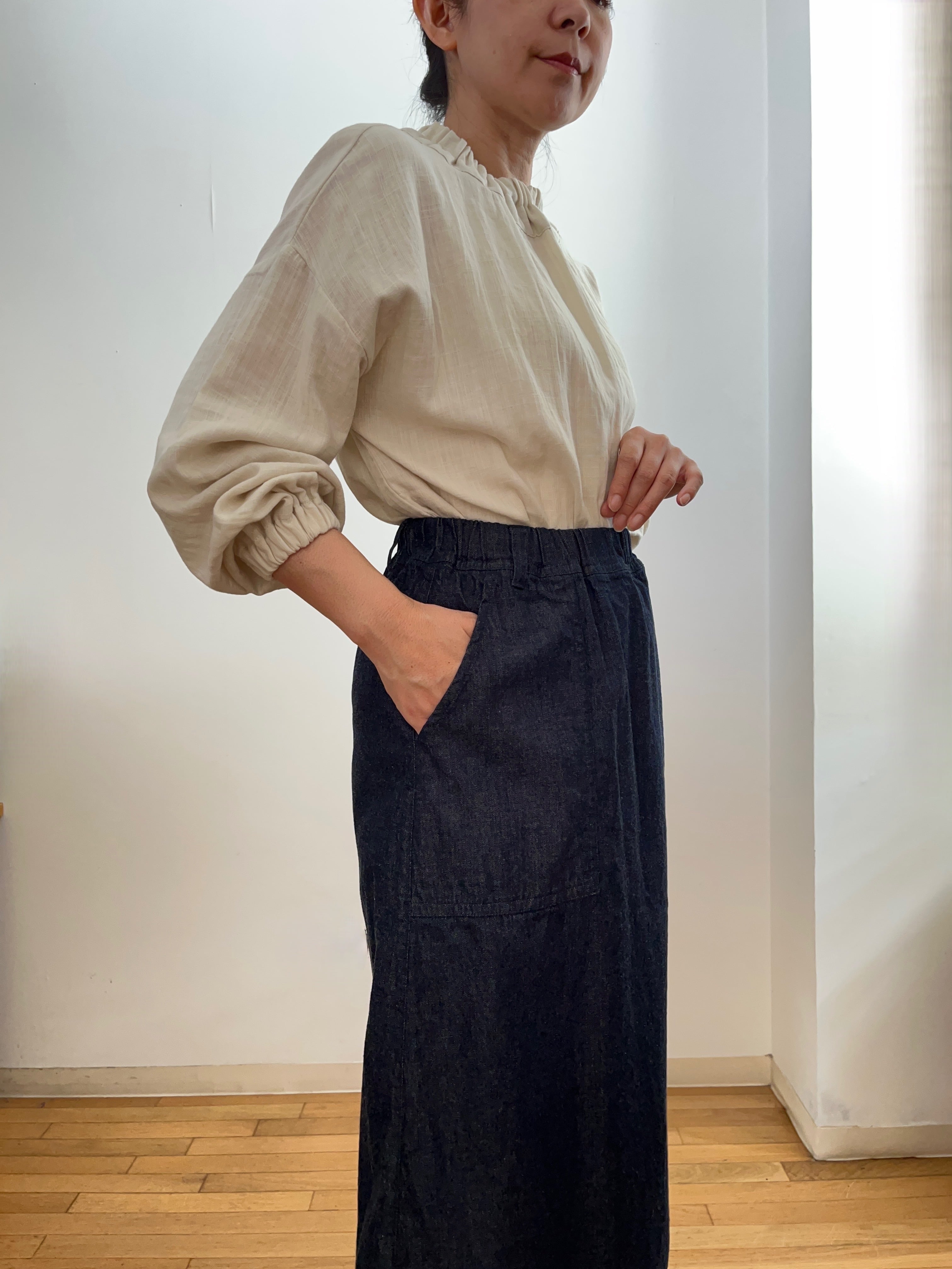 このスカートは、ウエストが総ゴム仕様になっており、ストレスフリーな着心地を実現しています。デニム素材の持つしっかりとした風合いと、シンプルでありながら洗練されたデザインが特徴で、様々なスタイルに合わせやすいアイテムです!