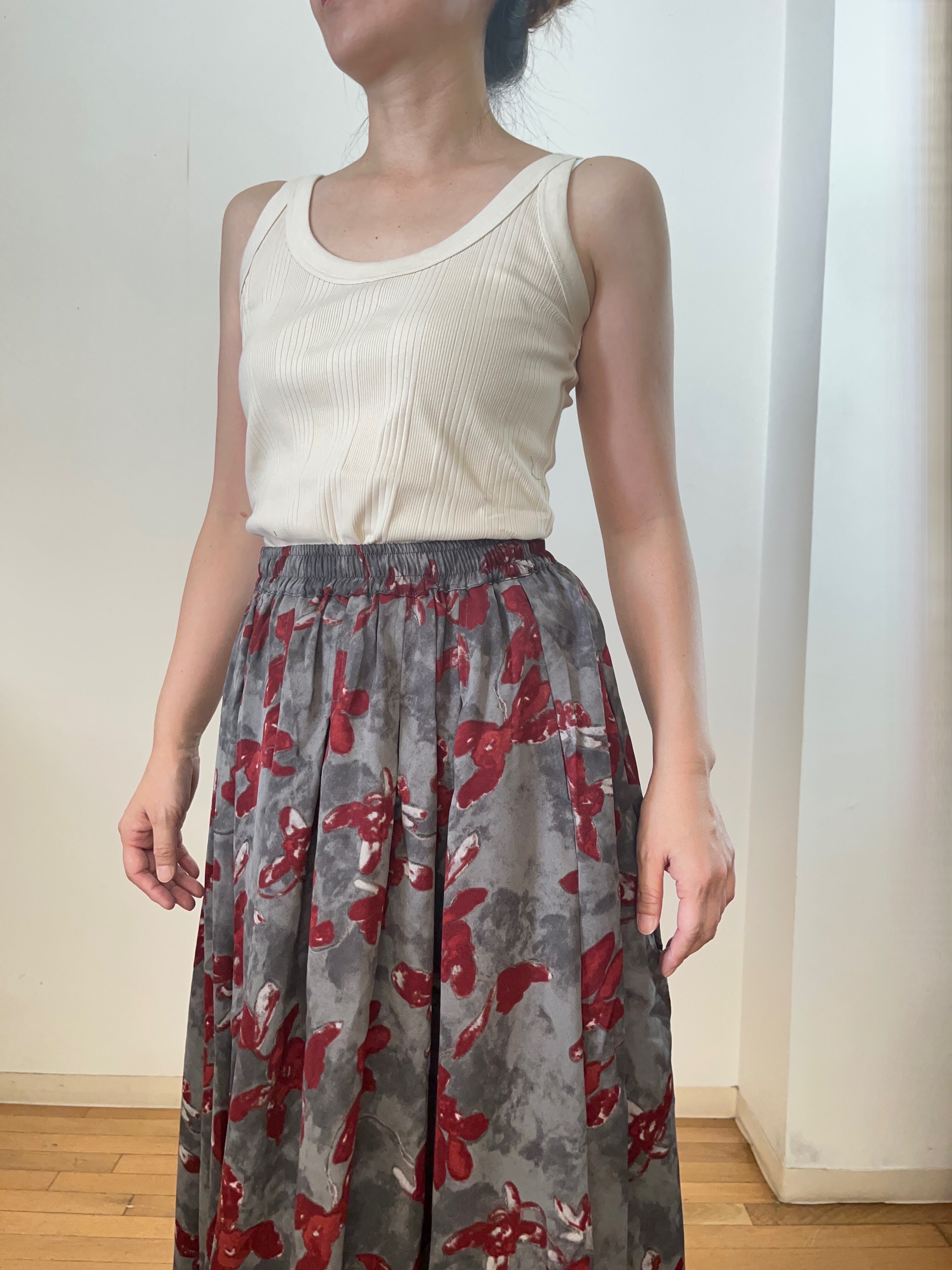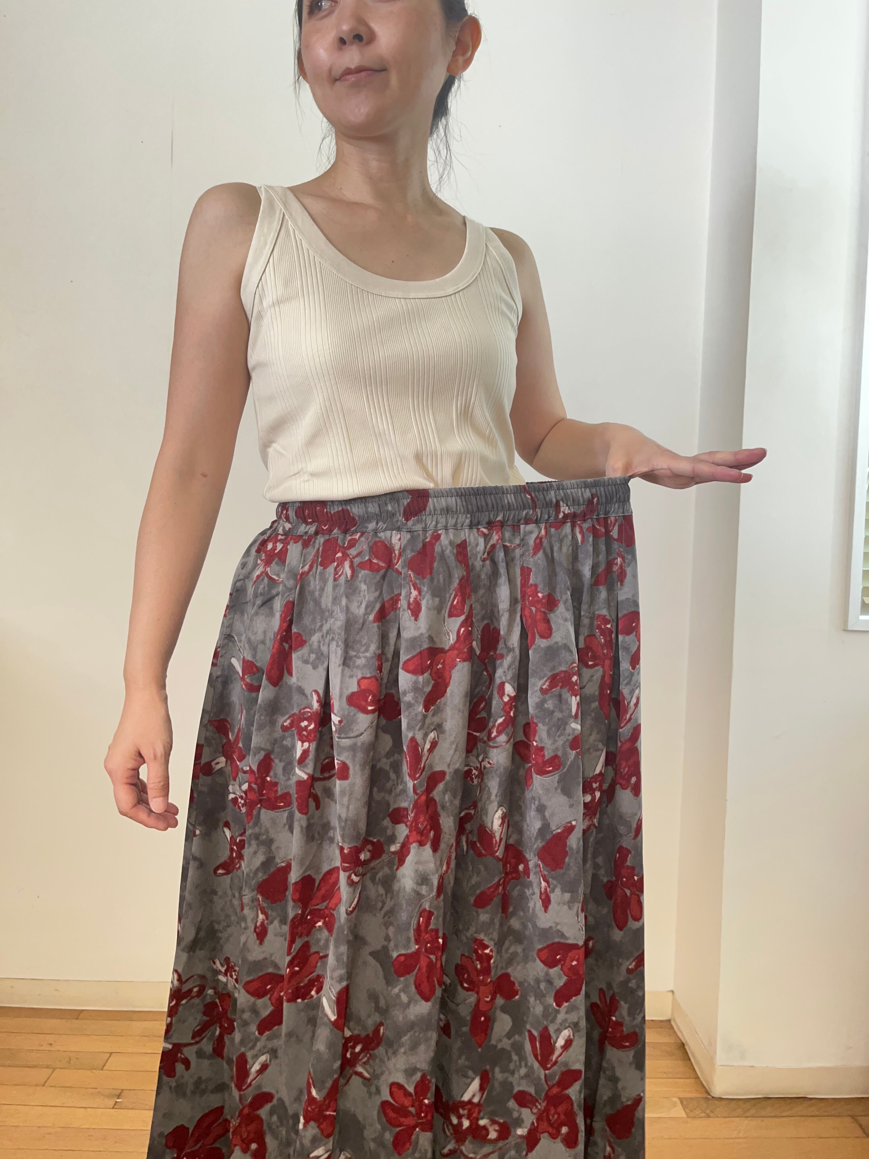 このスカートは、ウエストにゴム紐を使用しており、ストレスフリーな着心地を実現しています。グレーとレッドの2色使いで、花柄が大人っぽさを引き立てつつ、シンプルなトップスと合わせることでスタイリッシュなコーディネートが楽しめ、日常使いから特別なお出かけまで幅広く活躍します!