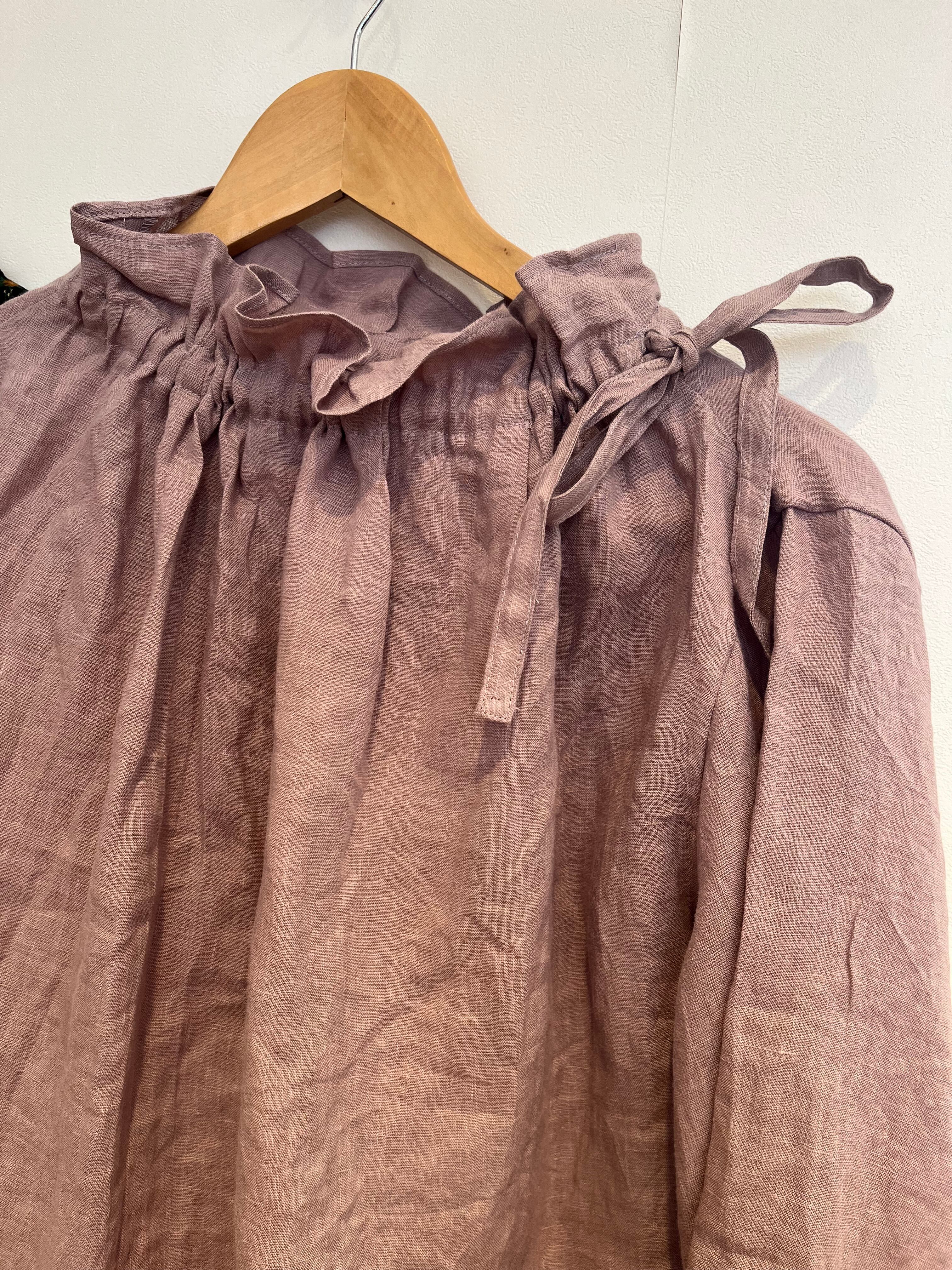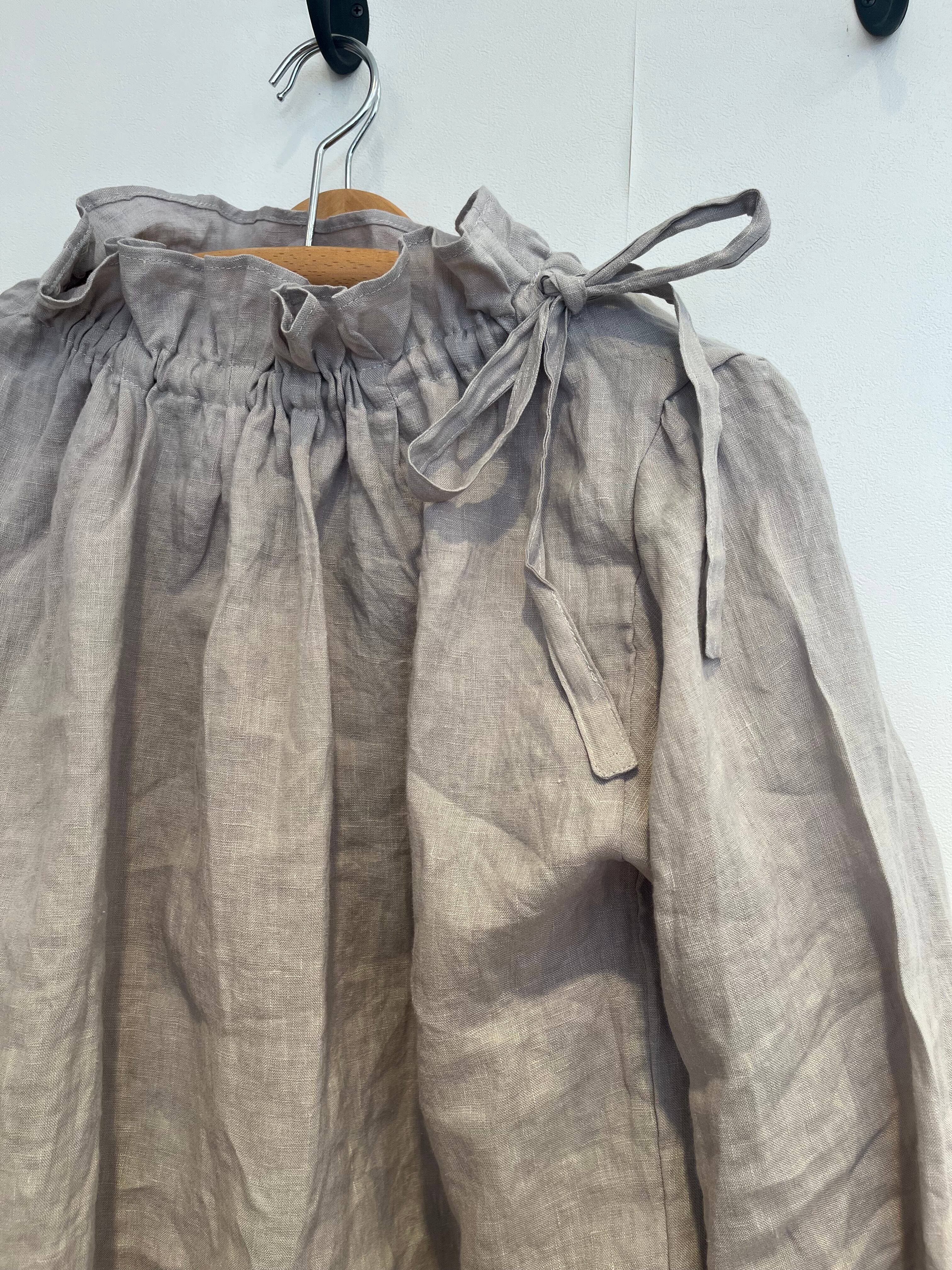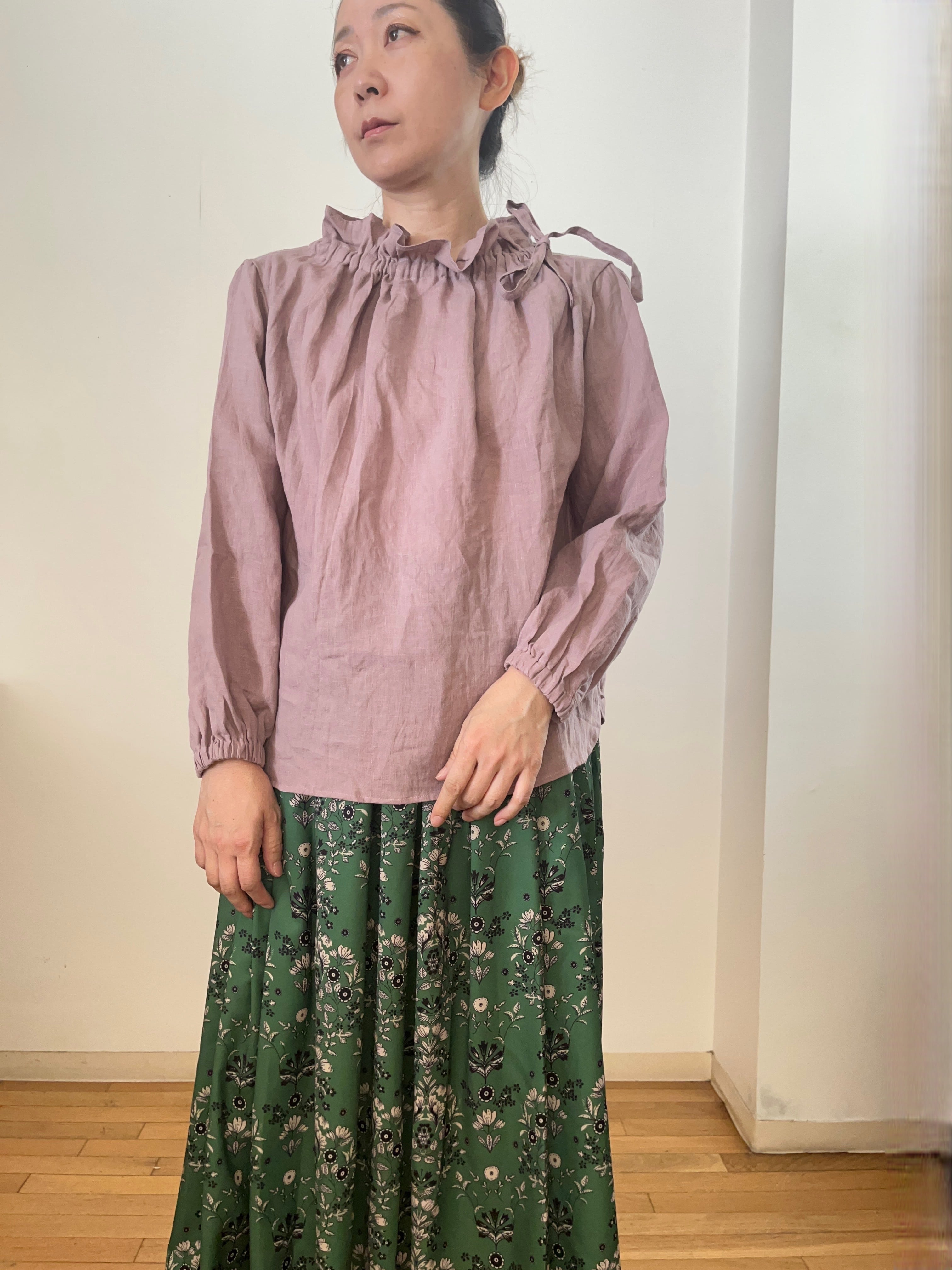 このブラウスは襟元に結びリボンが施されており、華やかさと上品さを兼ね備えています。襟の開きはリボンの結びで調節可能です。柔らかなリネン素材が心地よい肌触りを実現し、カジュアルなデニムやスカートと合わせることで、普段使いから特別なお出かけまで幅広く活躍します!