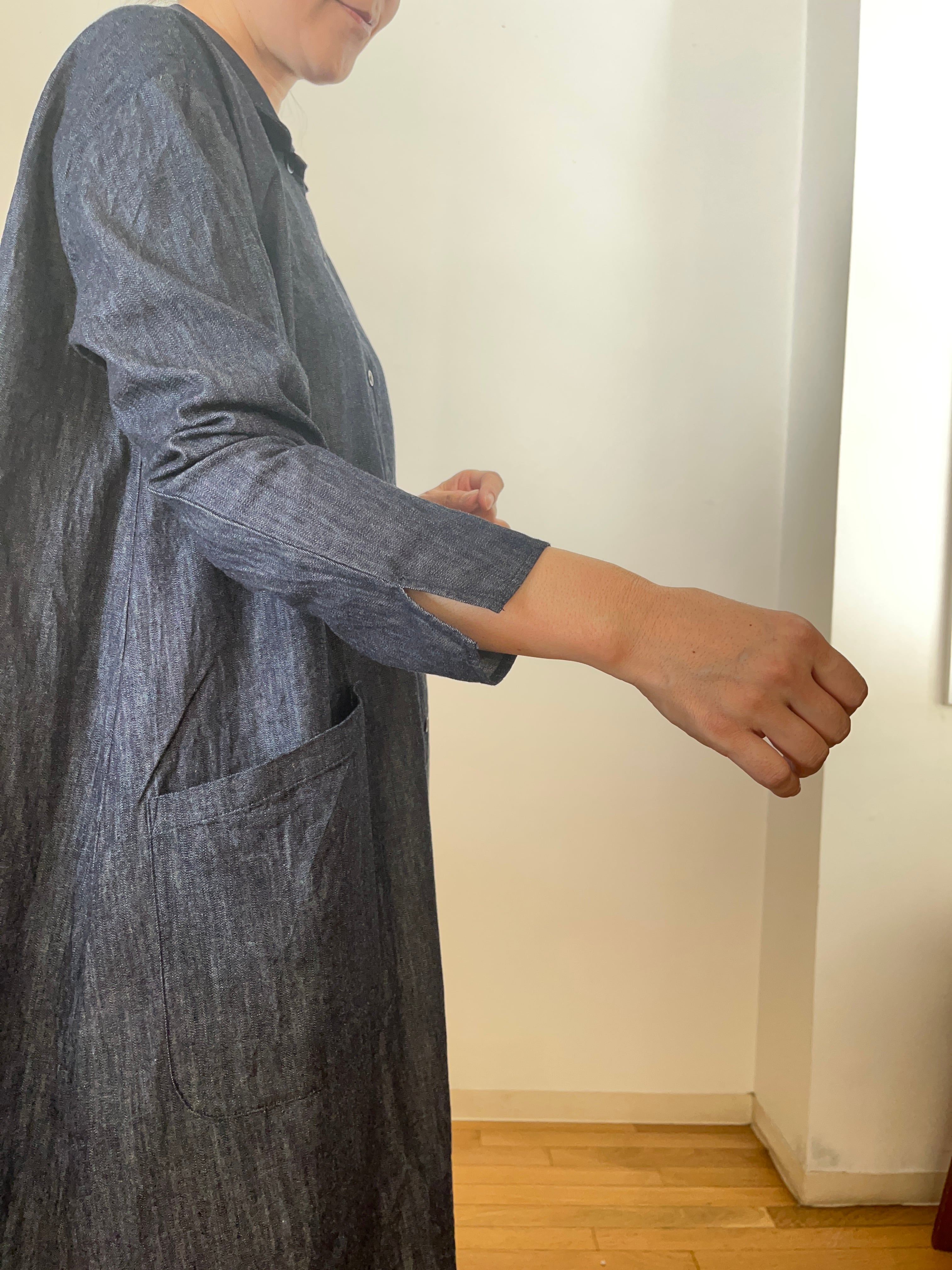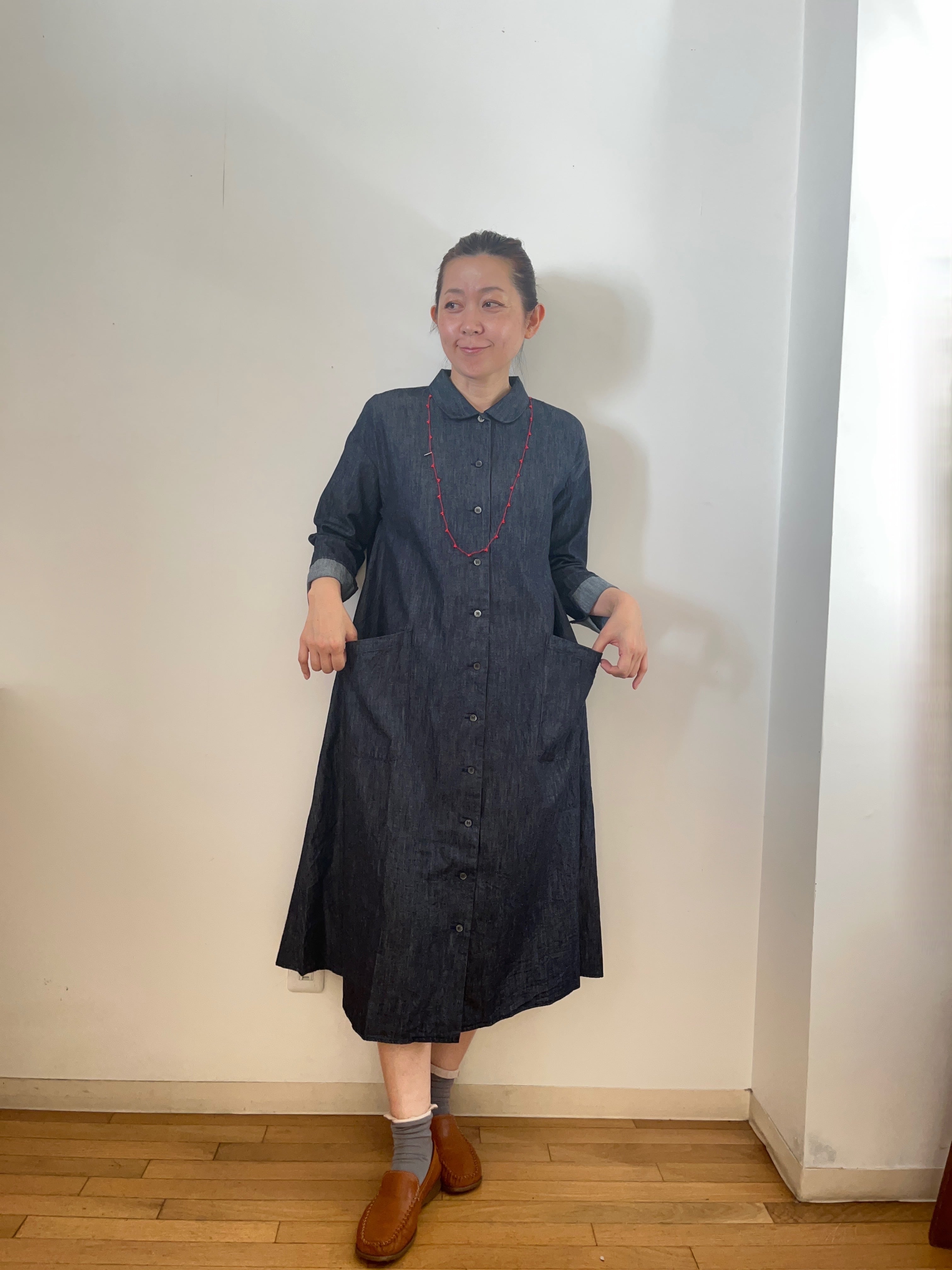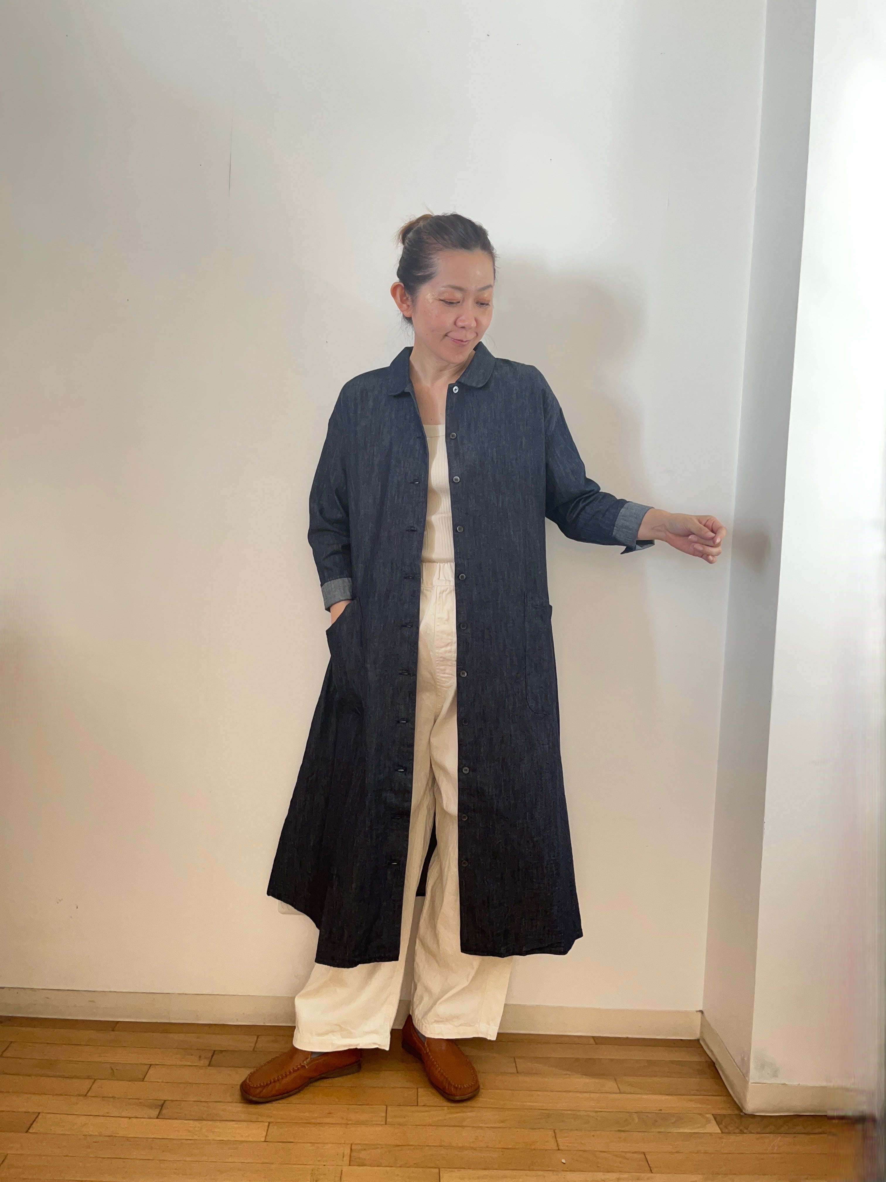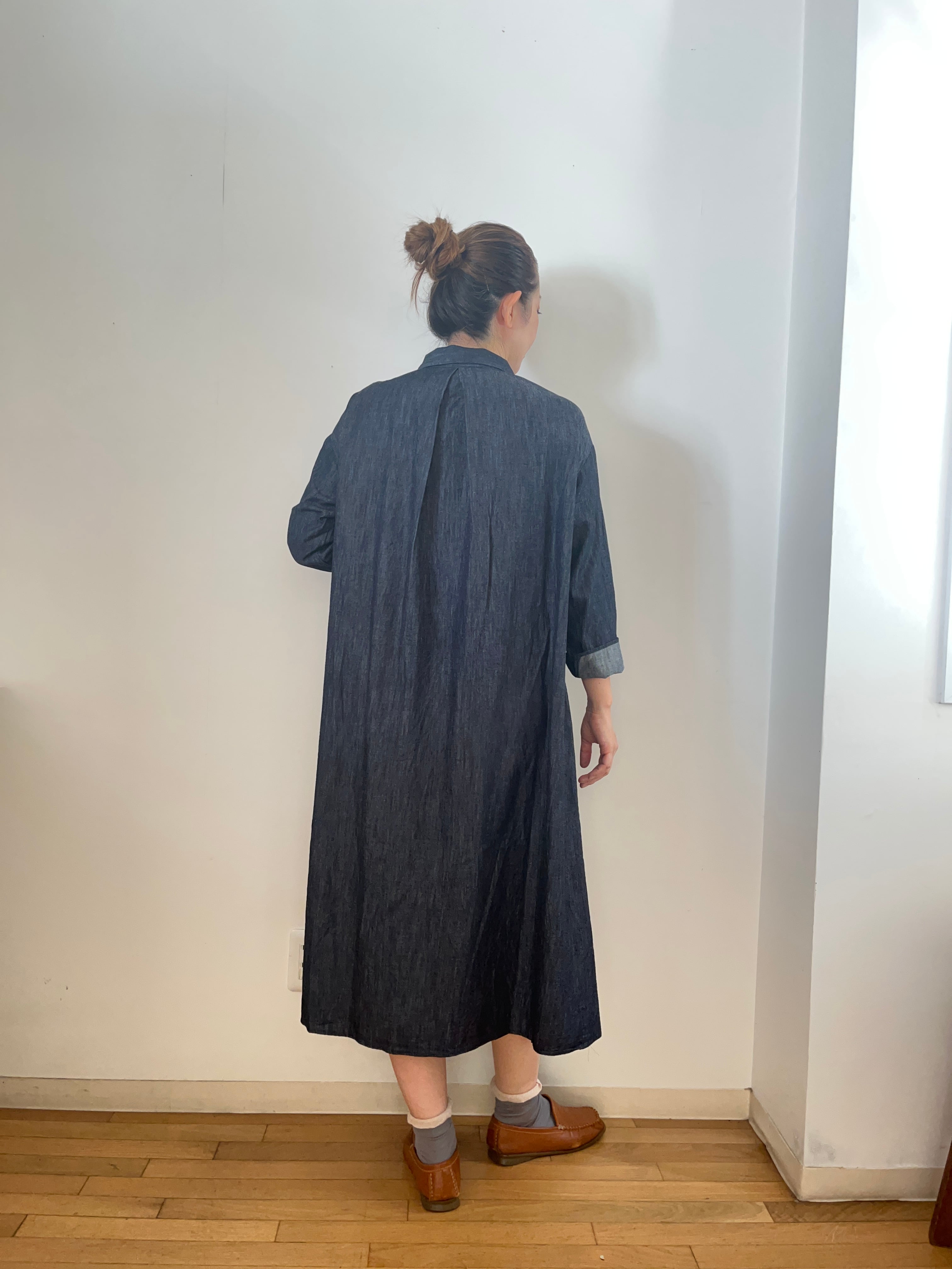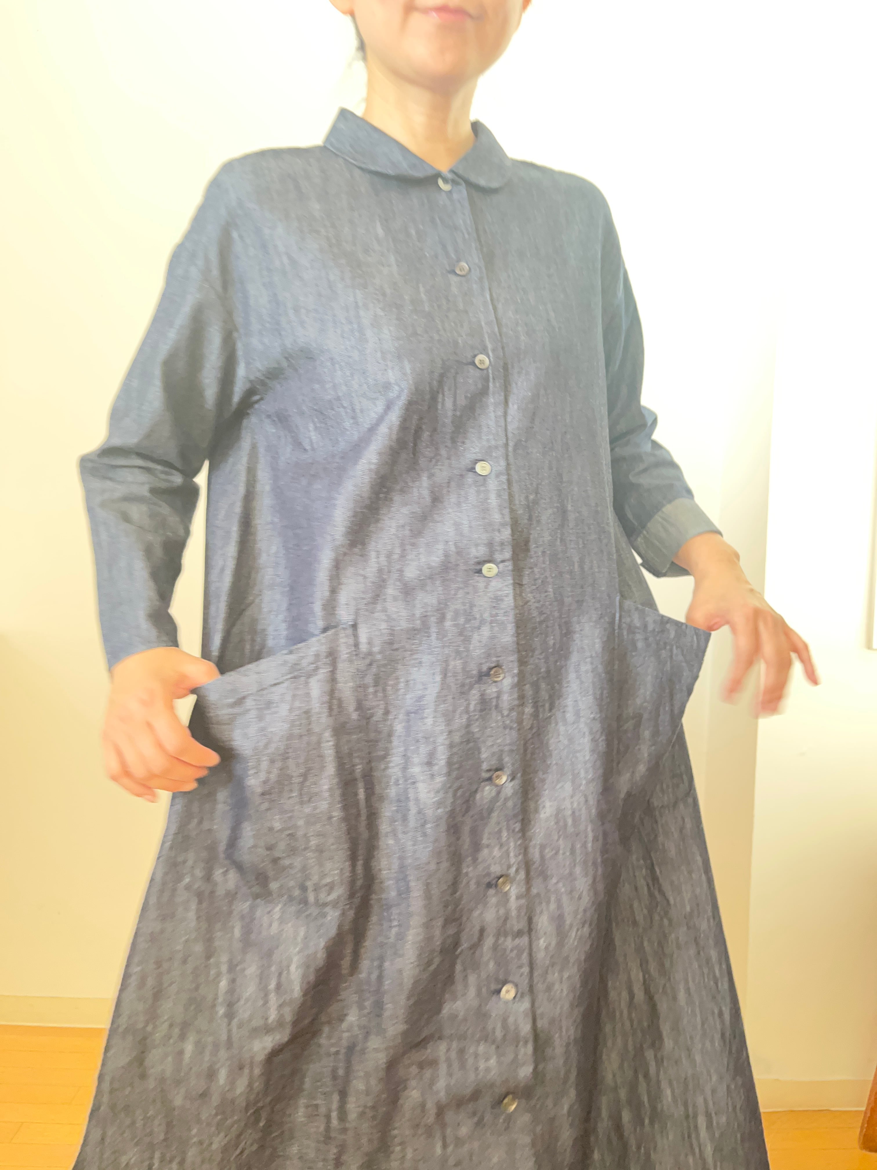 このワンピースは、カジュアルなデニム素材でありながら、シンプルなデザインが魅力です。前を開けて羽織ればコーディネートの幅がひろがり大活躍します!