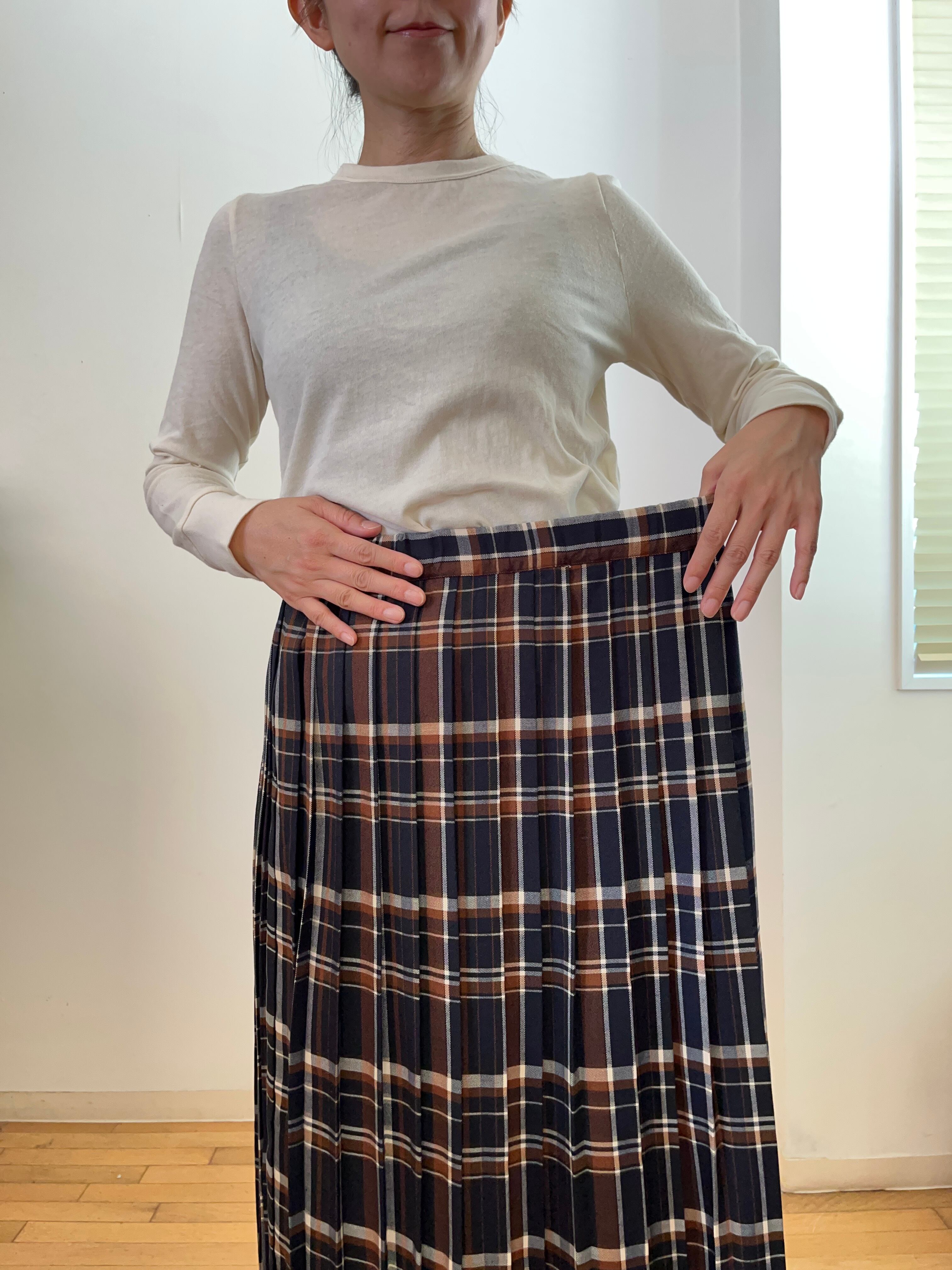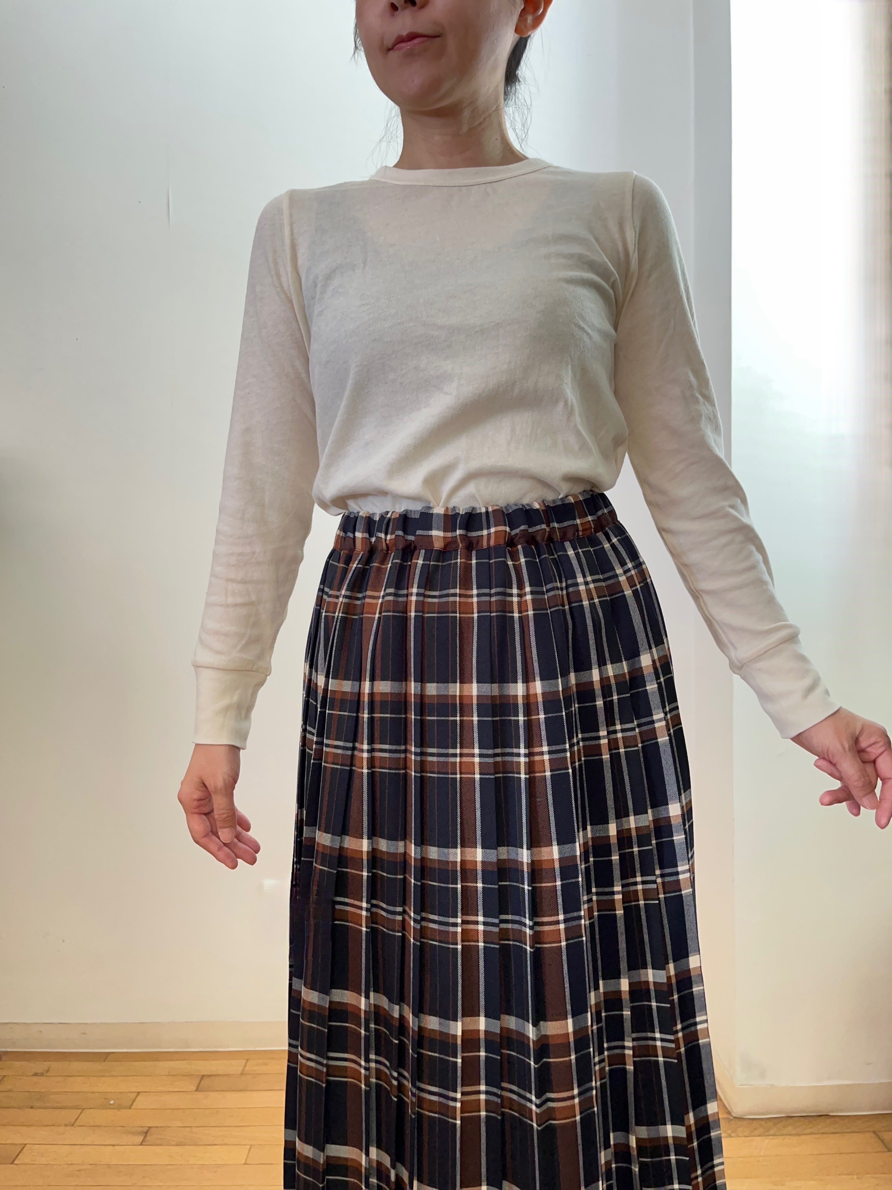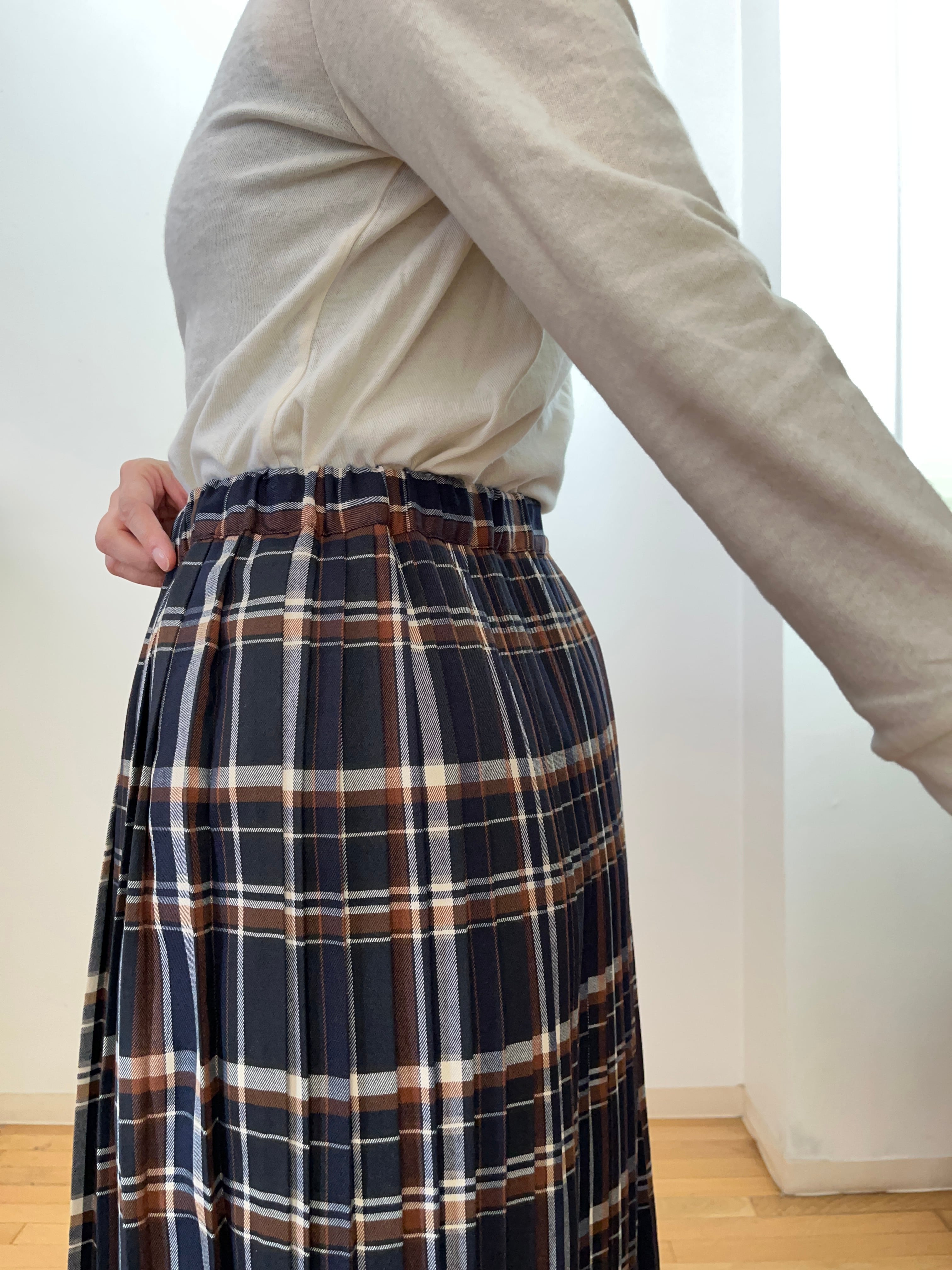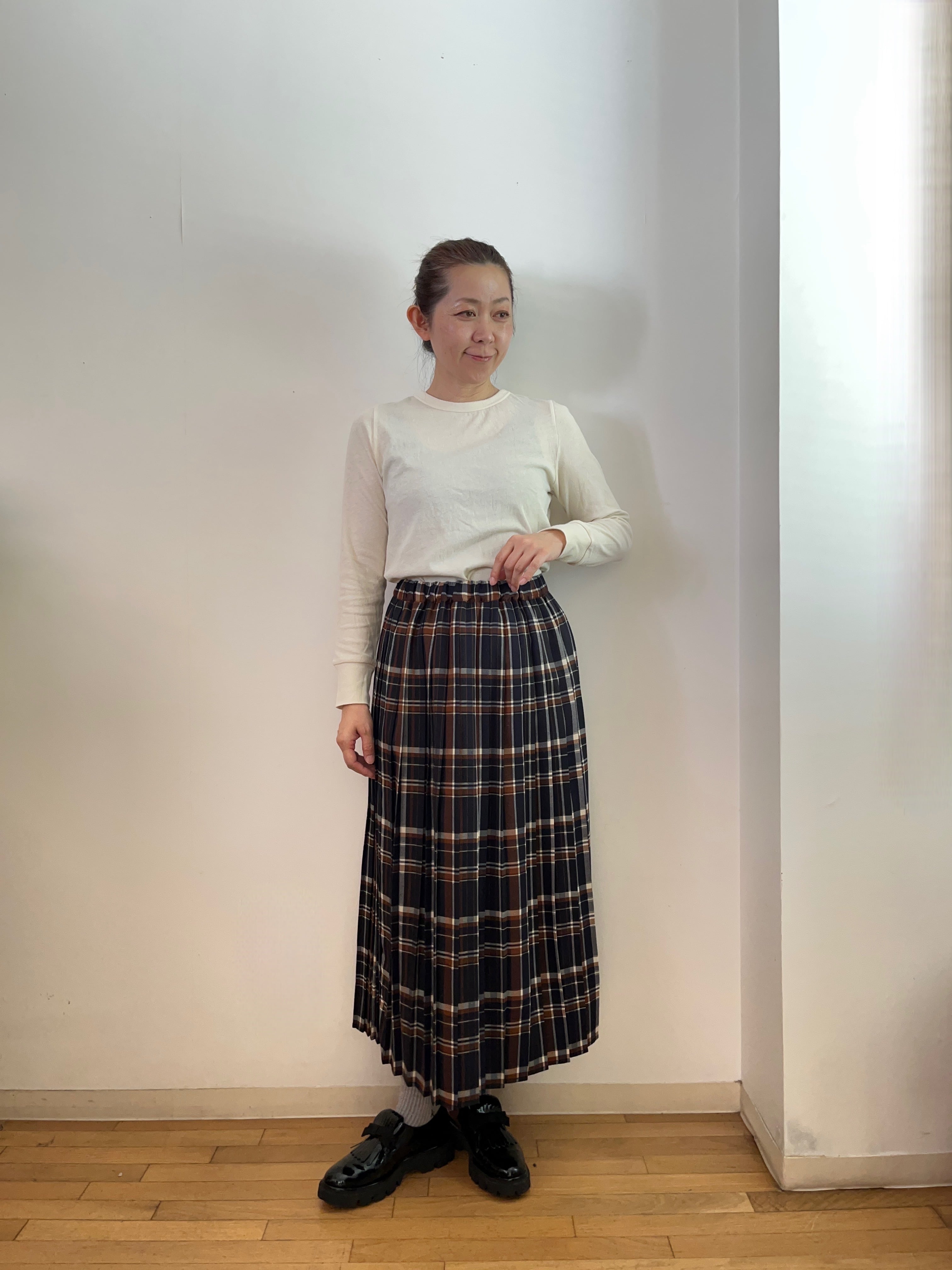 前後でプリーツの幅が違い、控えめな中に個性の光るスカートです。