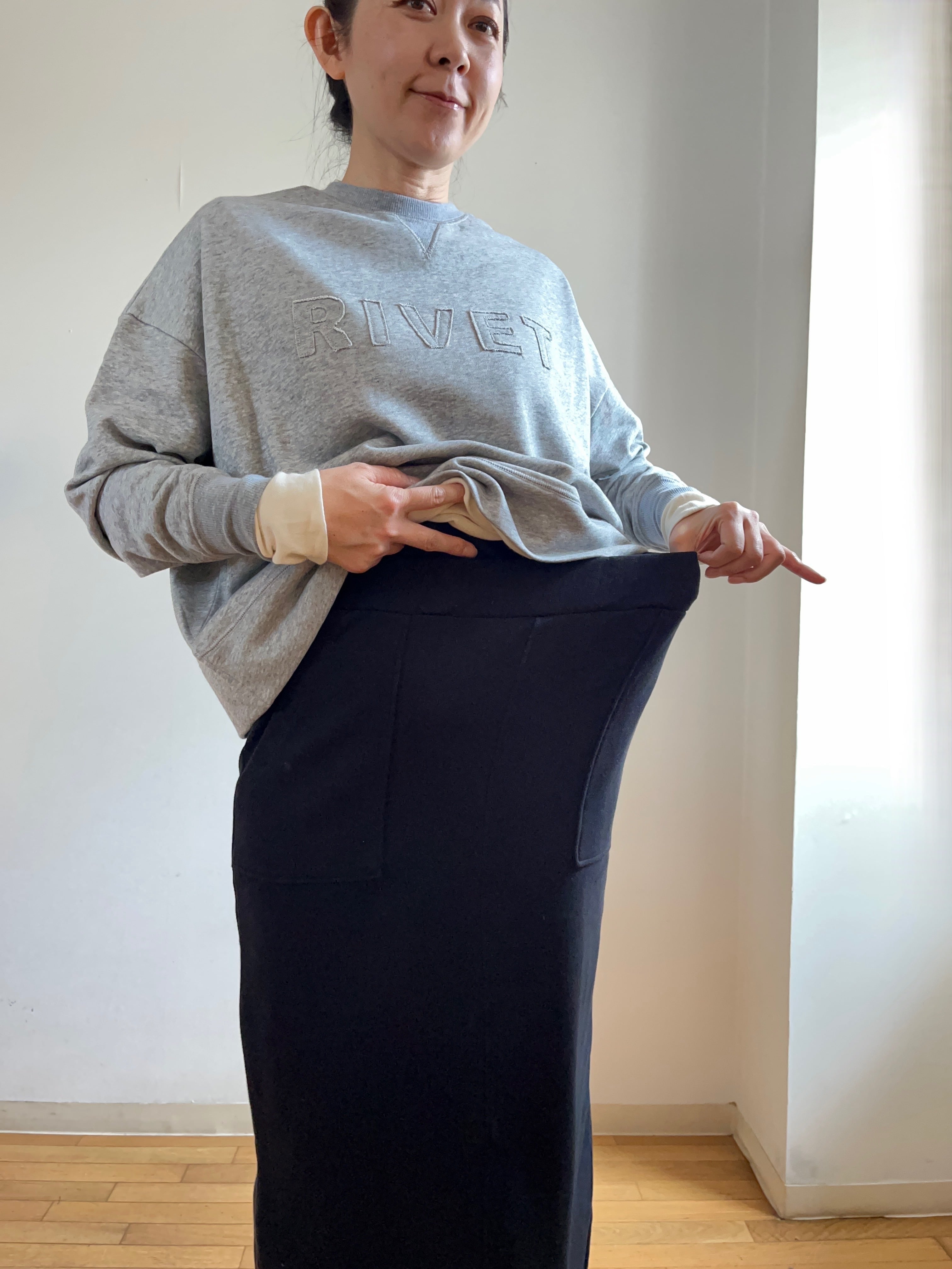 このダンボールニット素材を使用したベイカースカートは、程よい厚みと柔らかさ、伸縮性が特徴で、動きやすく、着心地の良さは抜群です。