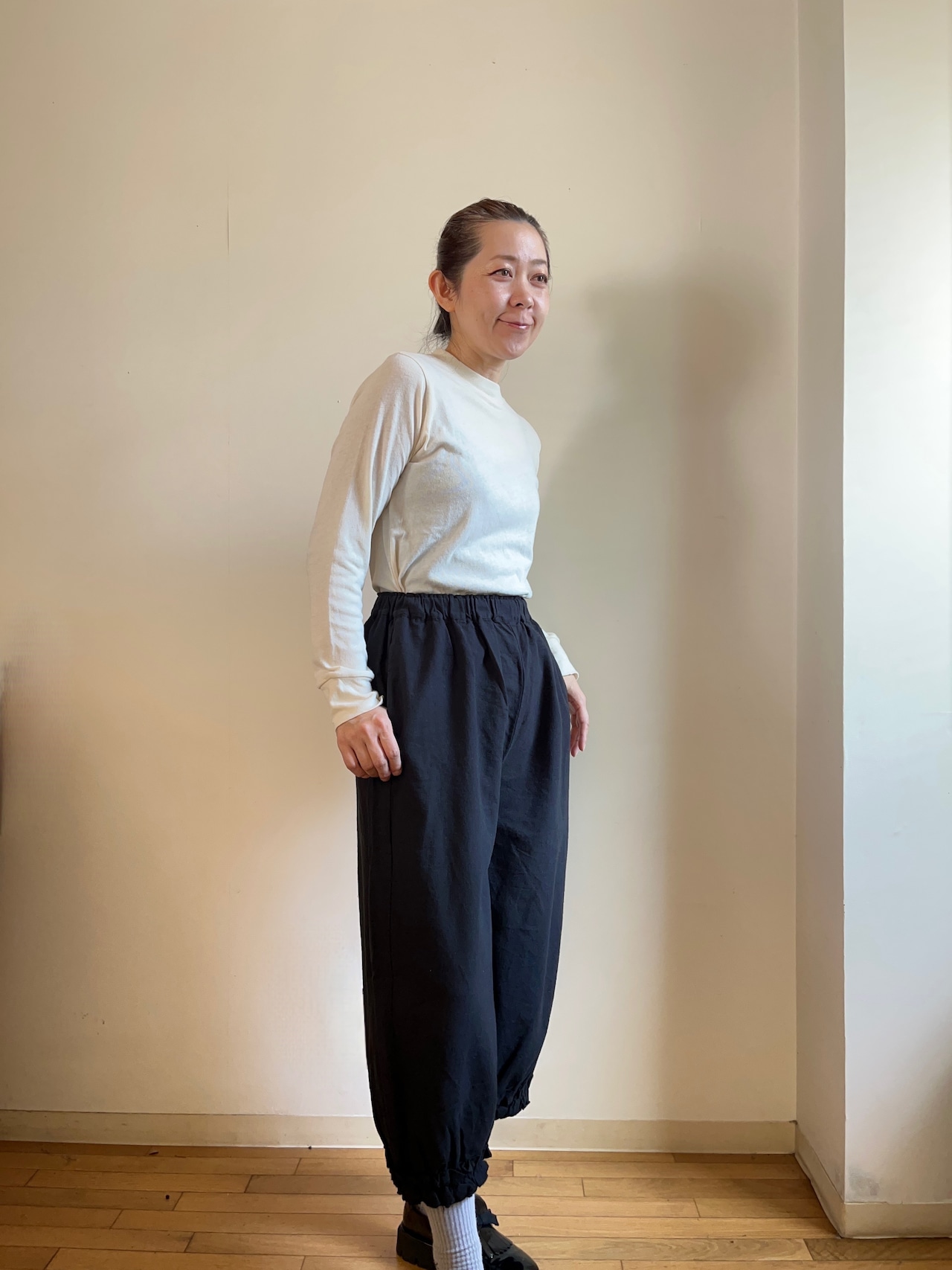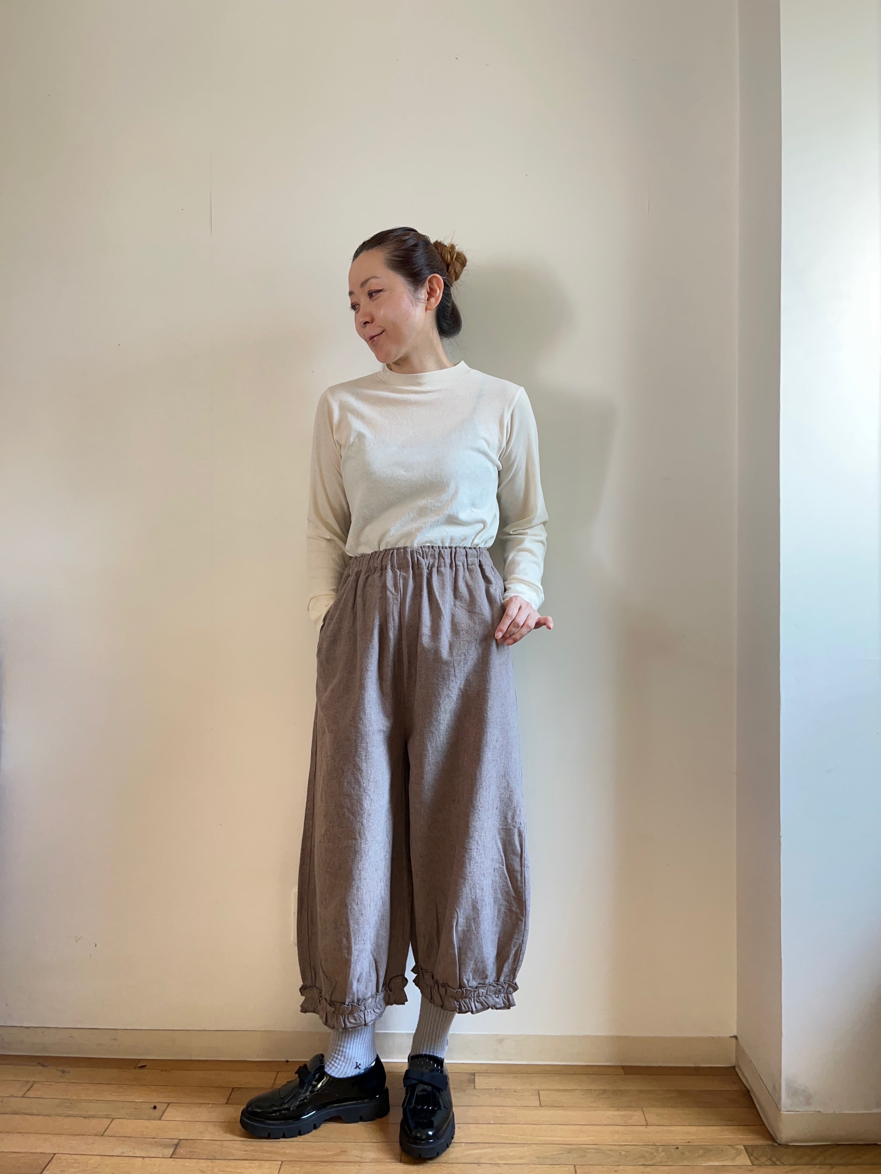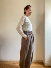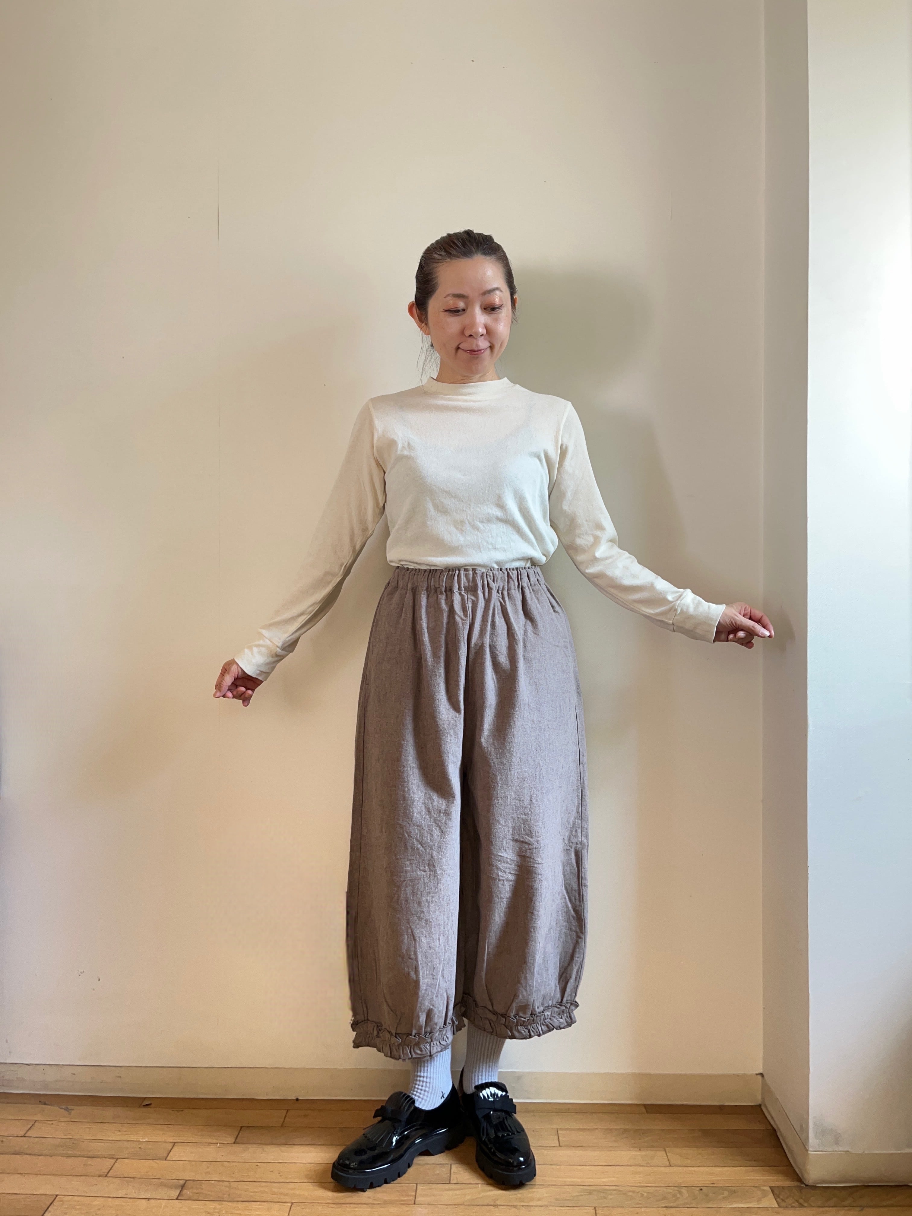 ウエスト部分はゴム仕様で、心地よいフィット感があります。裾フリルが加わることで、シンプルながらも洒落たスタイルを演出します。リラックスしたい日や、少しおしゃれをしたい日にも幅広く活躍するパンツです。
