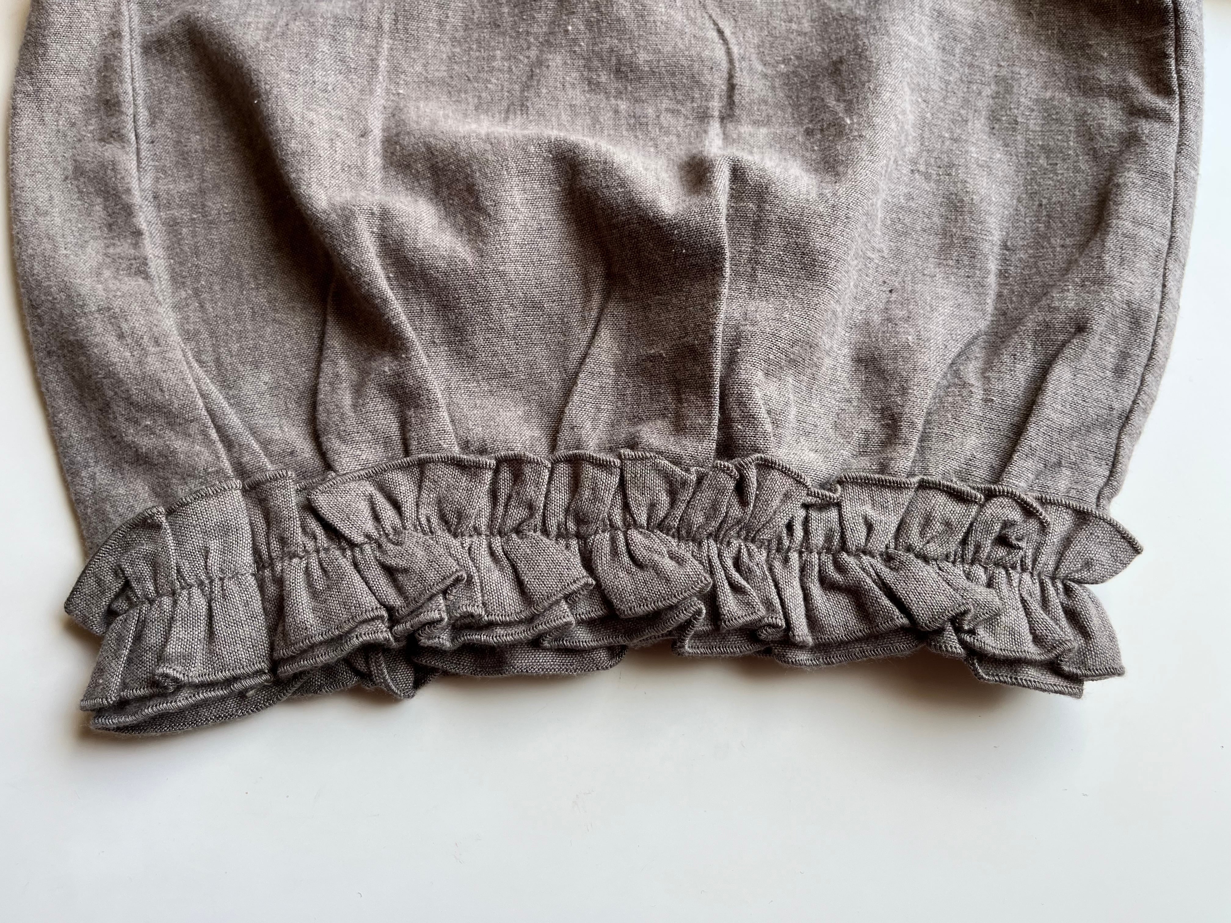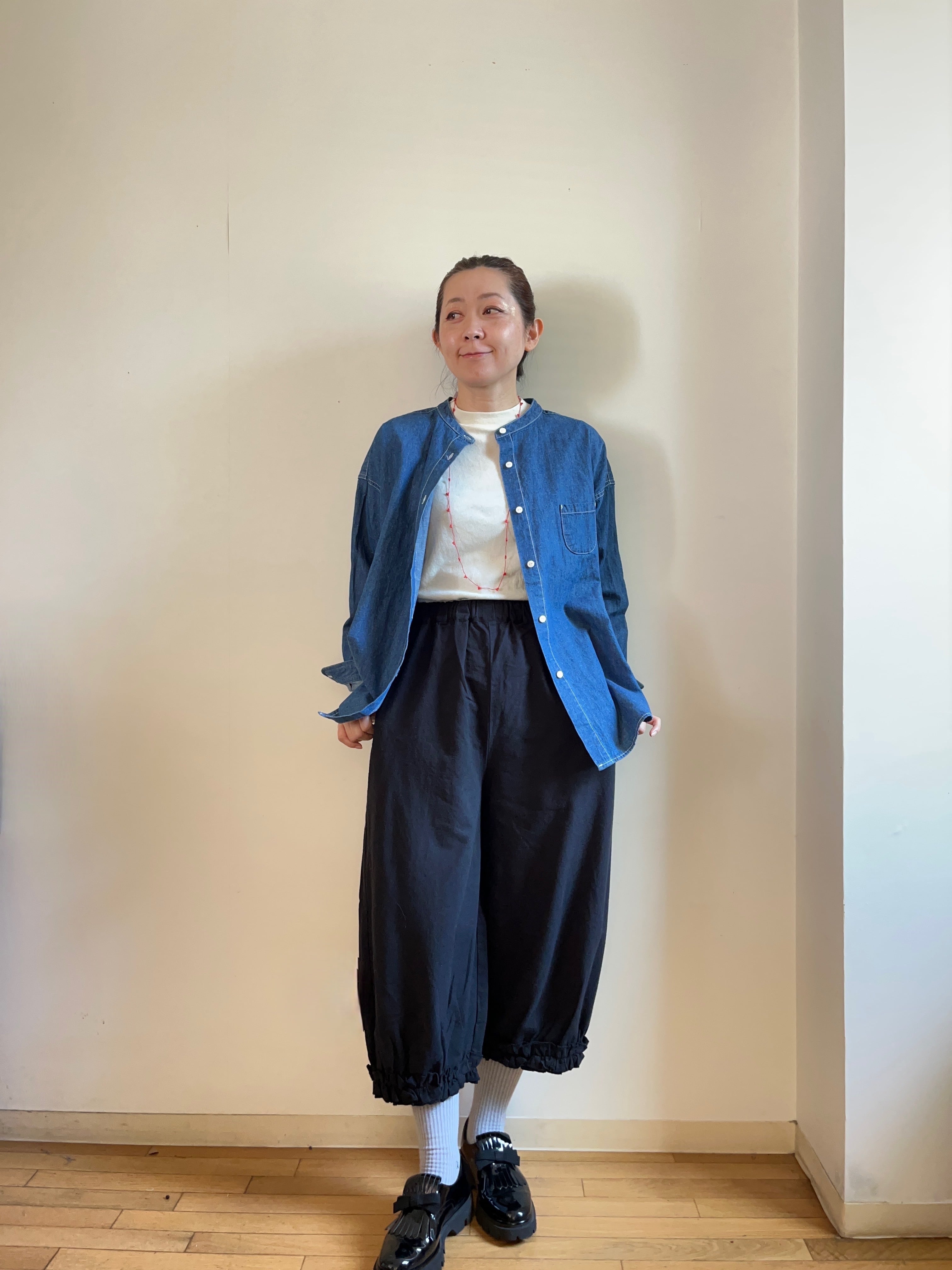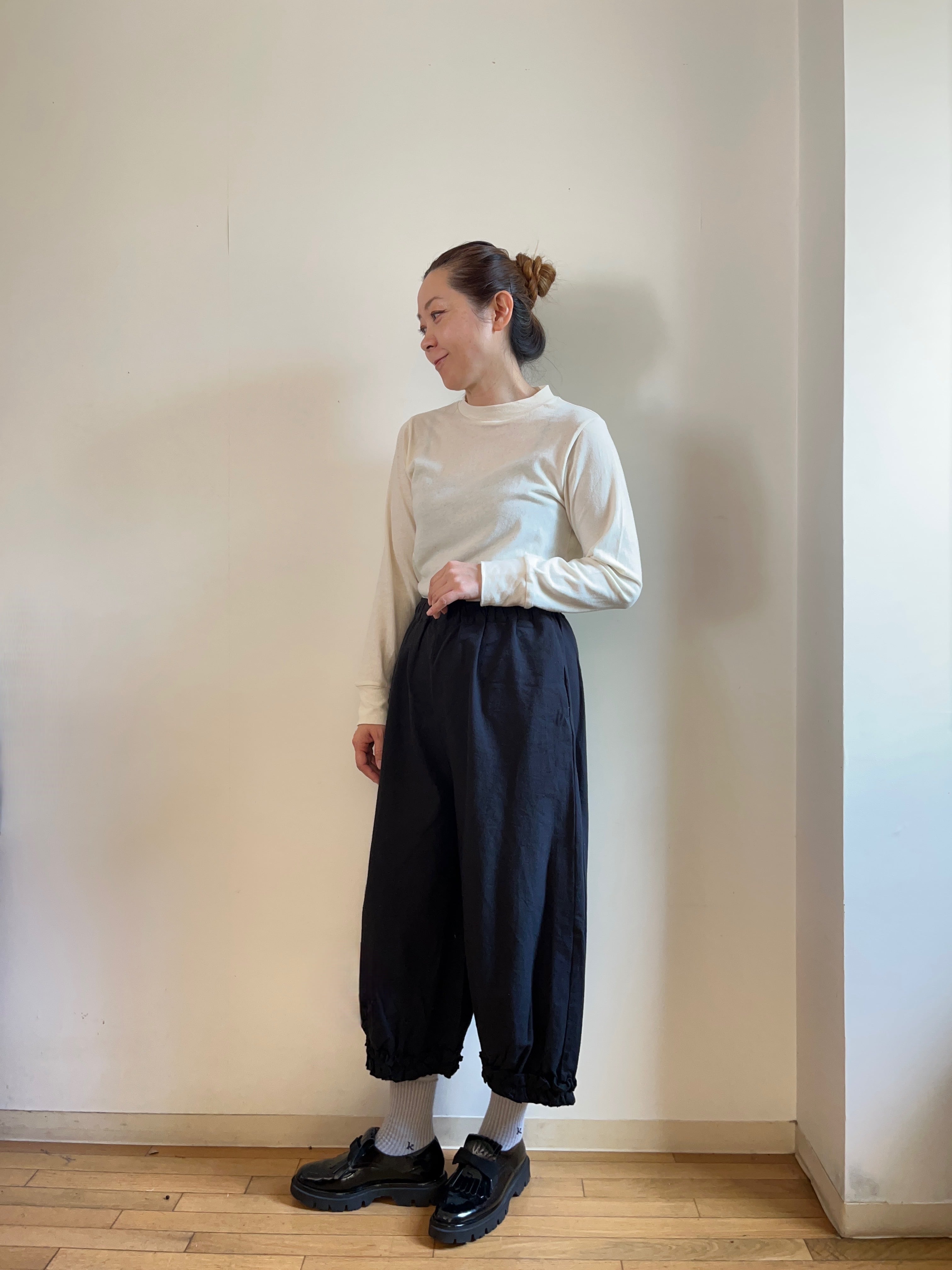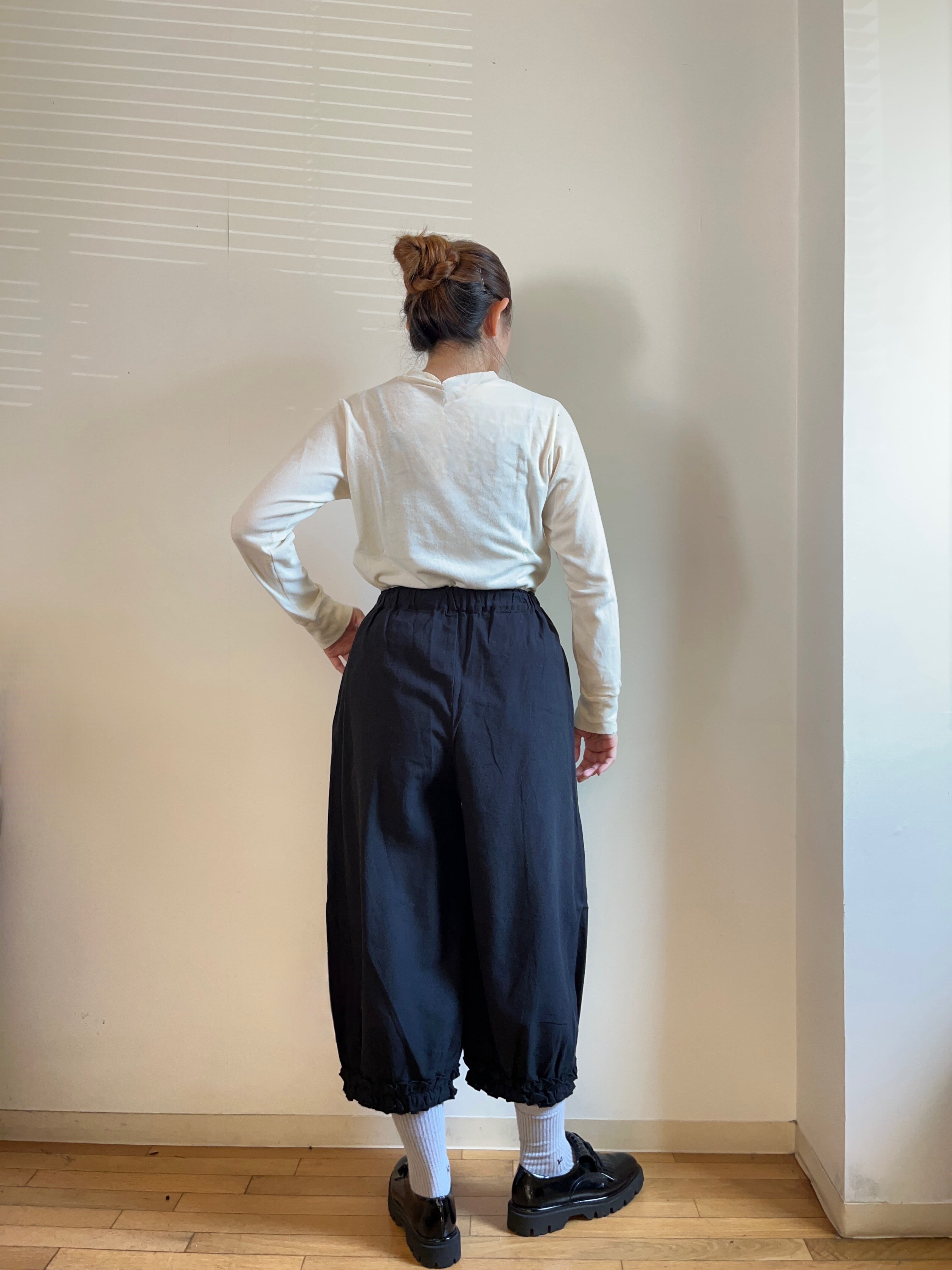 ウエスト部分はゴム仕様で、心地よいフィット感があります。裾フリルが加わることで、シンプルながらも洒落たスタイルを演出します。リラックスしたい日や、少しおしゃれをしたい日にも幅広く活躍するパンツです。