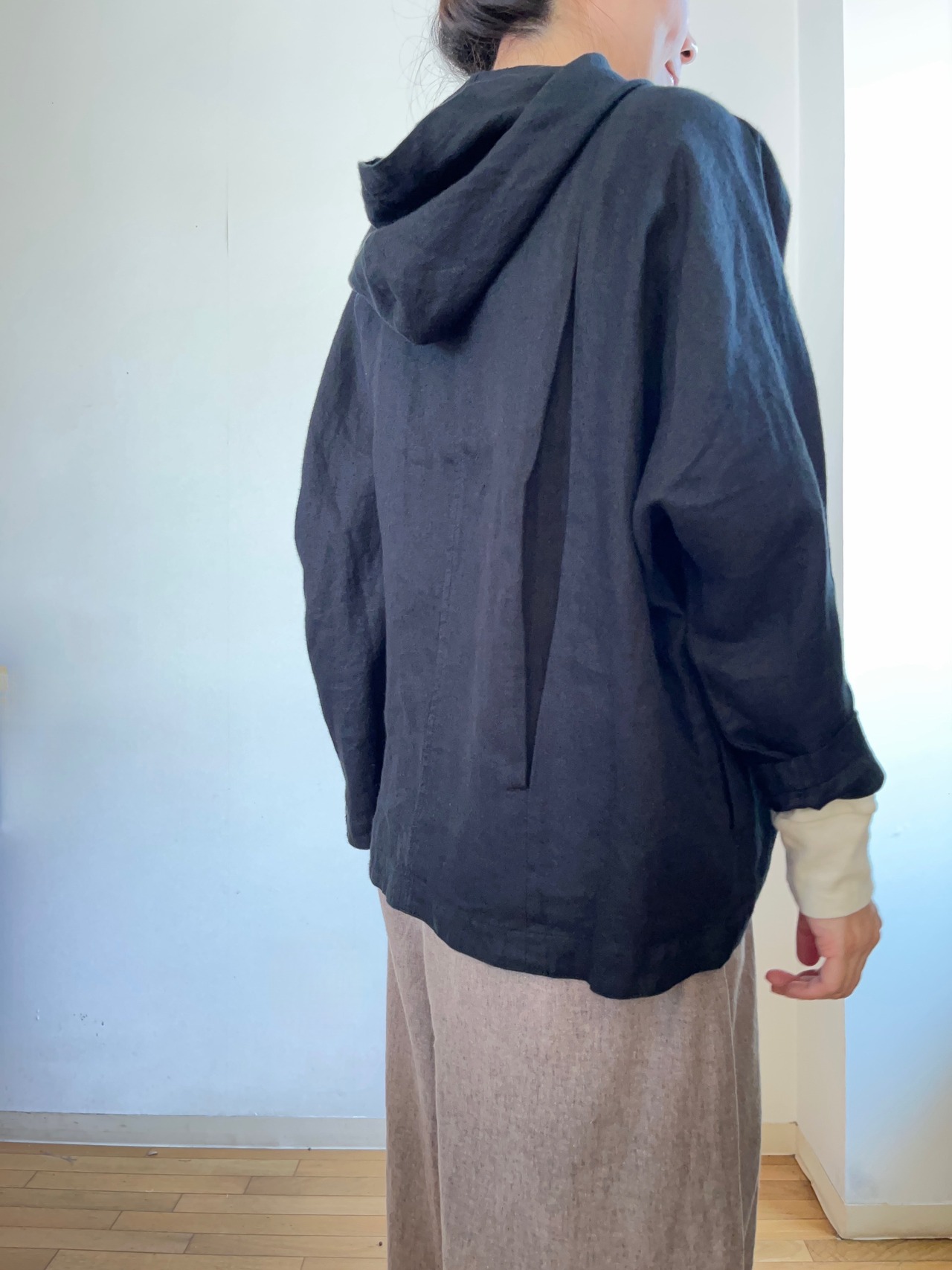 フード付きのデザインにより、機能性も考慮されています。寒い日には暖かさを提供しつつ、どんなコーディネートにも合わせやすいシンプルな配色が魅力。背面にタックが入り、ゆとりのあるシルエットで、シンプルながらも存在感のあるスタイルを演出します。リラックスしたい日や、おしゃれを楽しみたい日など、幅広いシーンで大活躍します。