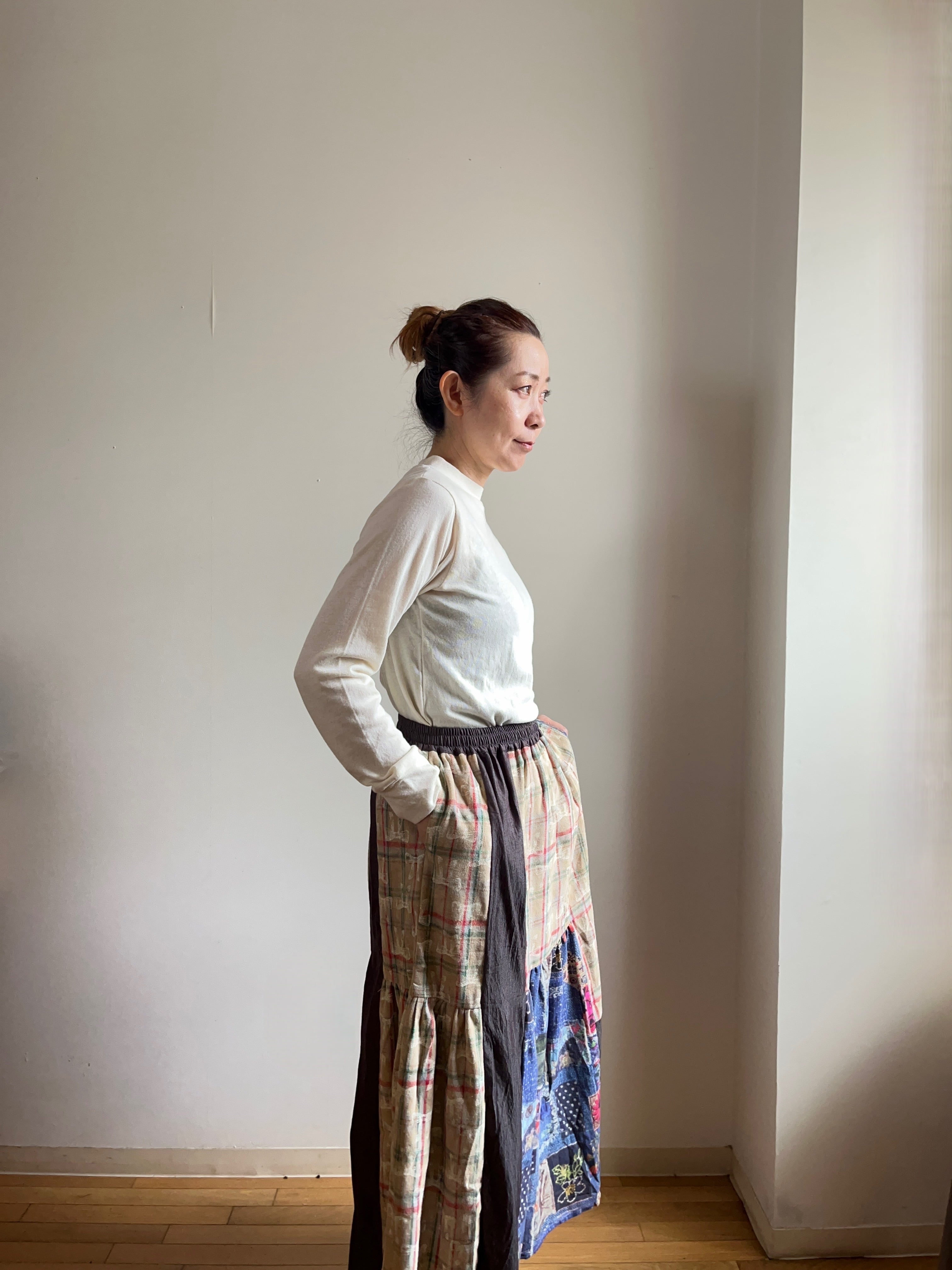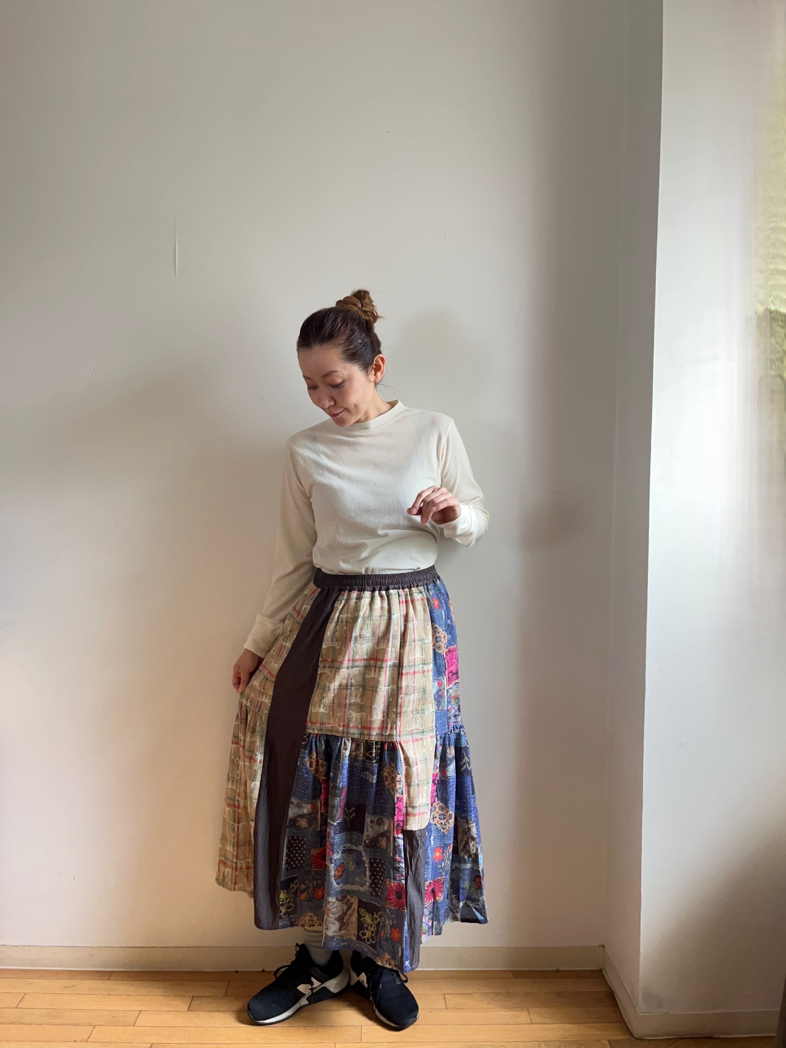 このパッチワークスカートは、個性的なデザインと快適な着心地を兼ね備えた、魅力あふれるアイテムです!