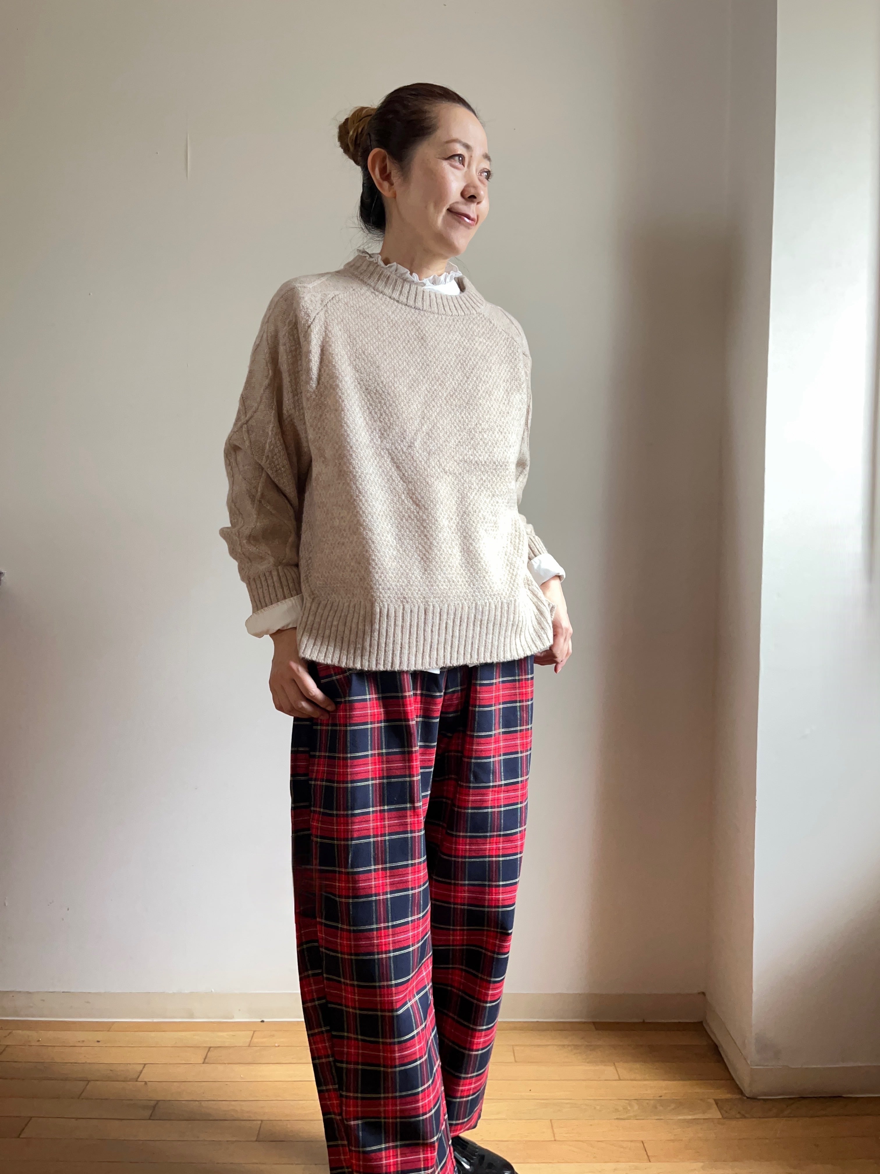 このニットは、身頃は鹿の子編みで、ラグラン袖にはケーブル柄のデザインで、シンプルながらも個性的な印象を与えます。柔らかな素材が肌に心地よく、動きやすさも兼ね備えています。また、どんなボトムスとも相性抜群で、カジュアルな日常使いからお出かけシーンまで幅広く活躍します。季節を問わず合わせやすいデザインで、スタイリングの幅を広げてくれるのが魅力です。