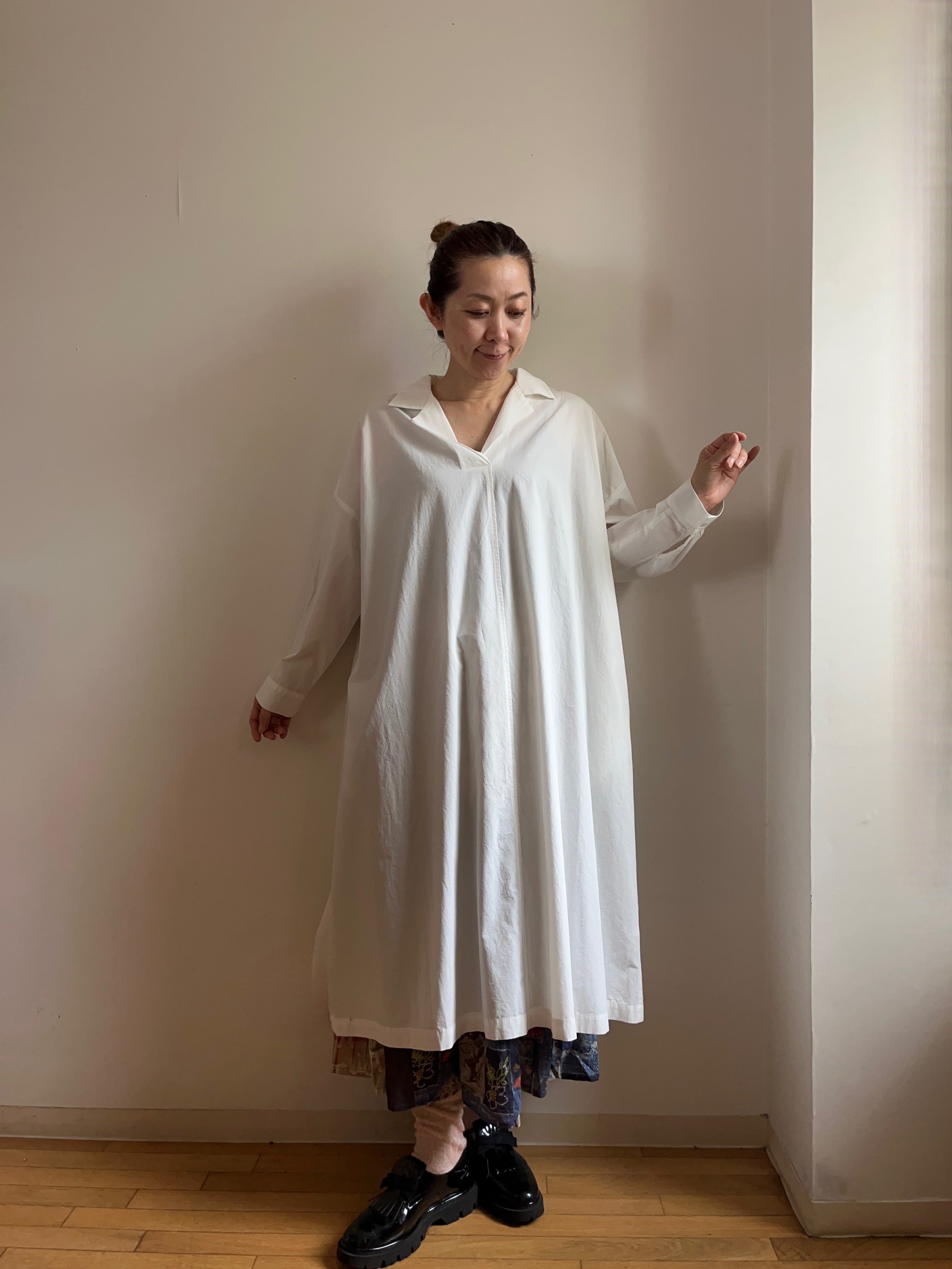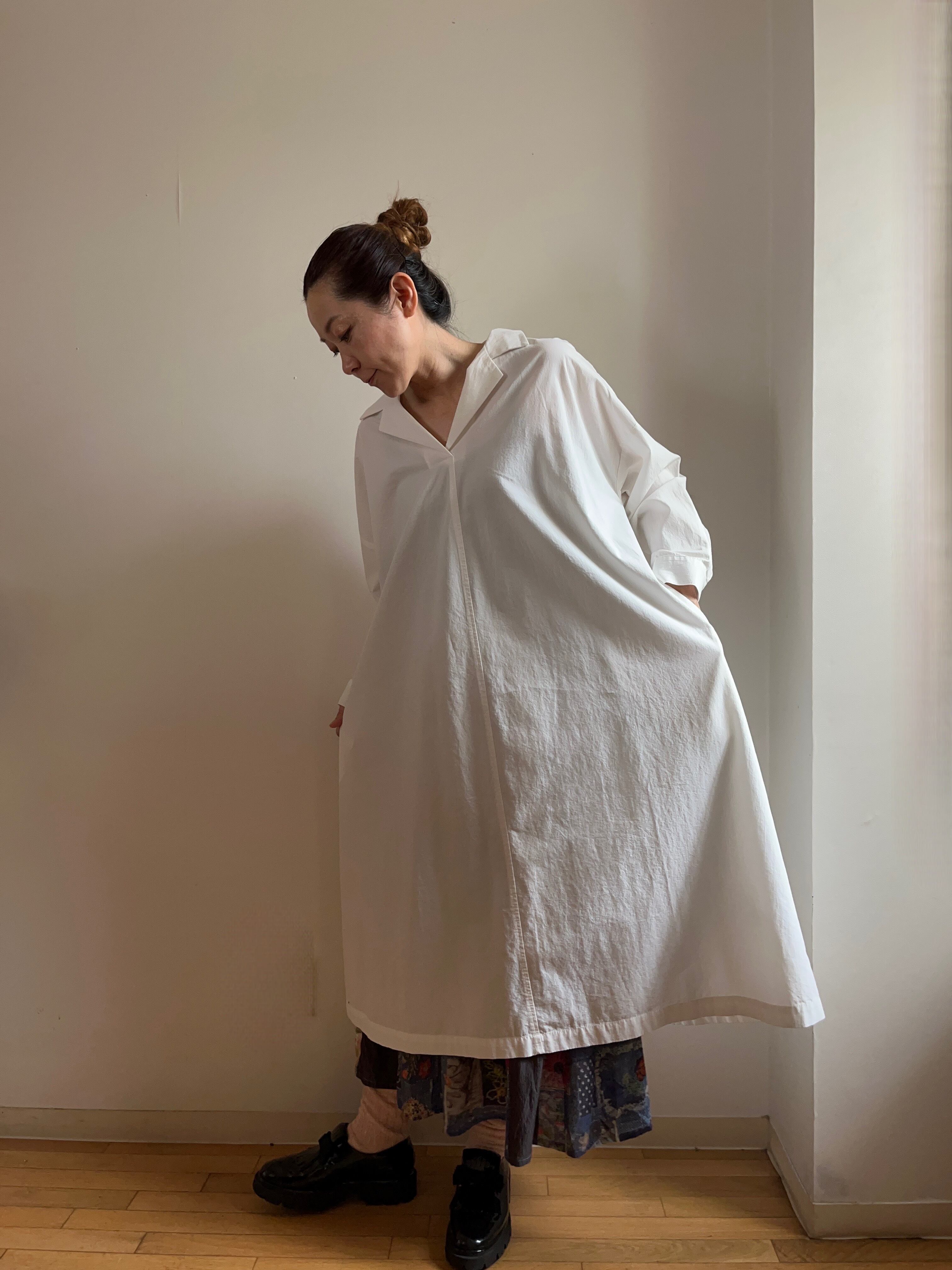 被りデザインのため、着脱も簡単で、さりげないオシャレを演出してくれます。フレアなスカートラインが女性らしさを引き立て、さまざまなアクセサリーとの相性も抜群。シーズンを問わず着回しが可能で、重ね着スタイルにもぴったりです。