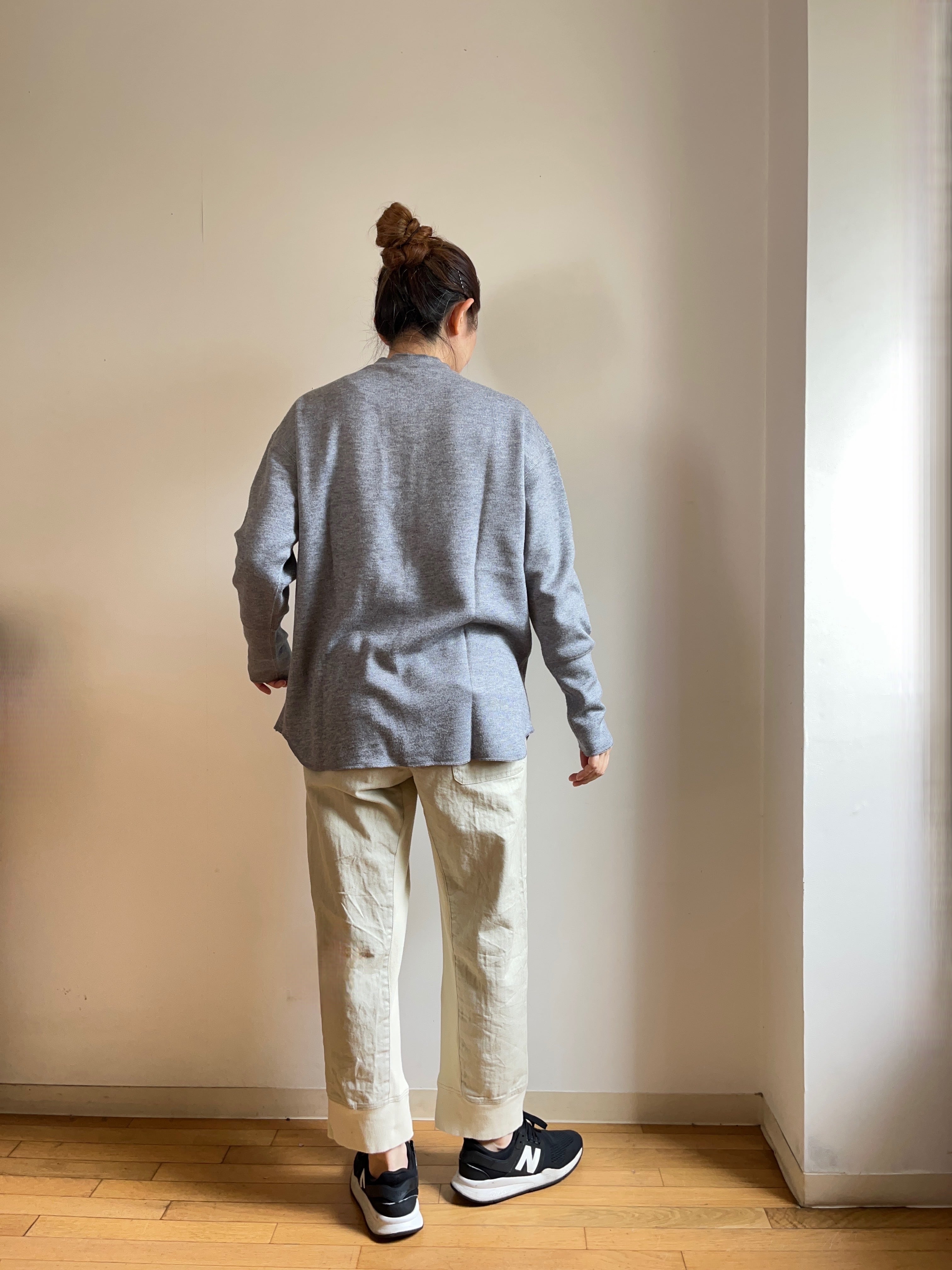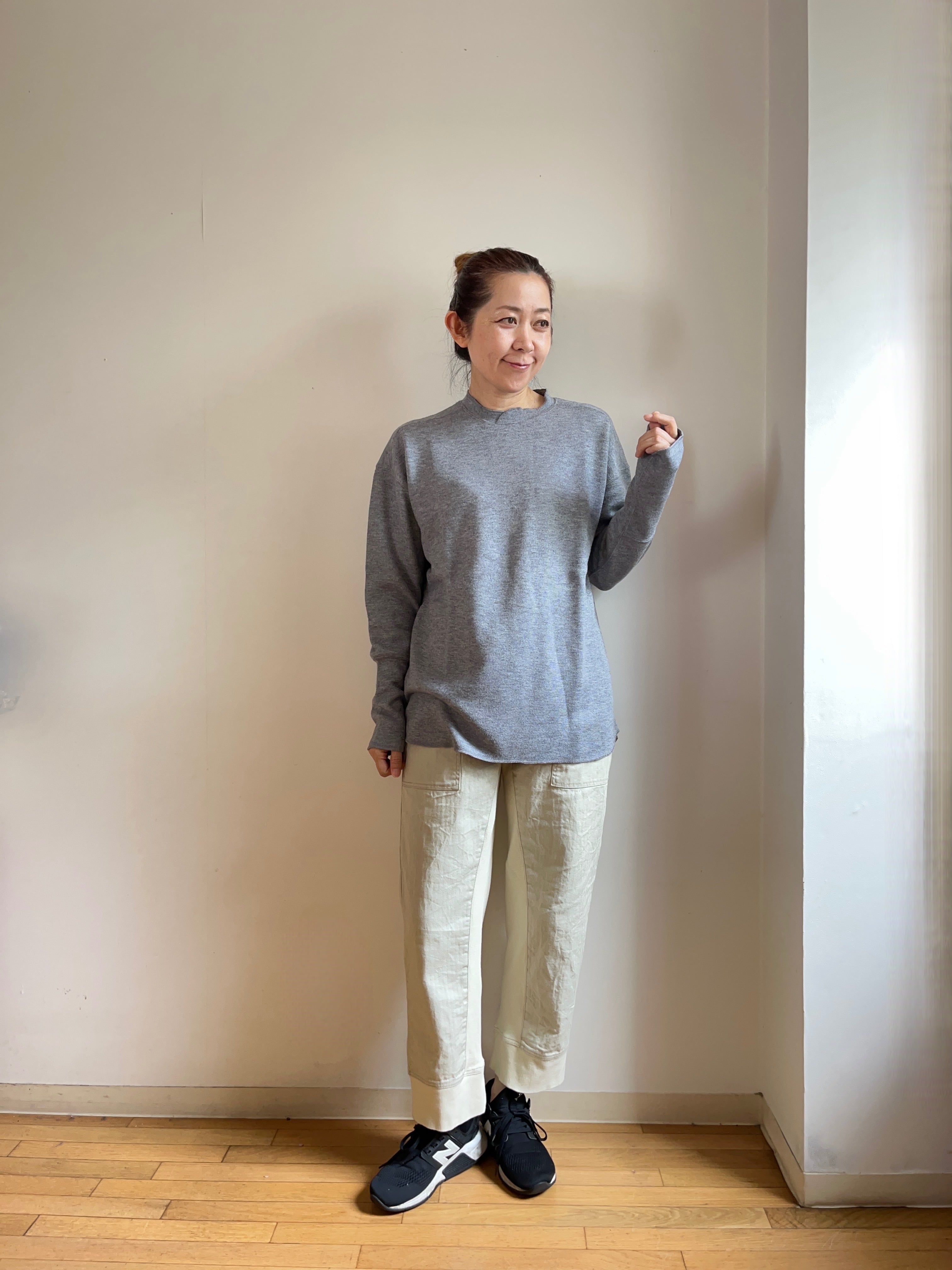 もちもちとした肌触りのニットソーをしようしています。シンプルながらもおしゃれなディテールがあり、どんなボトムスとも相性抜群。デニムやスカートと合わせて、日常のコーディネートを楽しむことができます。また、袖を長めに設定していますので、レイヤードスタイルにも適しており、一枚で着ても、重ね着をしても活躍します。
