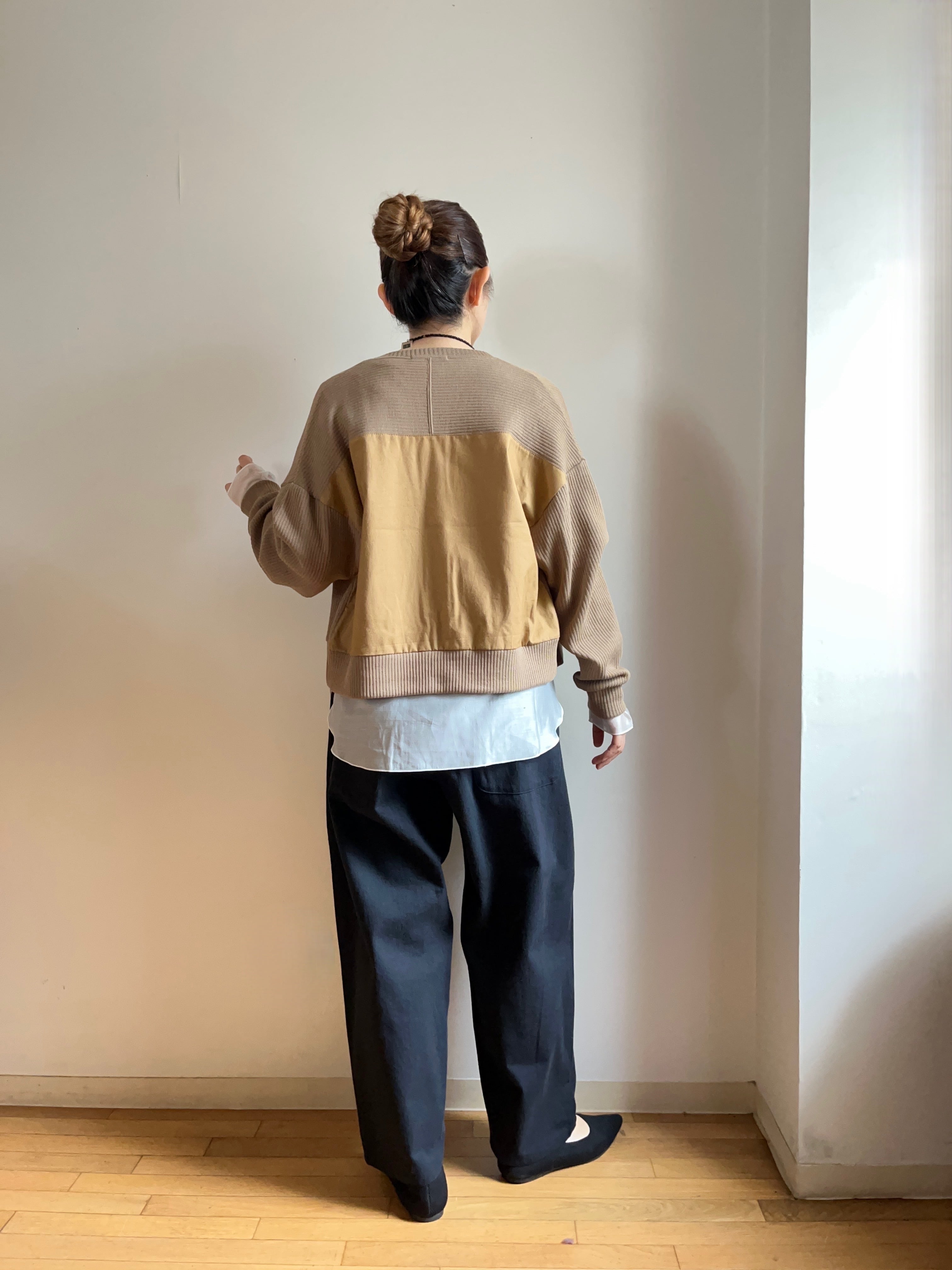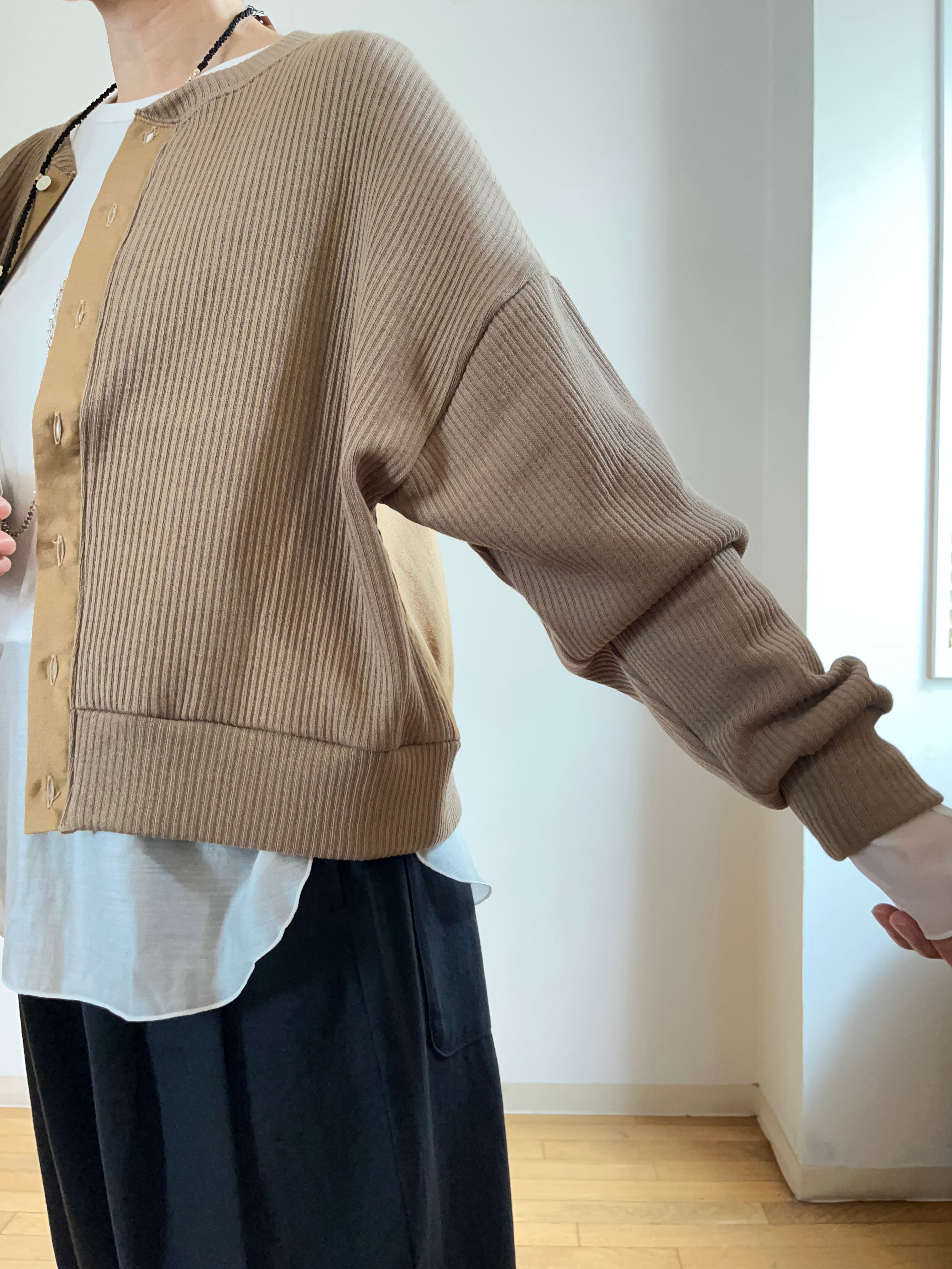 フロントのデザインにはボタンを採用し、シンプルながらも印象的なポイントに。身幅ひゆったりめで、動きやすさと抜け感を実現しています。裾と袖口にはリブ編みが施されており、程よいフィット感をプラスしました。