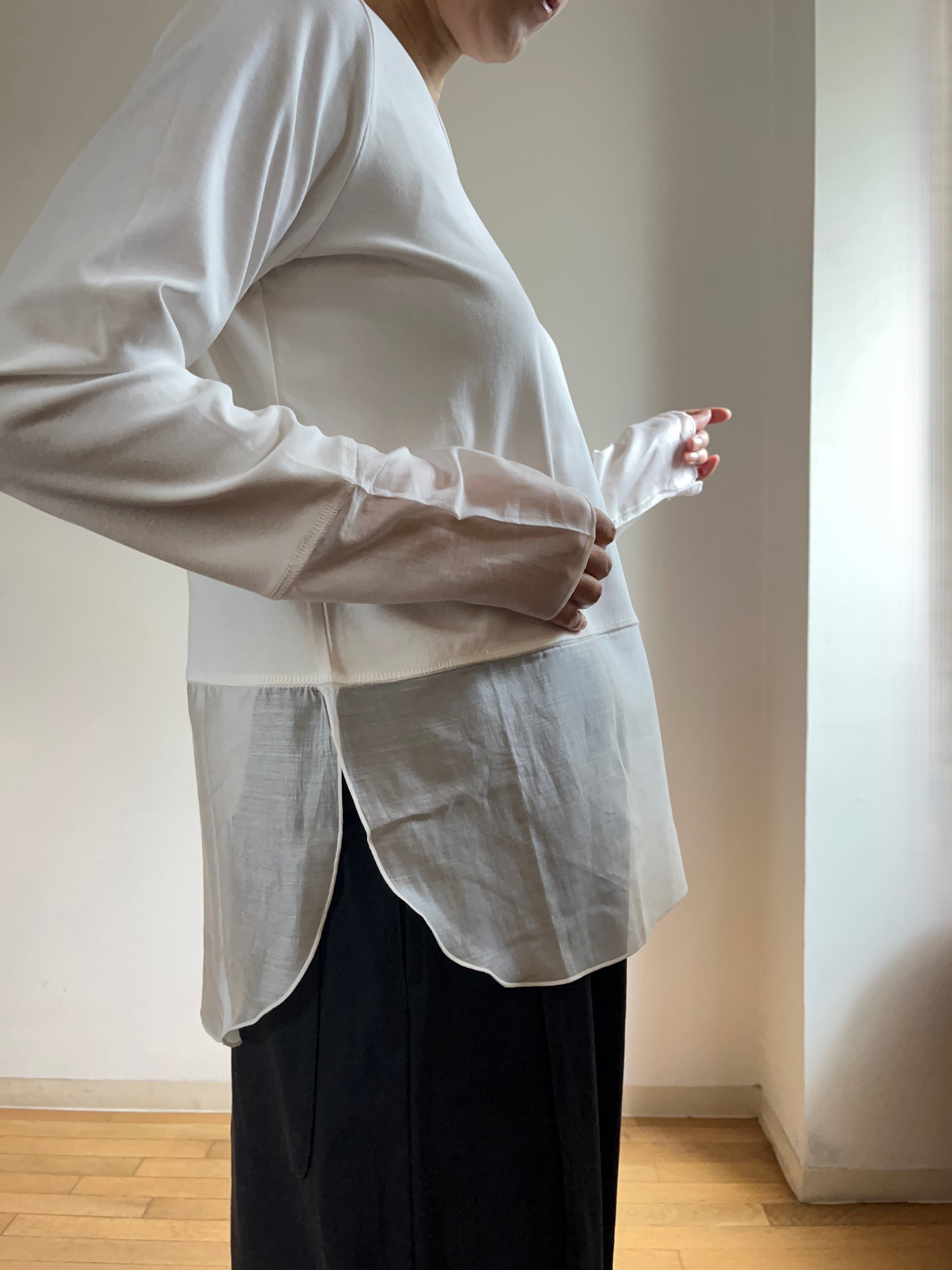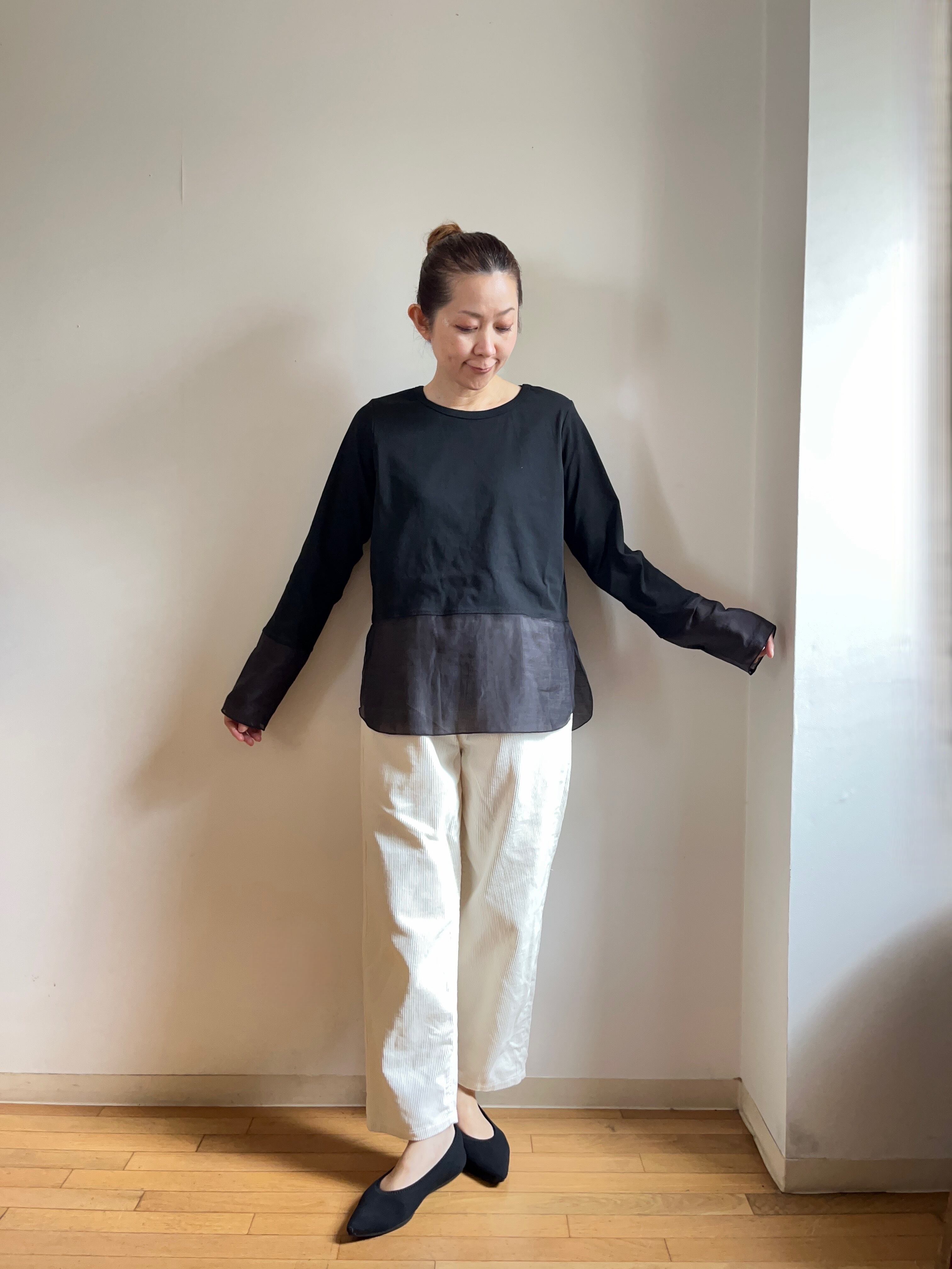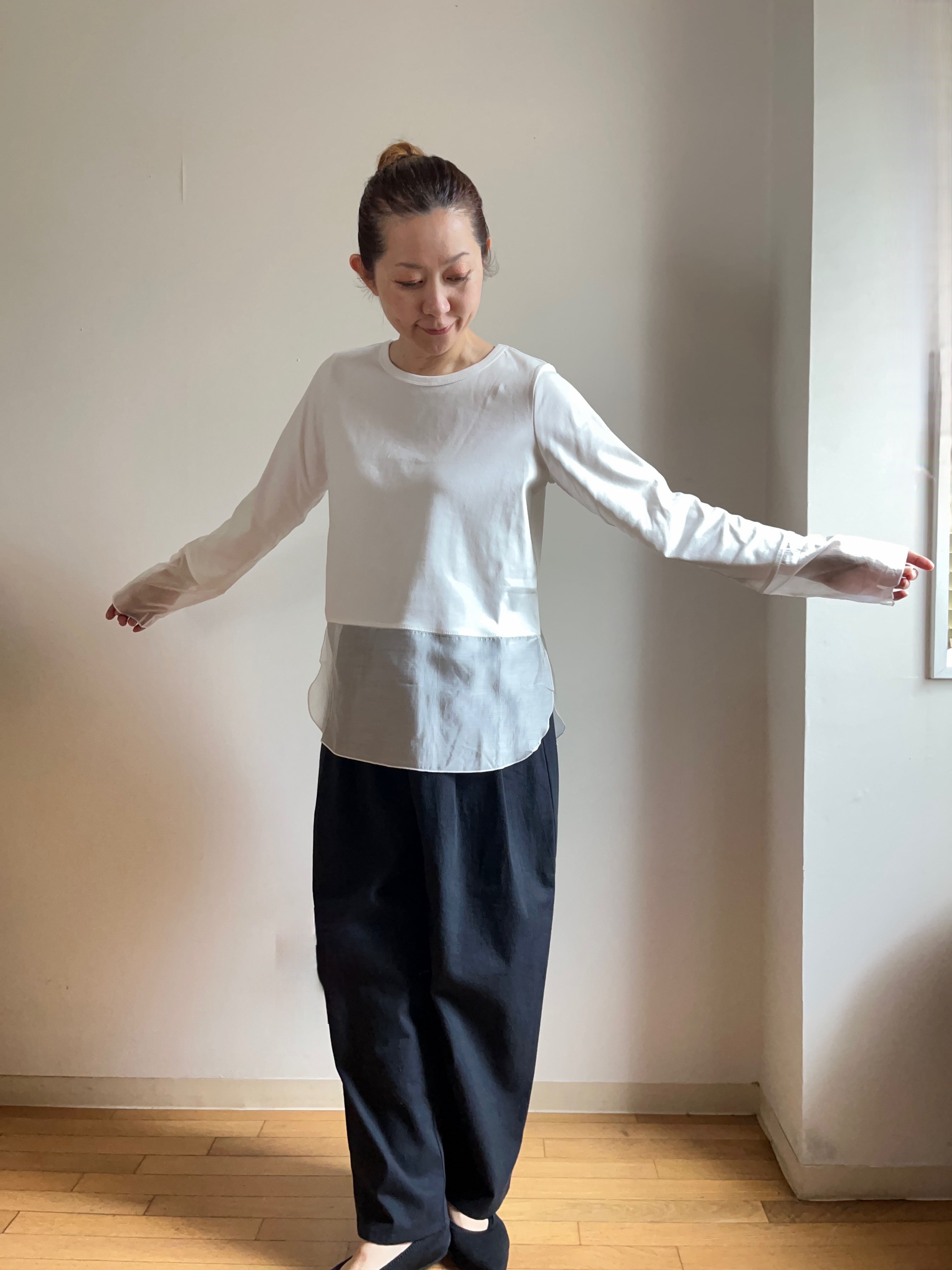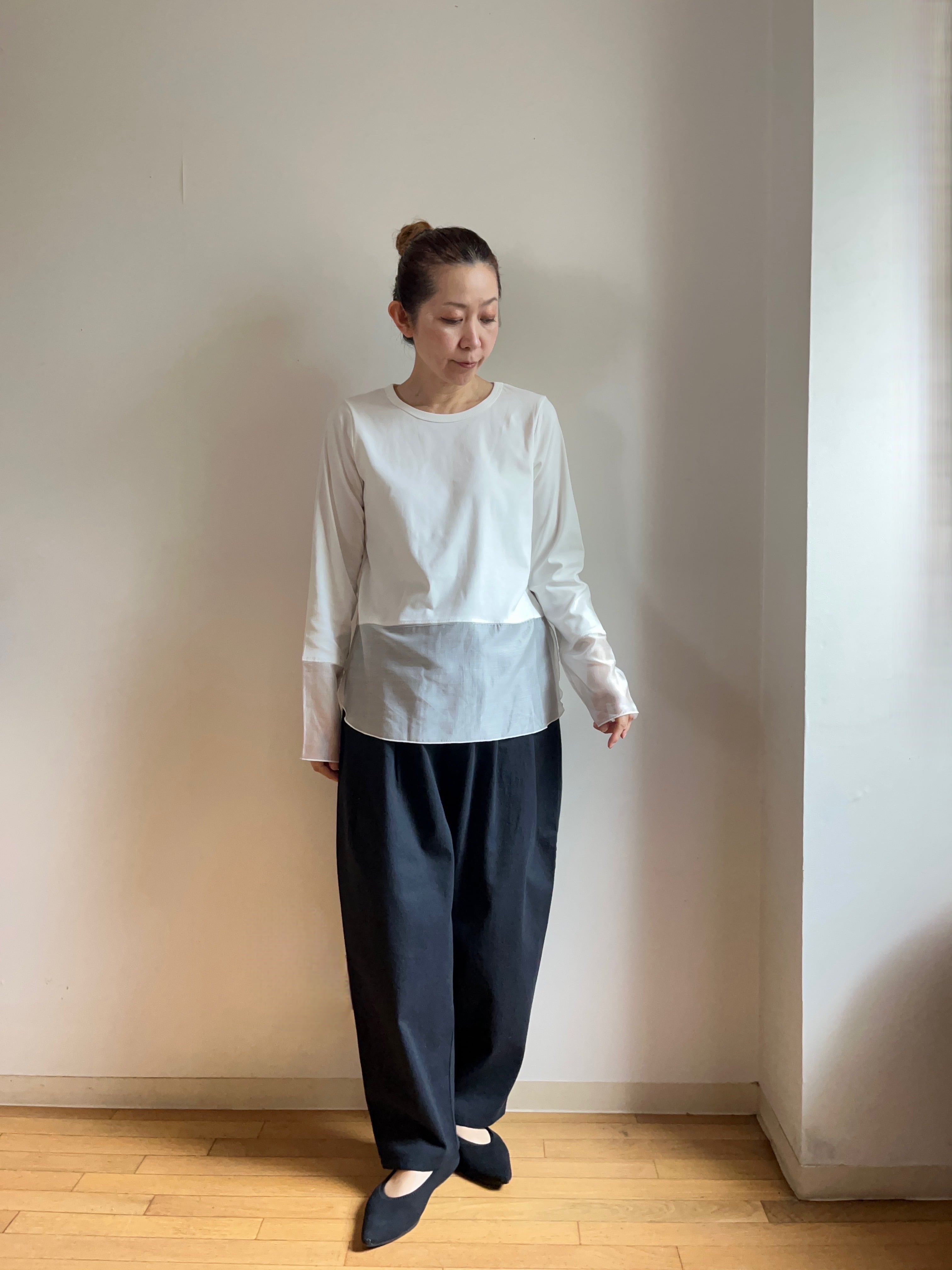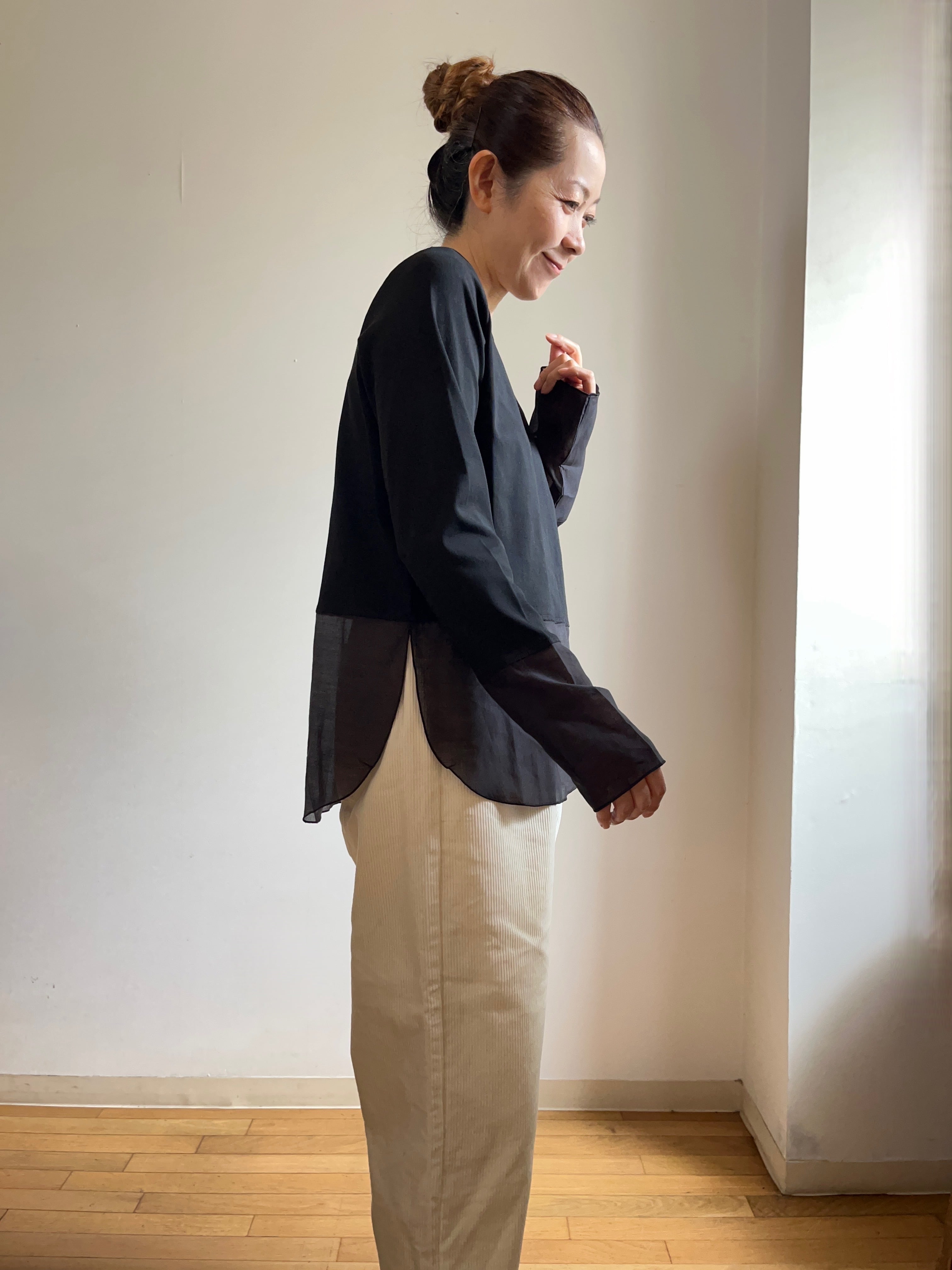 袖口と裾の切替デザインが、全体のシルエットに変化を加え、スタイリングのアクセントに。袖と裾はシースルーで、程よい軽やかさをもたらしつつ、コーデに変化をもたらします。