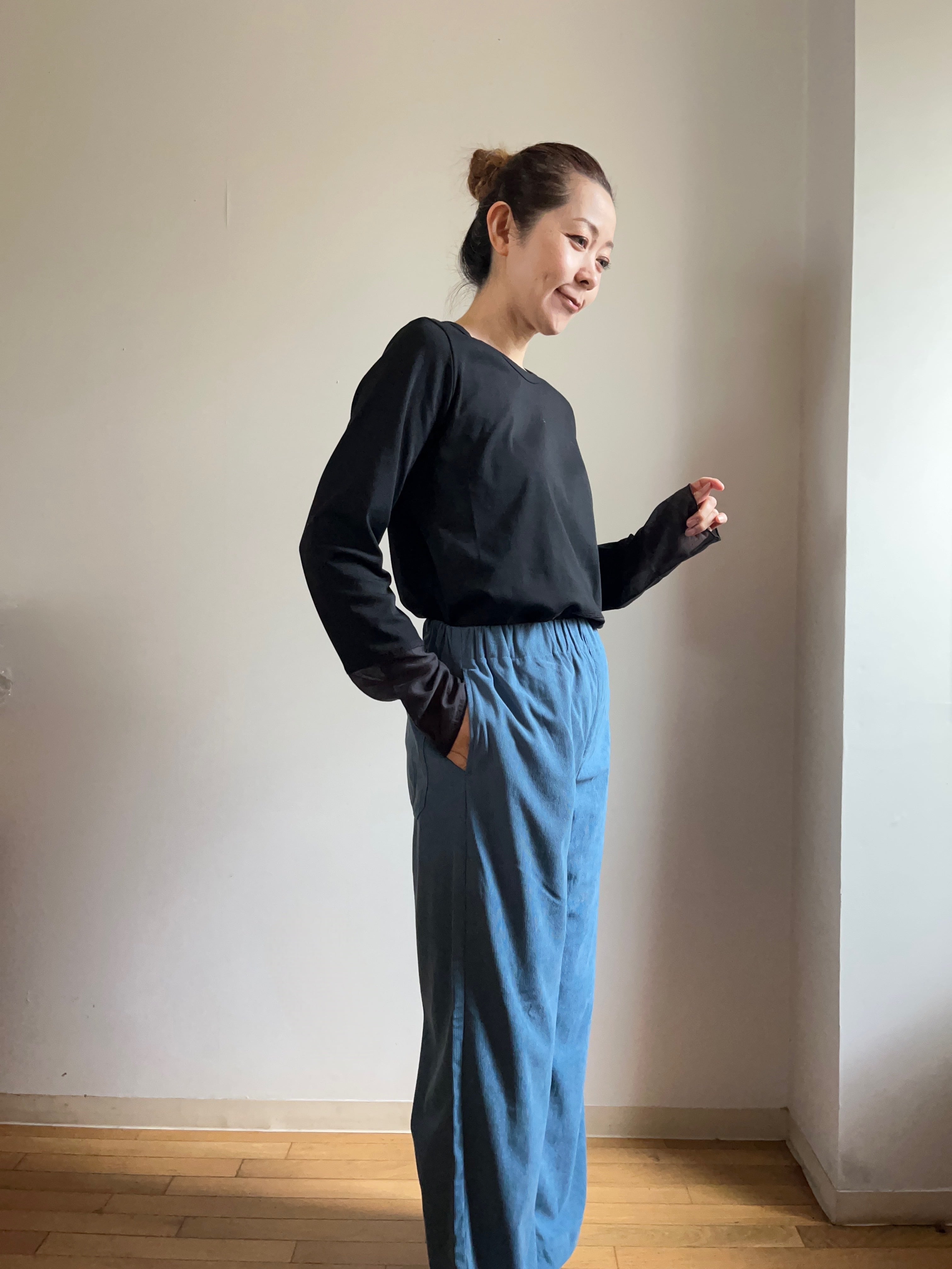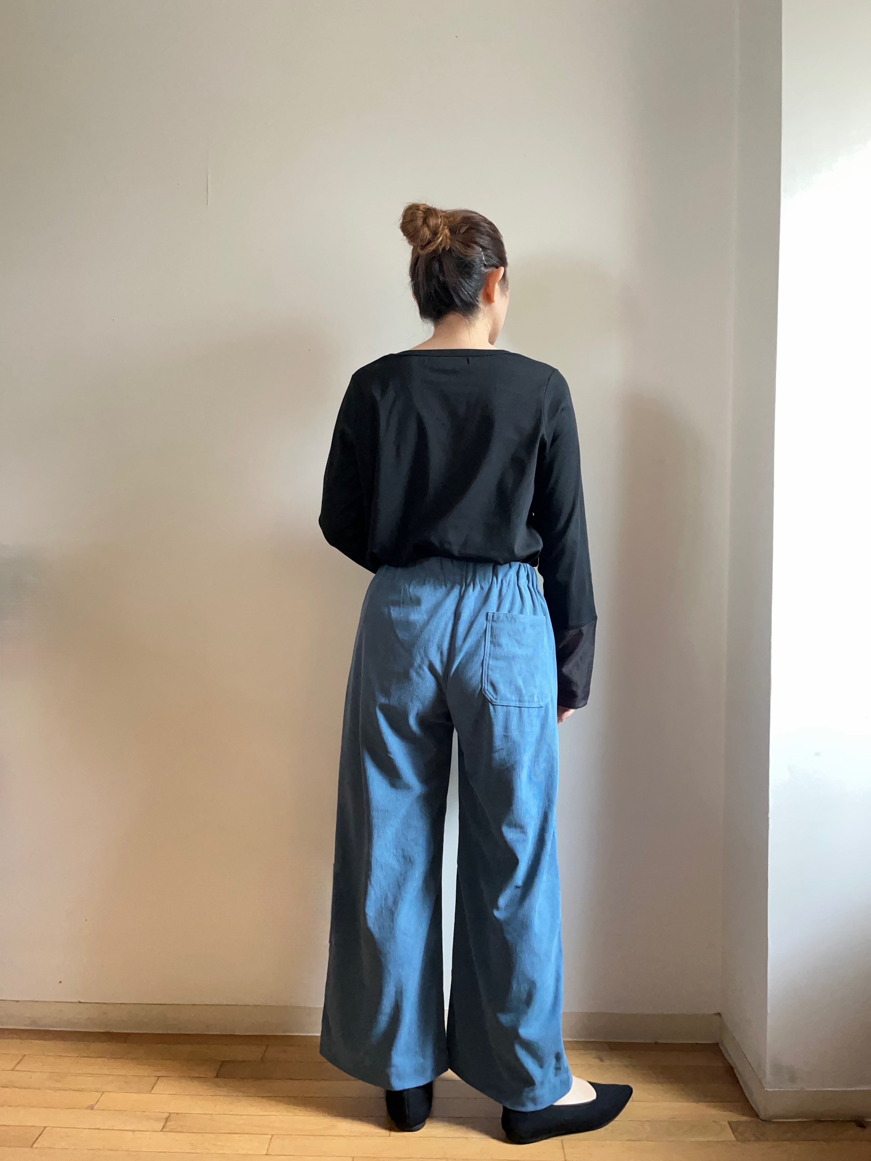 細畝の柔らかなゴーデュロイ素材が心地よく包み込む、上品なワイドパンツです。