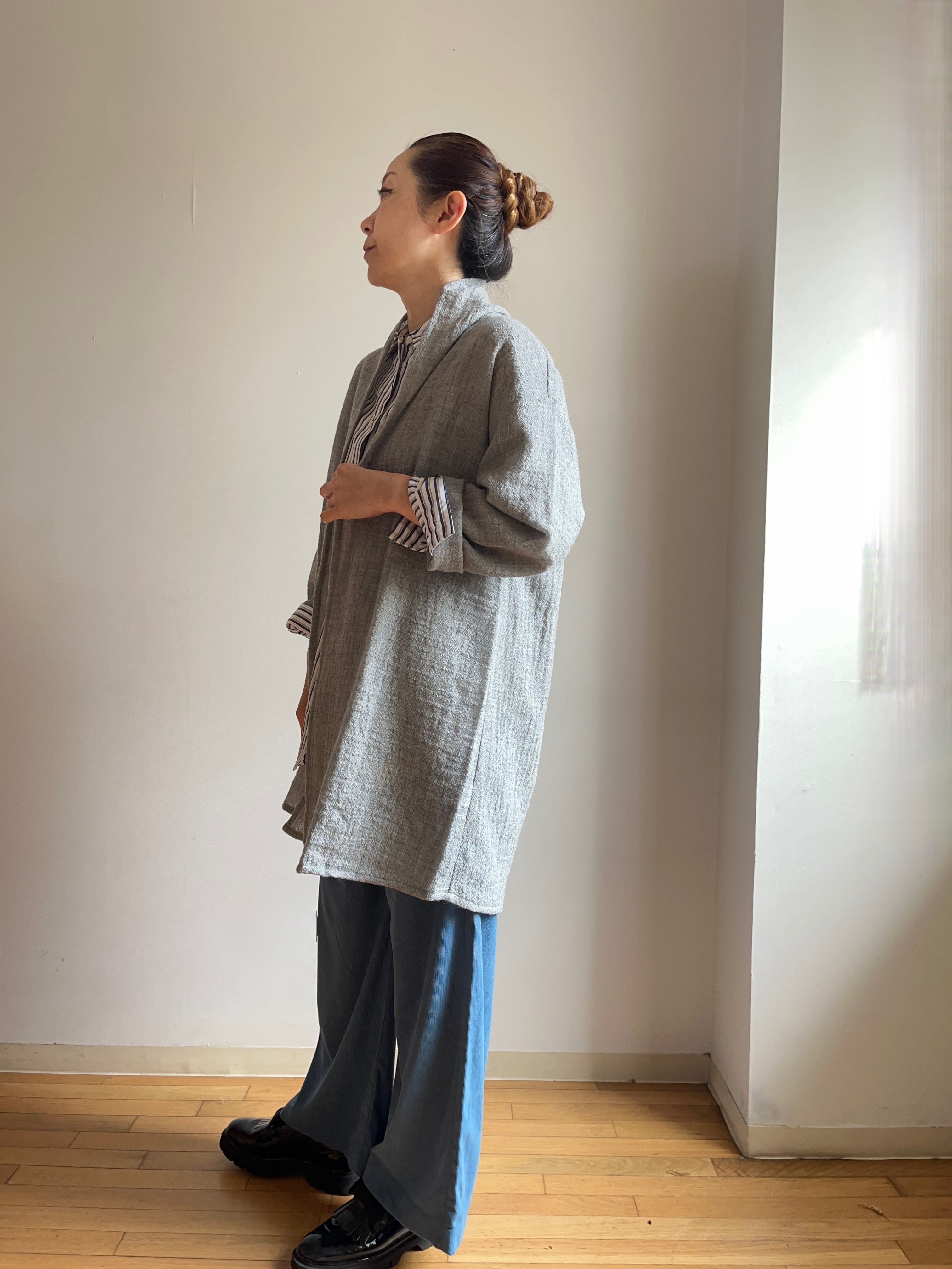 シンプルなデザインながら、合わせるアイテムを選ばず、さまざまなシーンで活躍する一着です。軽やかな着心地が魅力で、重ね着も楽しめるため、季節の変わり目にもぴったりです。