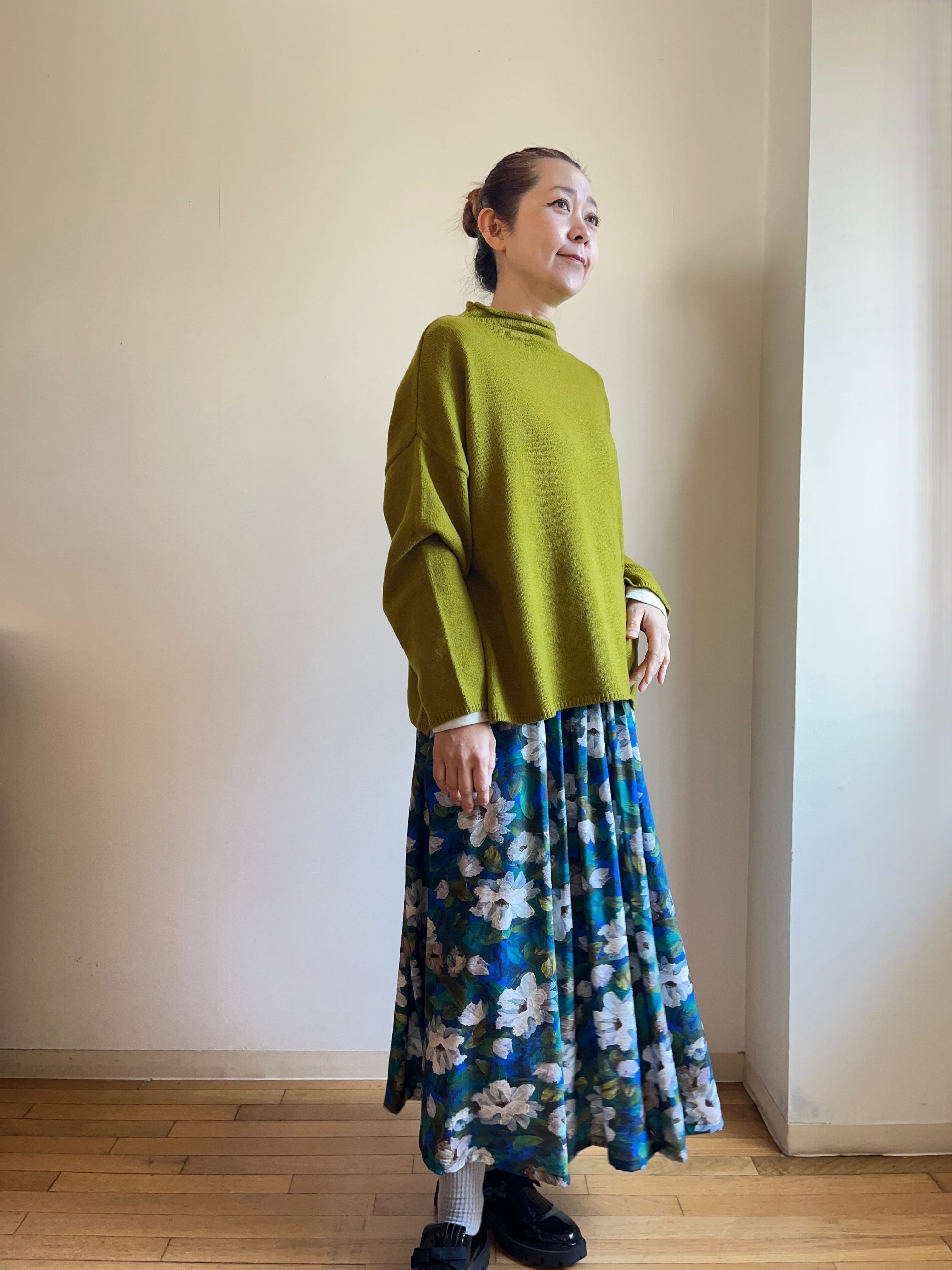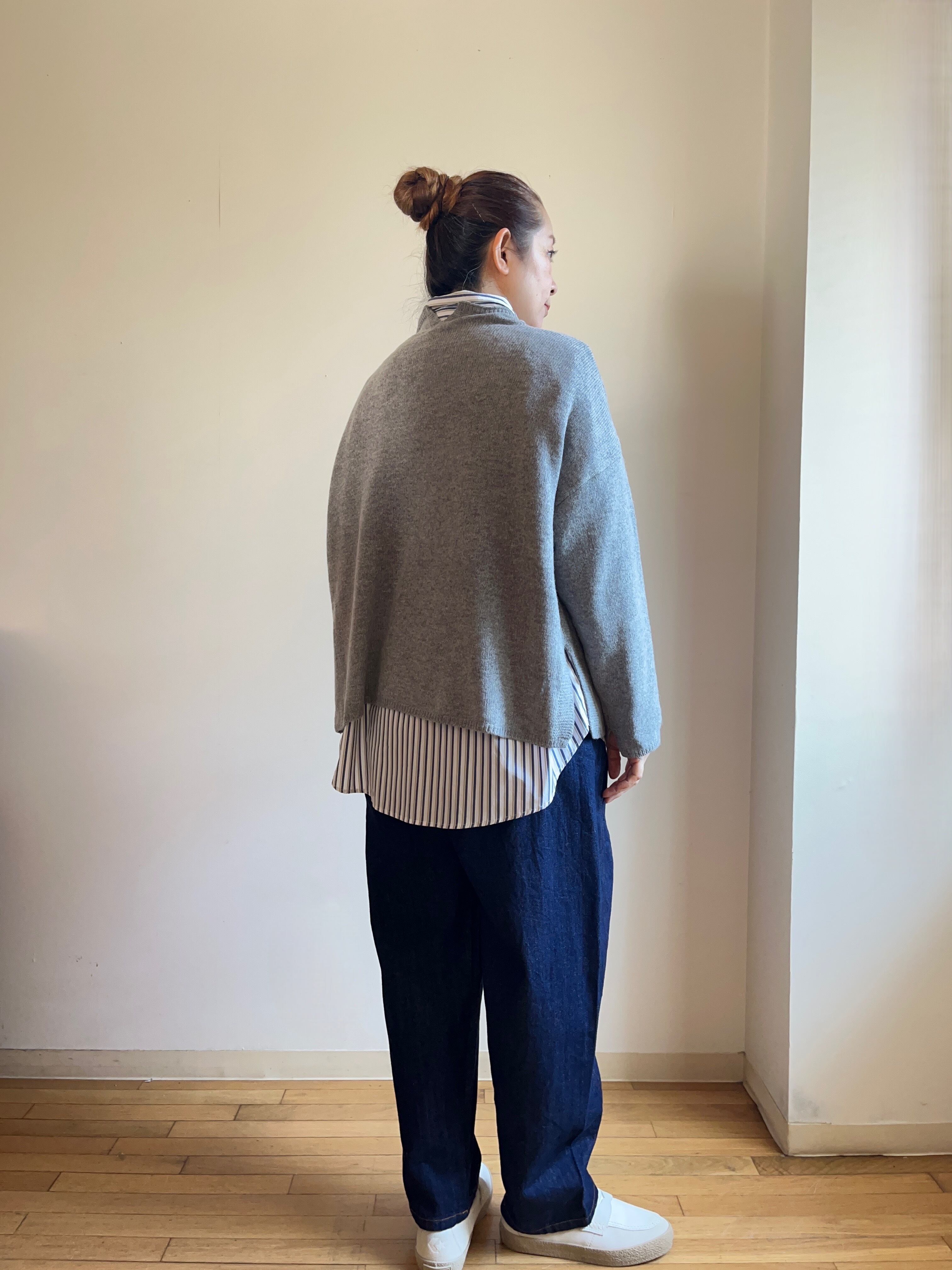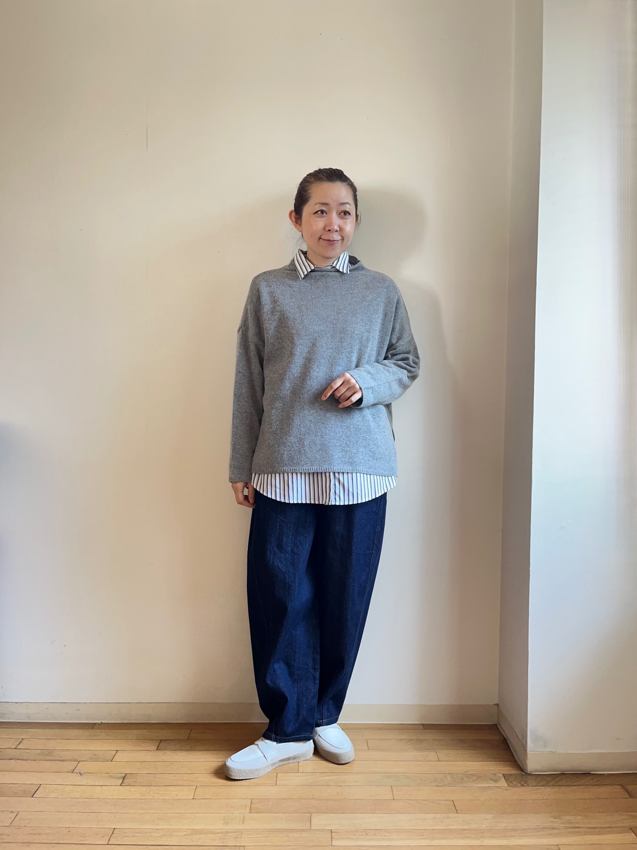 このニットは、デニムやスカートなどのボトムスと相性抜群で、カジュアルからオフィスシーンまで幅広く活躍します。重ね着にも最適で、温かさを保ちつつスタイリッシュな印象を与えます。普段使いはもちろん、ちょっとしたお出かけにも活躍する一枚です!