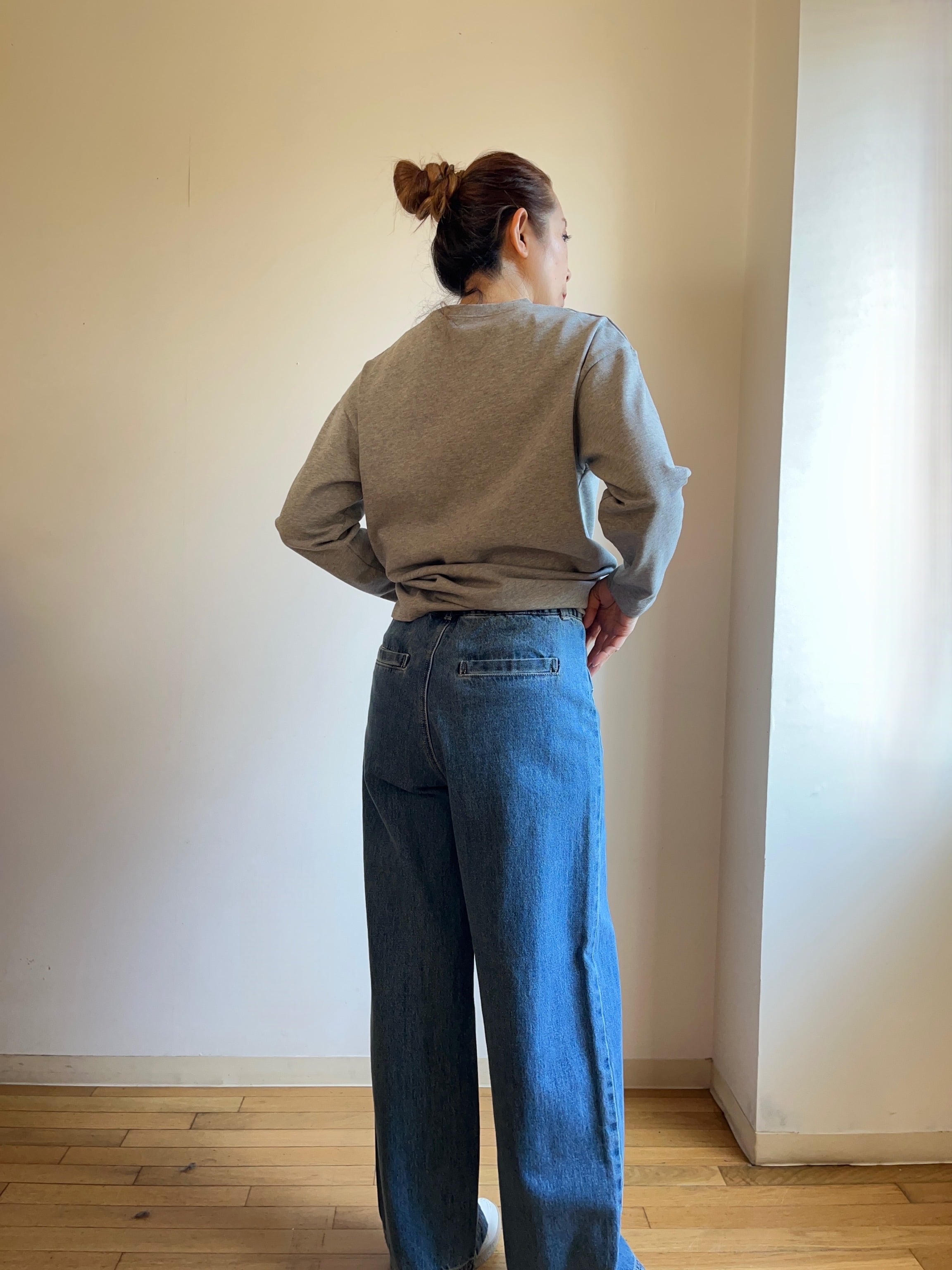 デニム素材は柔らかく、穿き心地も良いです。セーラーカラーが特徴的なデザインは、カジュアルから少し特別なお出かけまで幅広いシーンで活躍します。また、シルエットが美しく、体型を選ばないため、日常使いとして大変便利です!