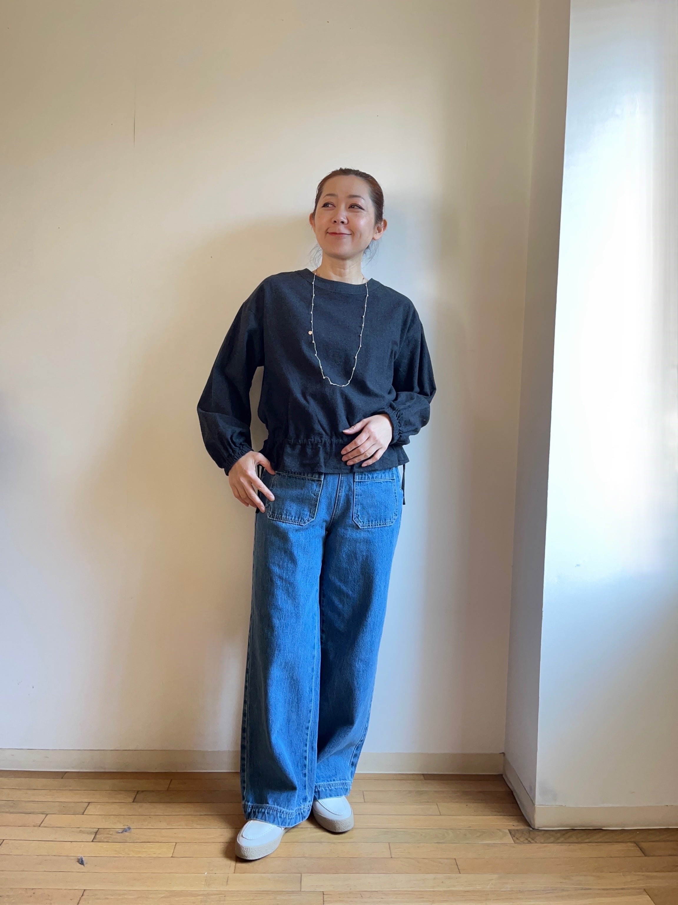 ウエストに紐が付いているため、スタイルに合わせて自由にシルエットを調整できる、万能な一枚です。