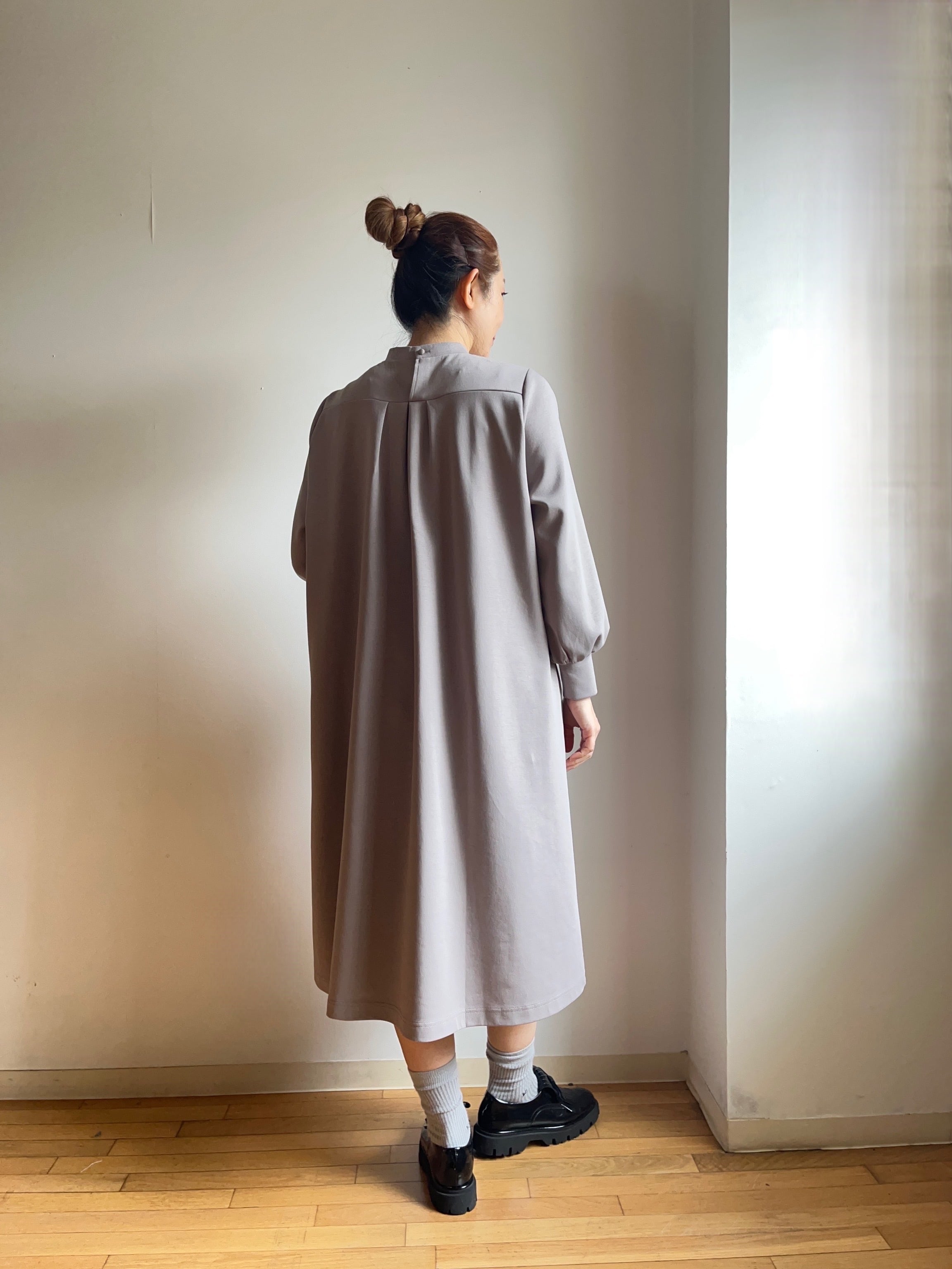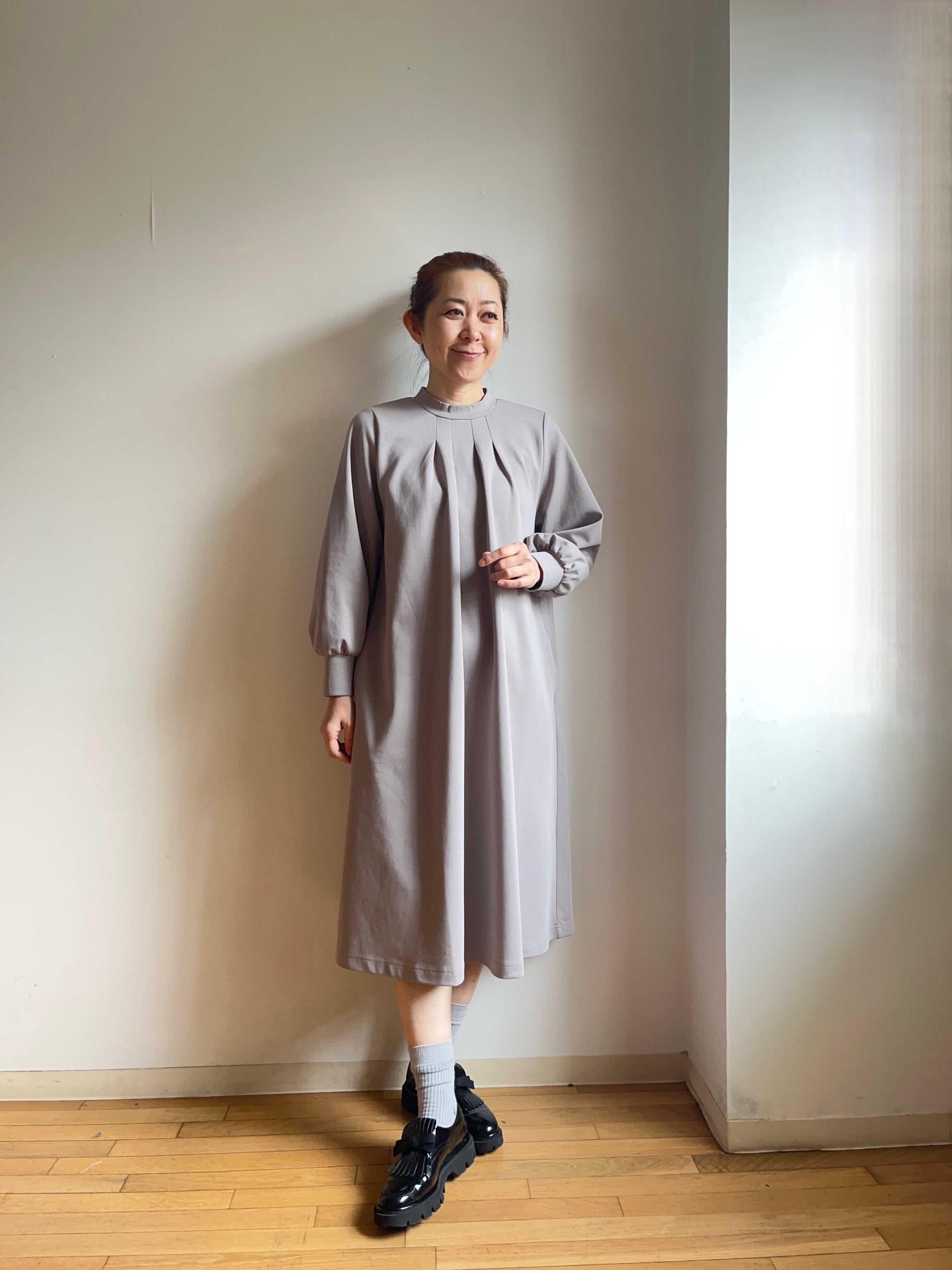 首元のタックが流れるようなドレープを描き、身体のラインを拾わず着心地も抜群です。