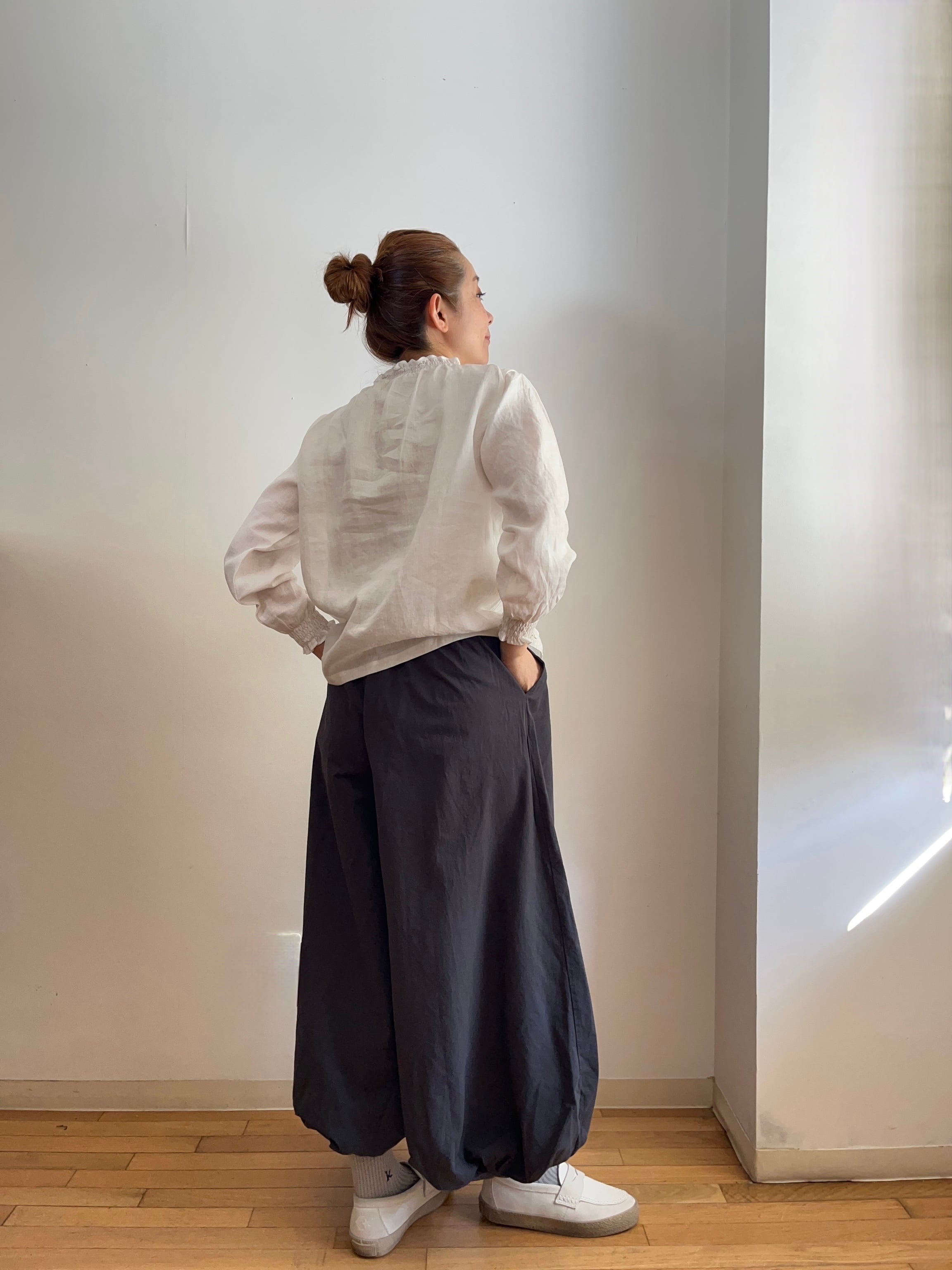 ウエストはゴム仕様で、楽に着用できるのも嬉しいポイント。季節を問わず活躍するので、さまざまなシーンでお使いいただけます。軽やかな素材は、動きやすさと快適さを兼ね備えており、リラックスしたい日のコーデにもぴったりです。