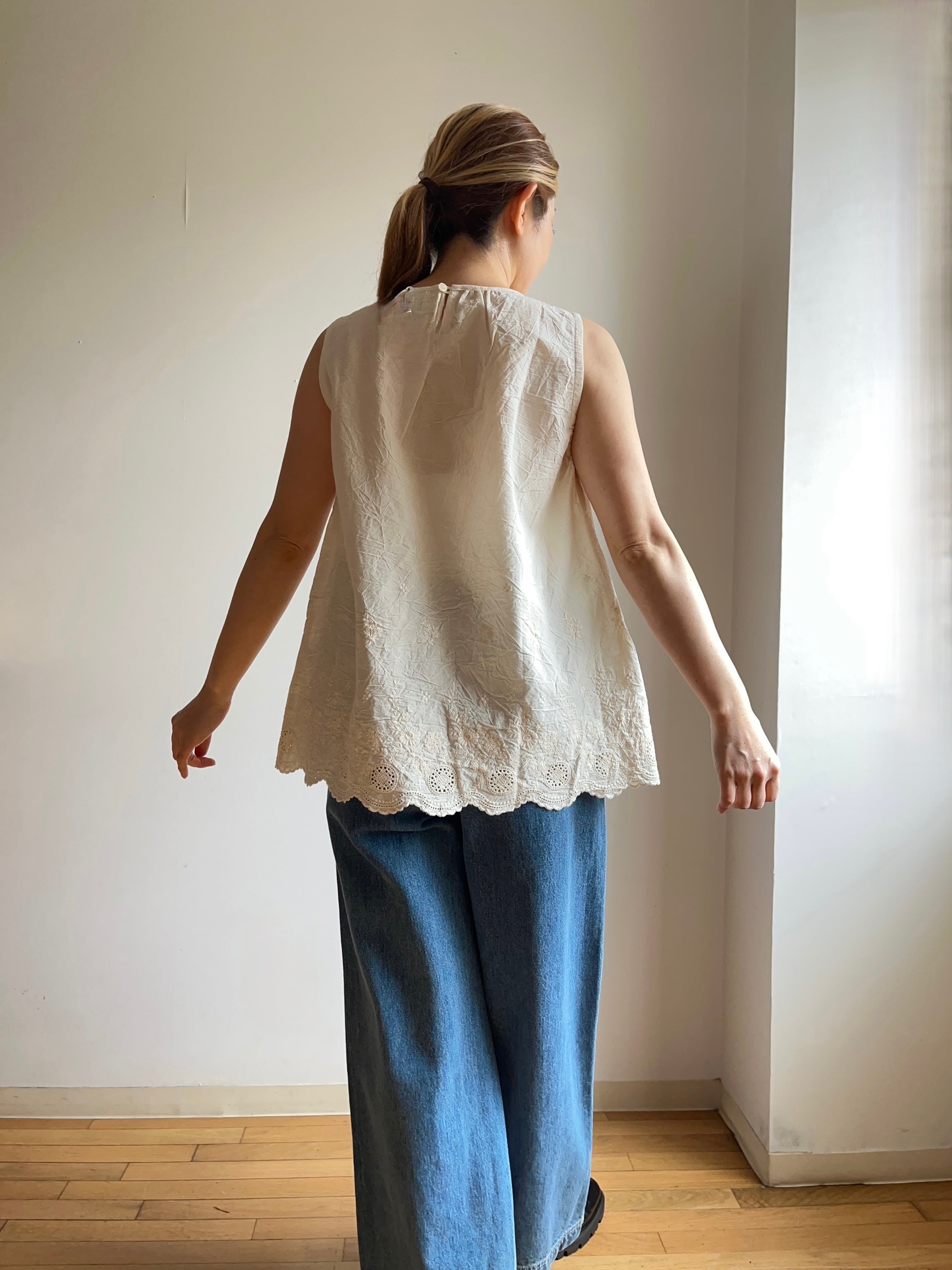 華やかな裾刺繍が印象的なノースリーブです。エレガントなデザインが特徴で、軽やかな綿素材が心地よい着心地を実現します。シンプルながらも、裾の刺繍がスタイルに深みを与え、特別な日のコーディネートにもぴったりです!