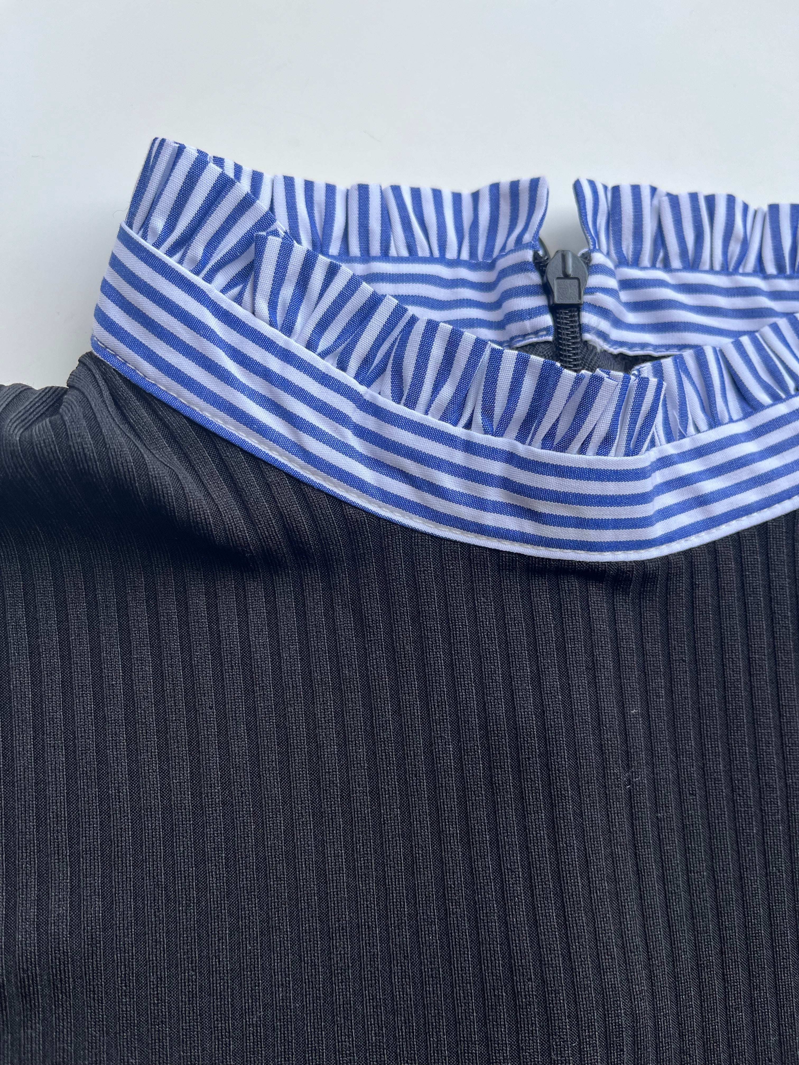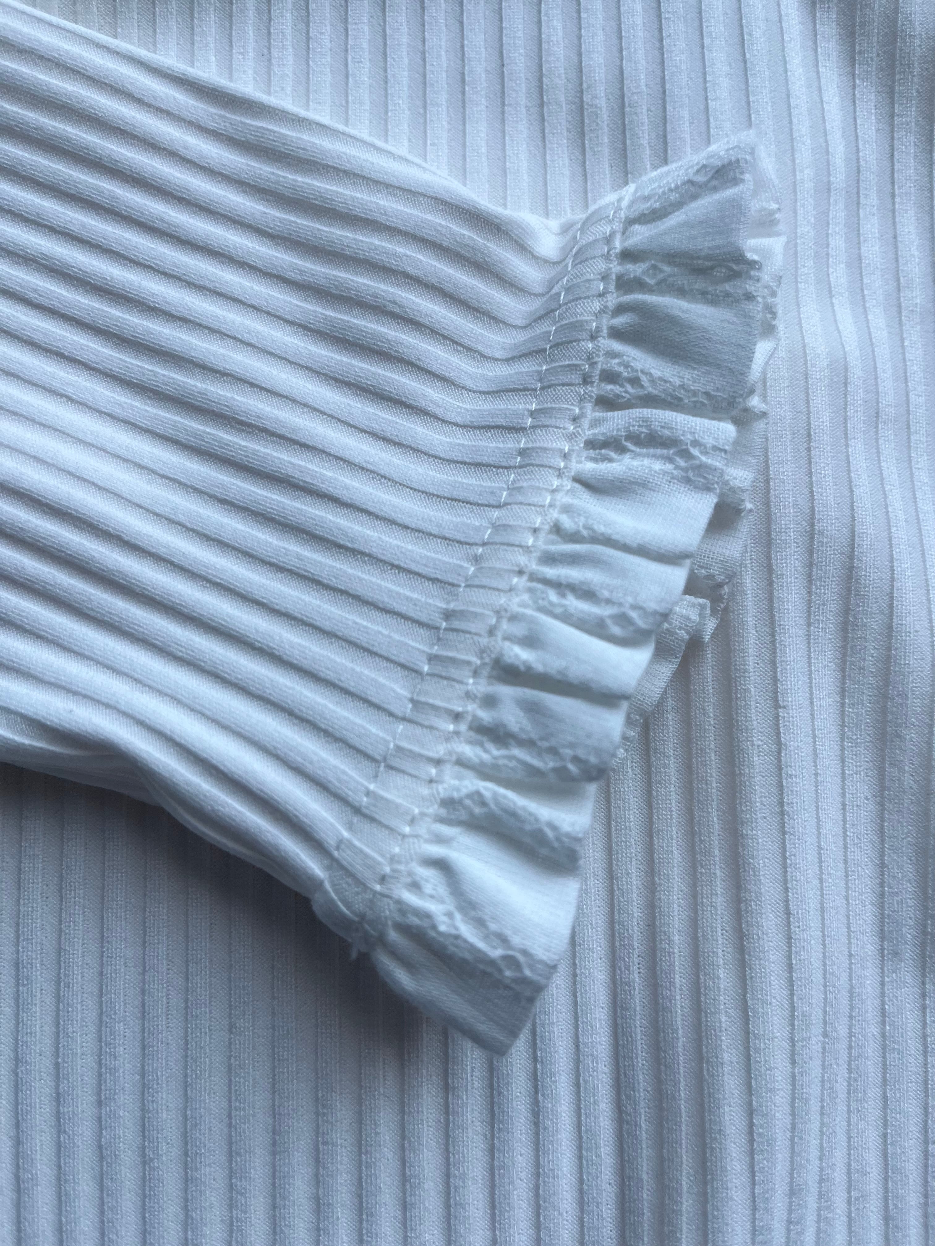 衿元と袖口にフリルを添えたハイネックプルオーバーです。