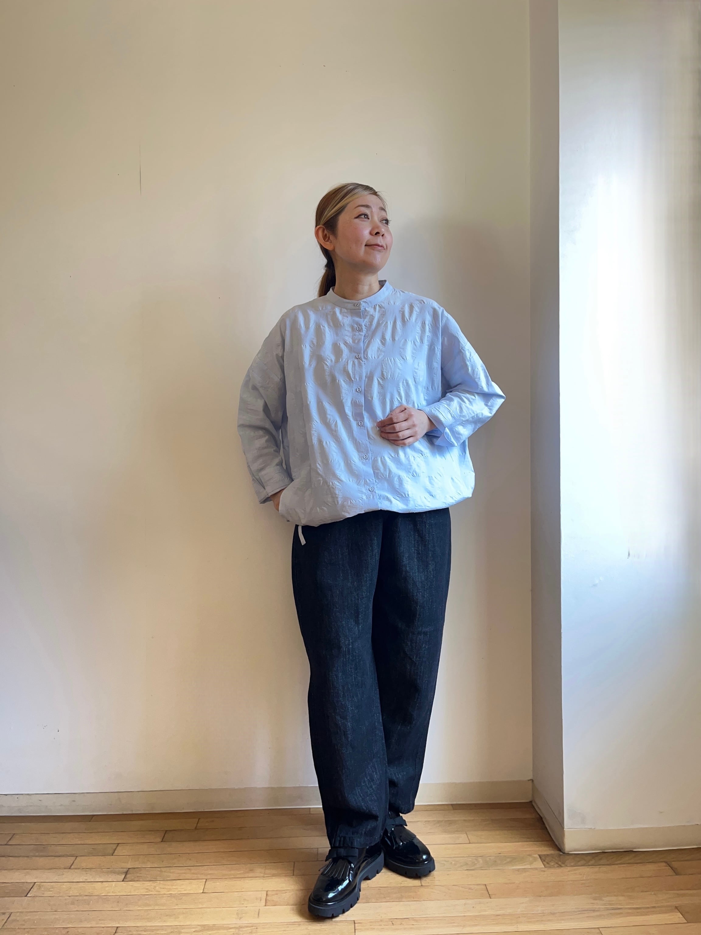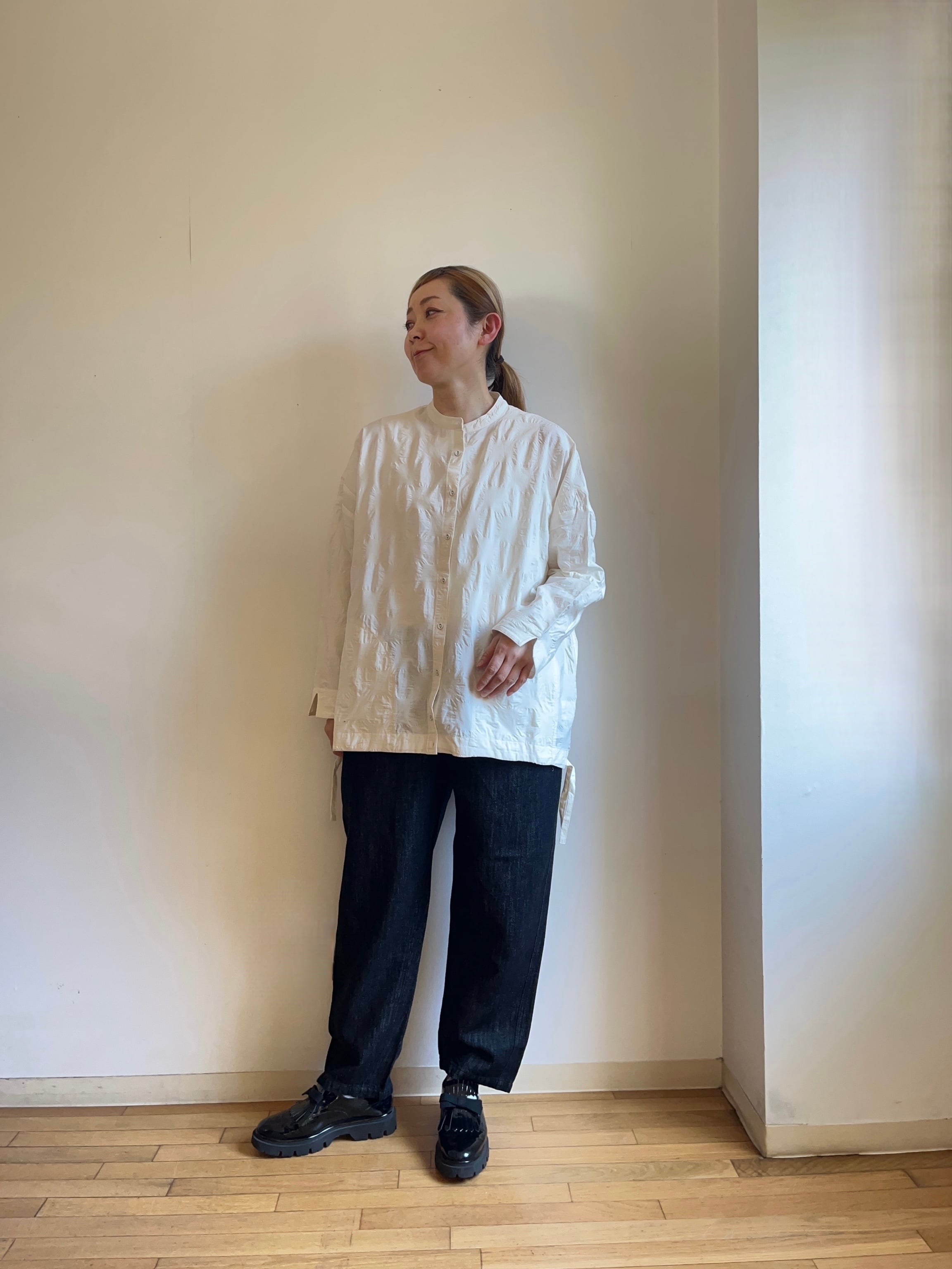 ゆったりとしたシルエットですが、両サイドのヒモを絞ることでふんわりとしたシルエットになり、変化をお楽しみ頂けます。