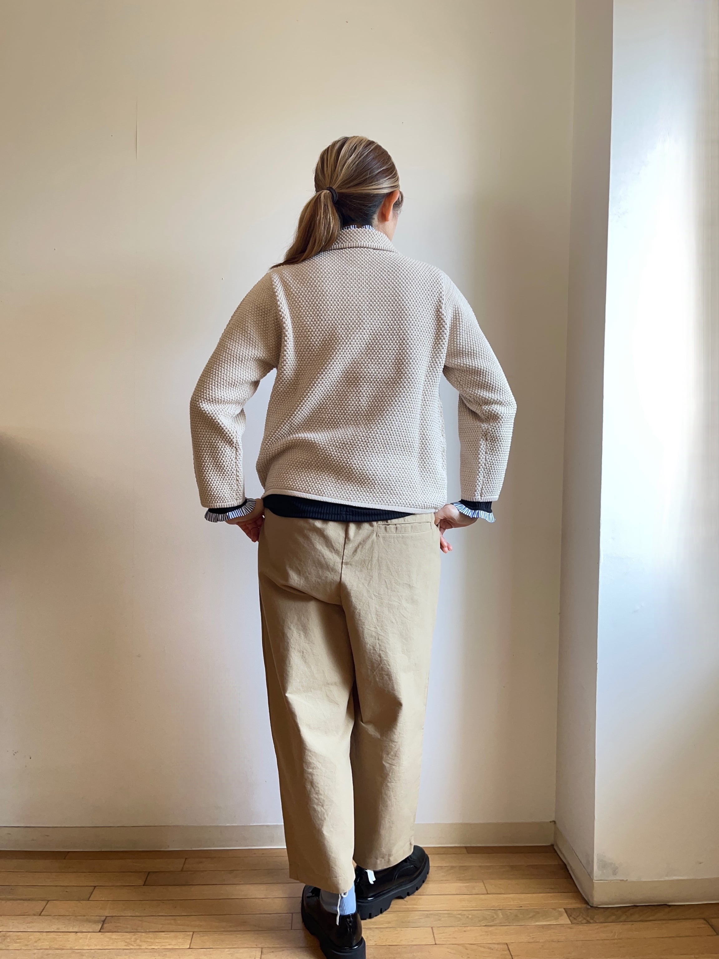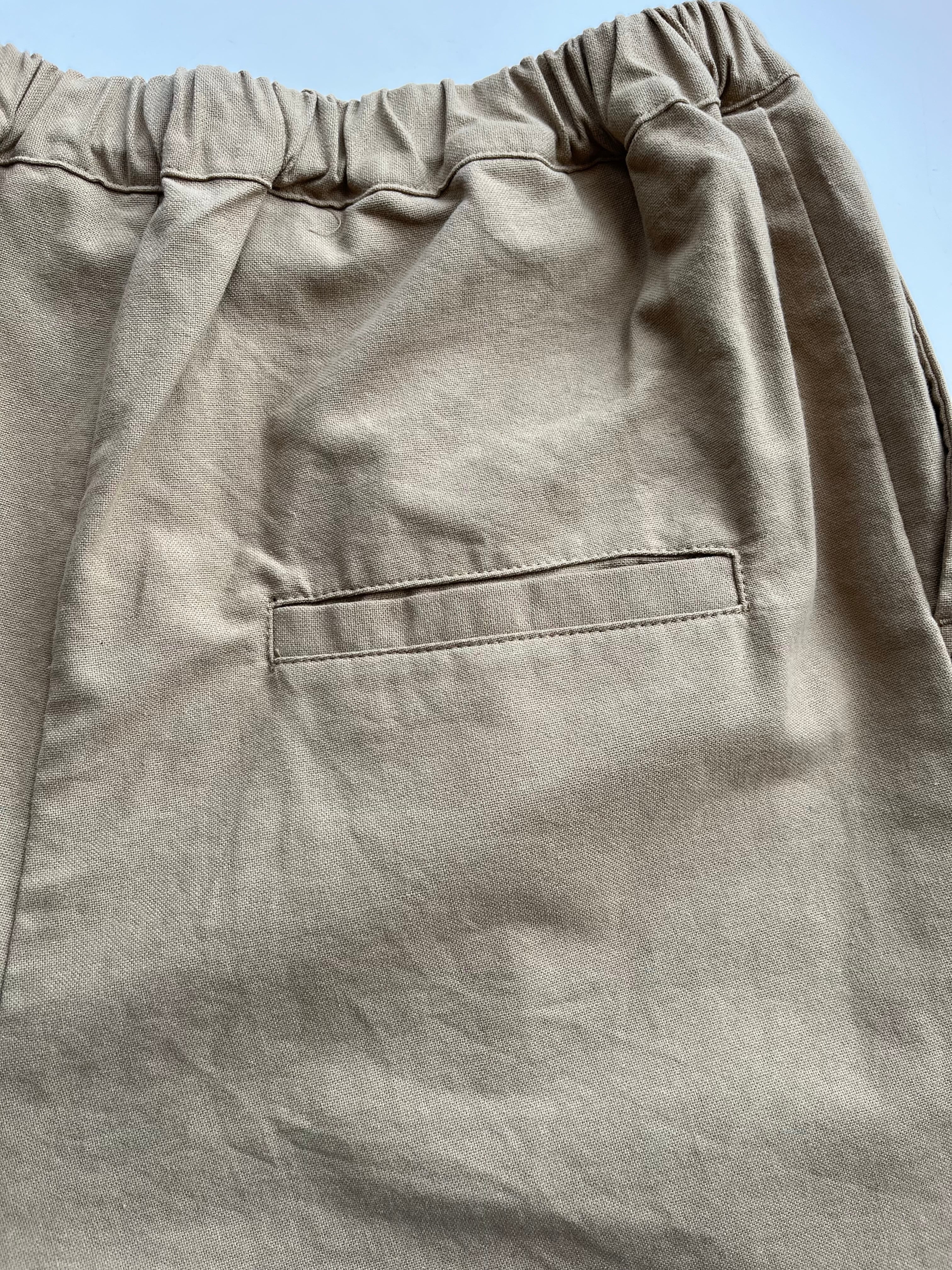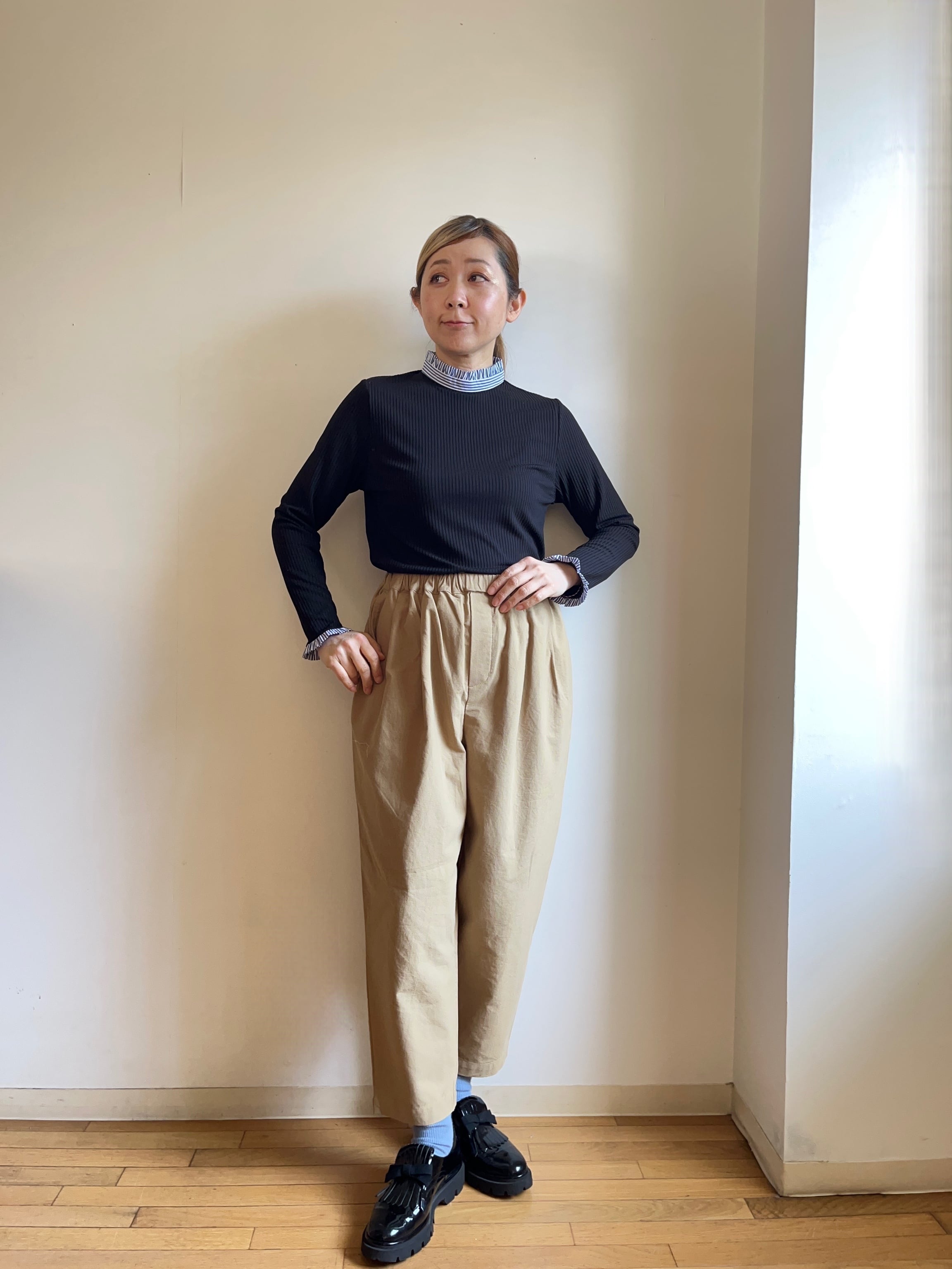 上品なオックス生地を使用した当アイテムは、しっかりとした素材感ながらも軽やかな履き心地が魅力です。テーパードシルエットでスマートに見えるため、ビジネスシーンにもカジュアルな日常使いにも最適です。ウエストはゴム仕様で、着脱もラクラク。さらに、サイドに深めのポケットも完備しており、使い勝手もバッチリです。