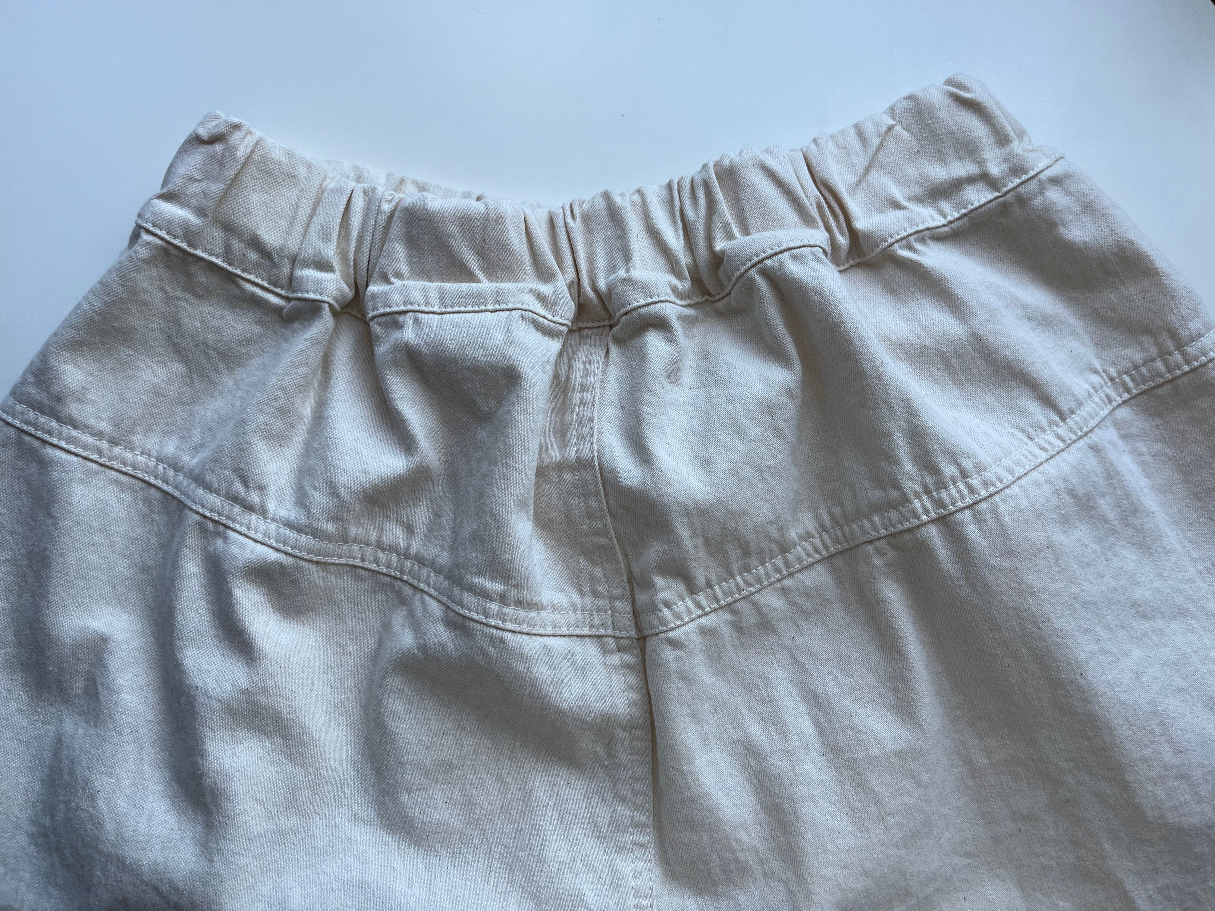 後ろの切り替えラインが腰まわりをすっきり見せ、ワイドシルエットでも軽やかな印象に仕上げています。
