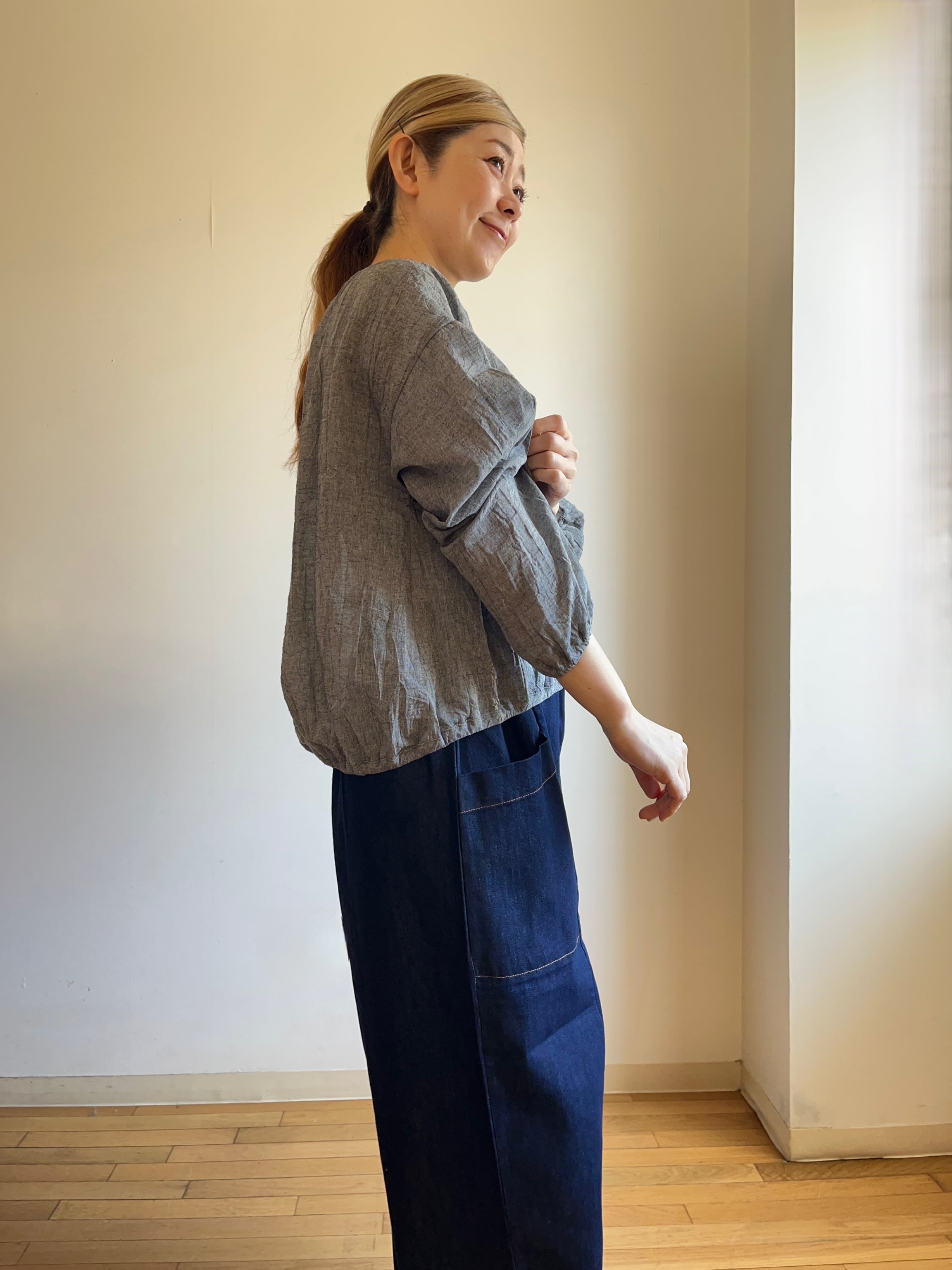 裾ゴム綿麻ブラウス