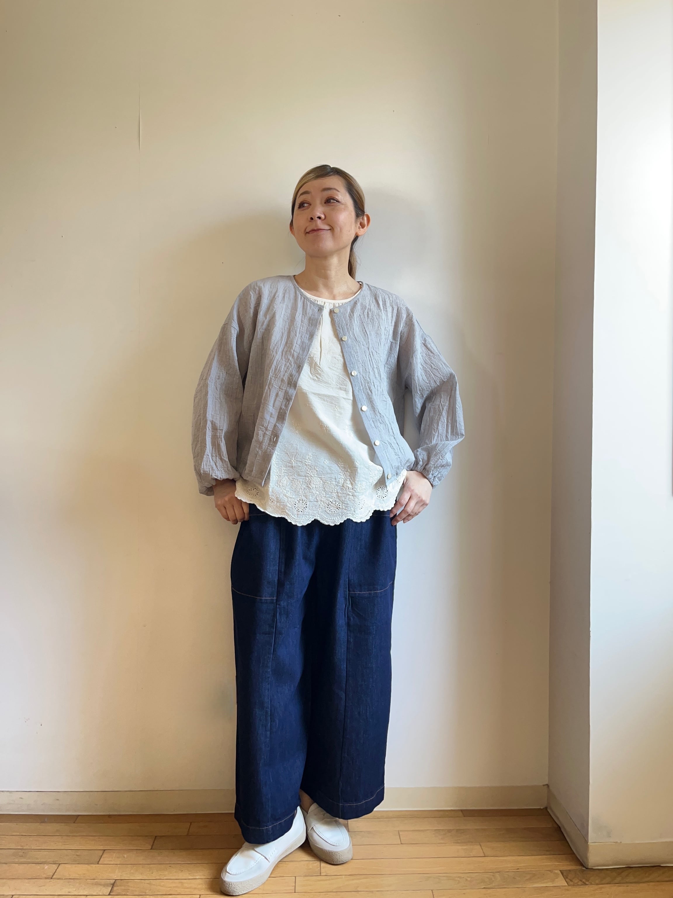 肌触りは心地よく、通気性も抜群です。裾にはゴムが施されており、シルエットが美しく整います。リラックスした雰囲気を持ちながら、きちんと感もあるデザインで、普段使いからお出かけまで幅広くご活用いただけます。