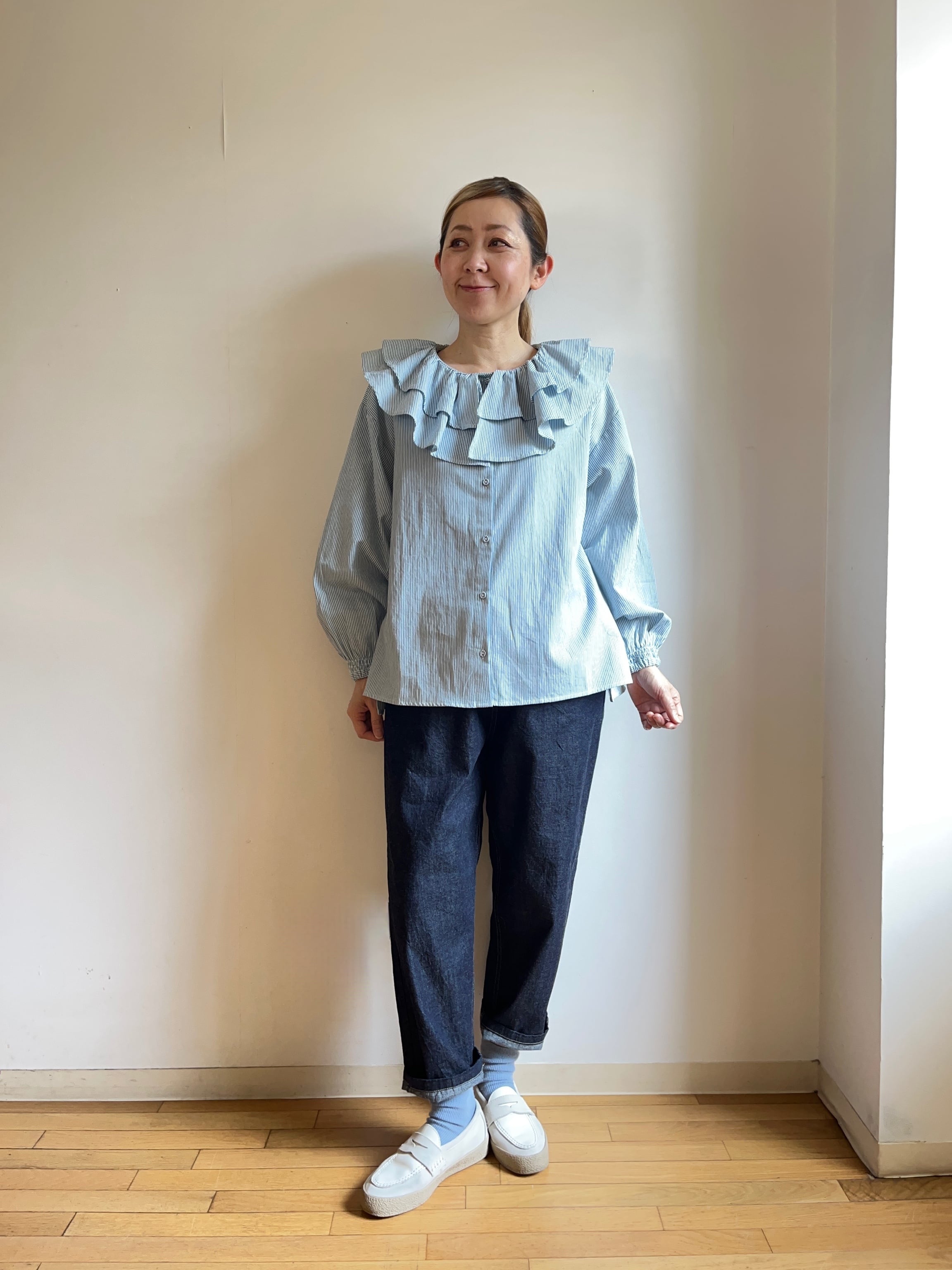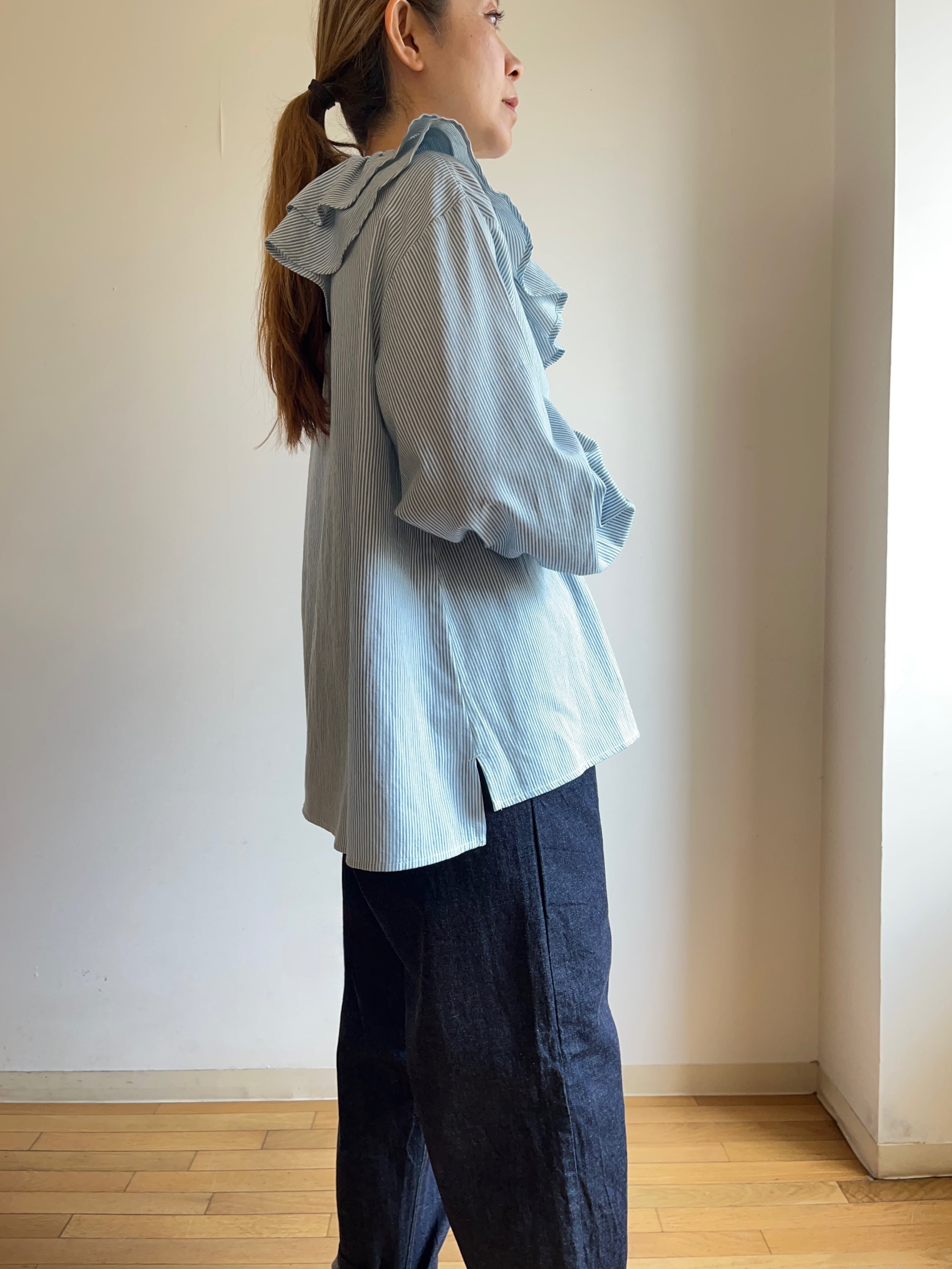 存在感のある二重仕立てのラッフルカラーと袖口シャーリングがポイントです。