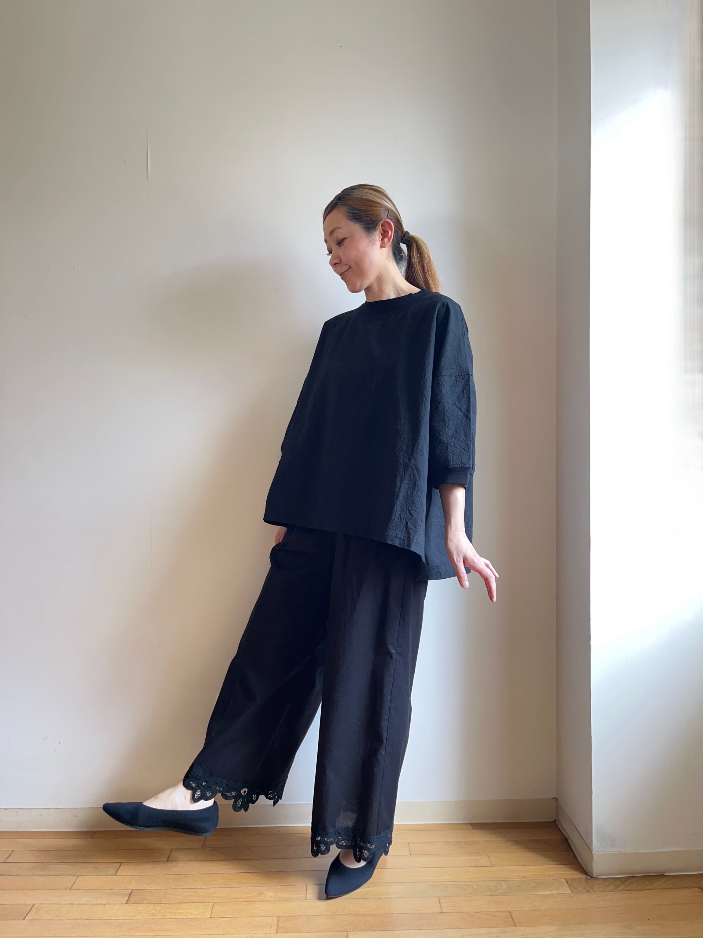 ゆったりとした履き心地で、体型を気にせずリラックスしてご着用いただけます。シンプルでありながら、着こなしに華やかさをプラスしてくれる一着です!