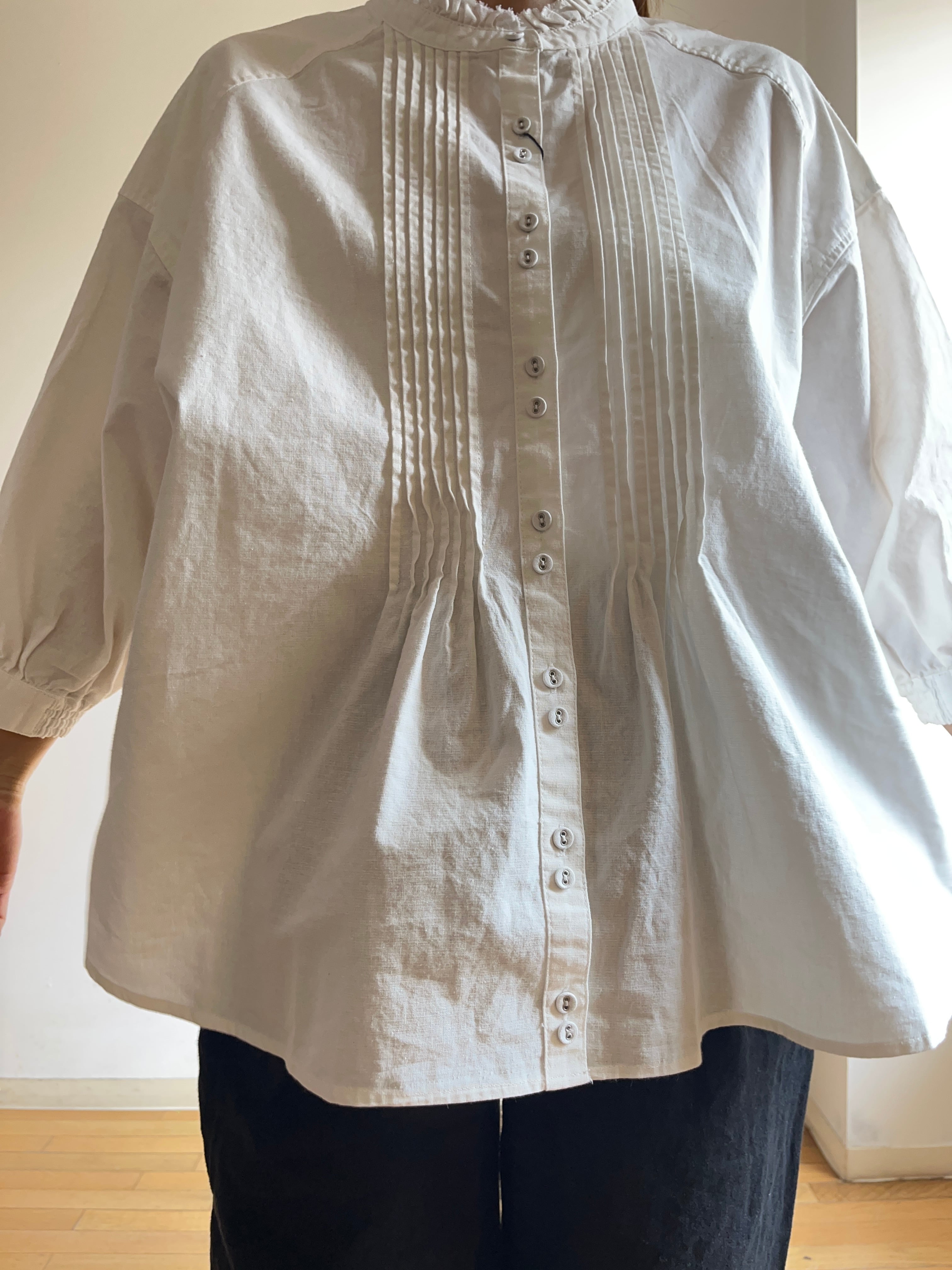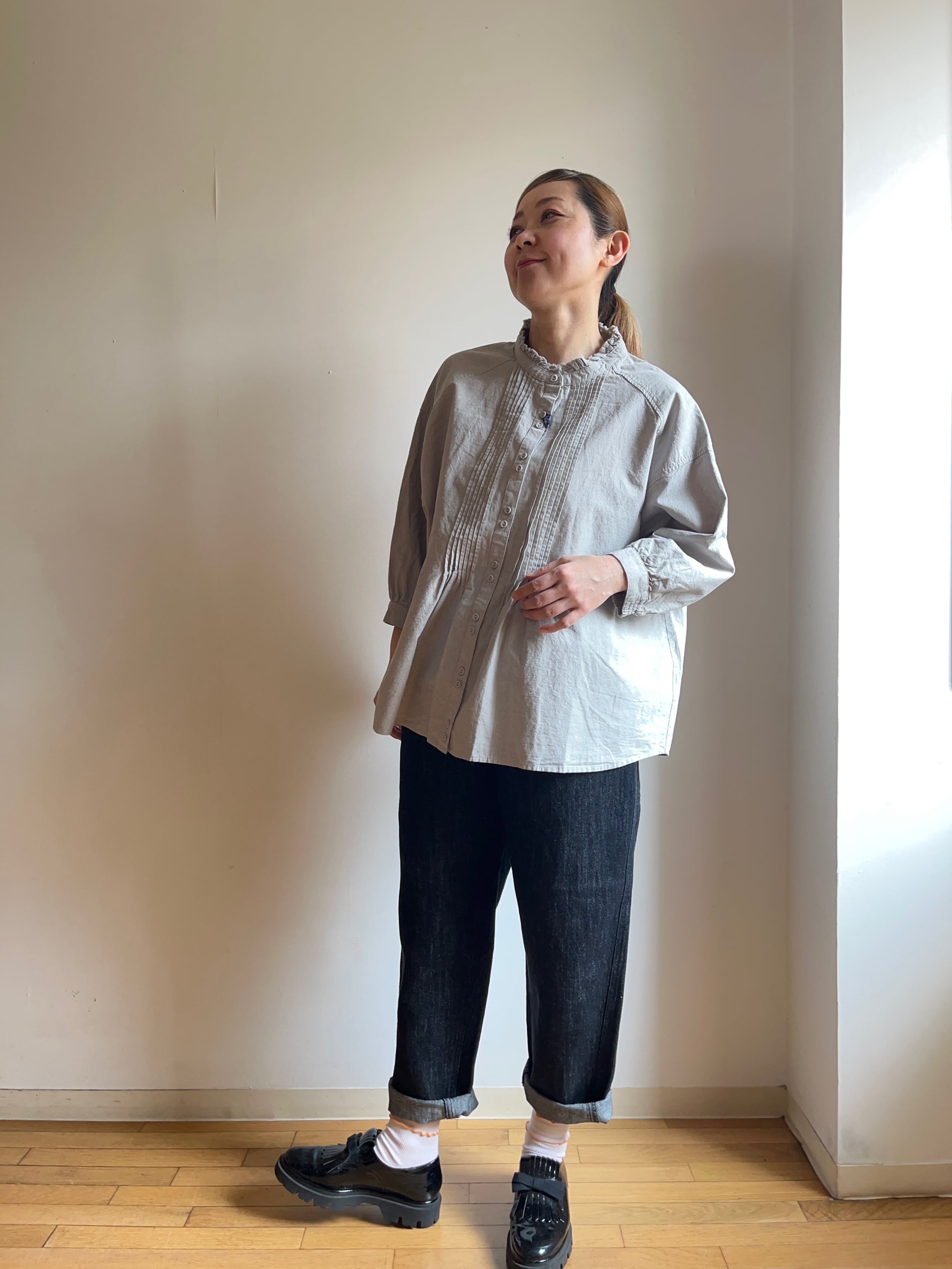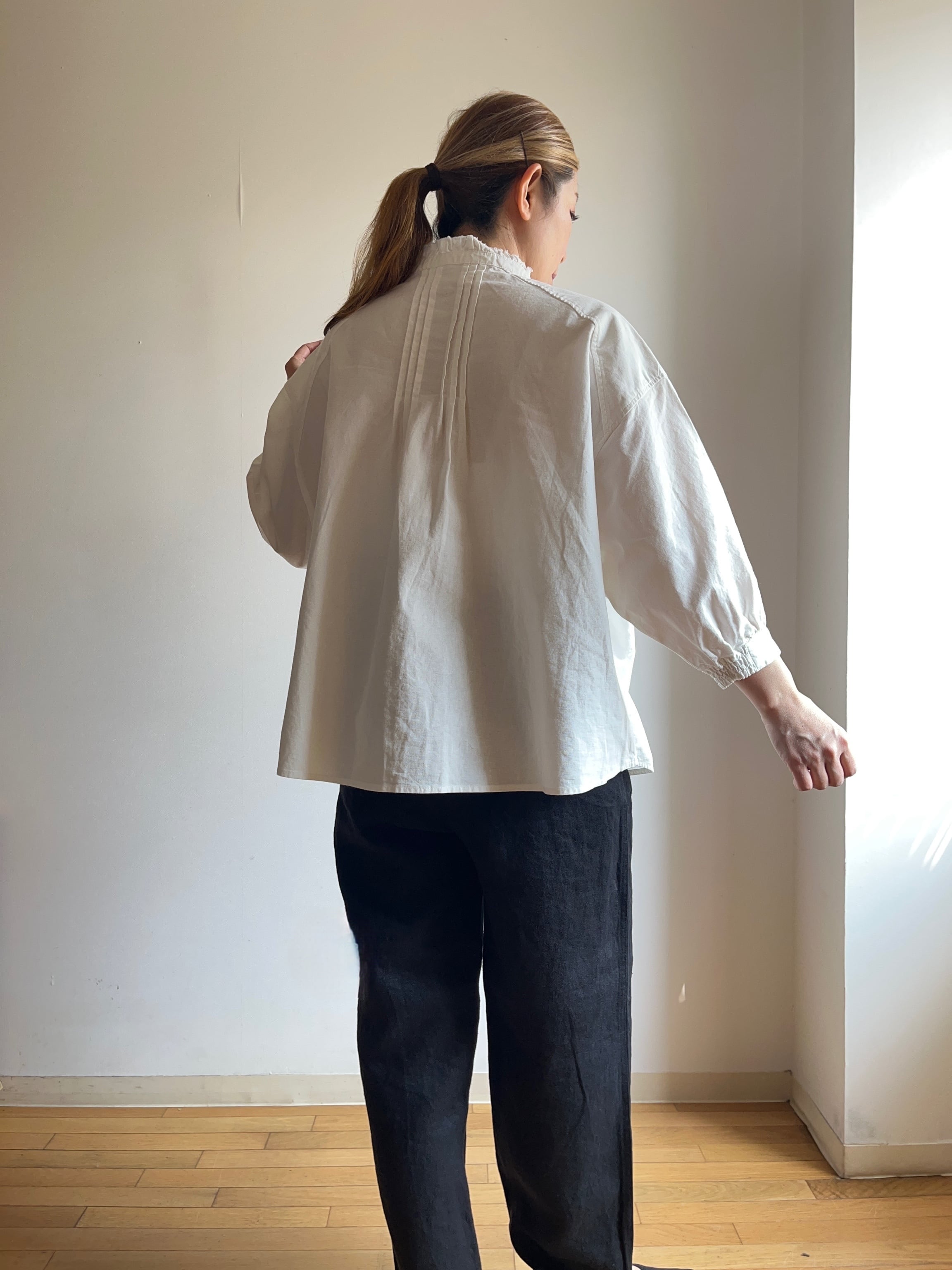 ハリのある綿麻素材を使用したこのシャツは、ふんわりとしたフリンジ衿が特徴で、シンプルながらもこなれた印象を与えます。カジュアルなスタイルでも、ちょっとしたお出かけにも適したアイテムです!