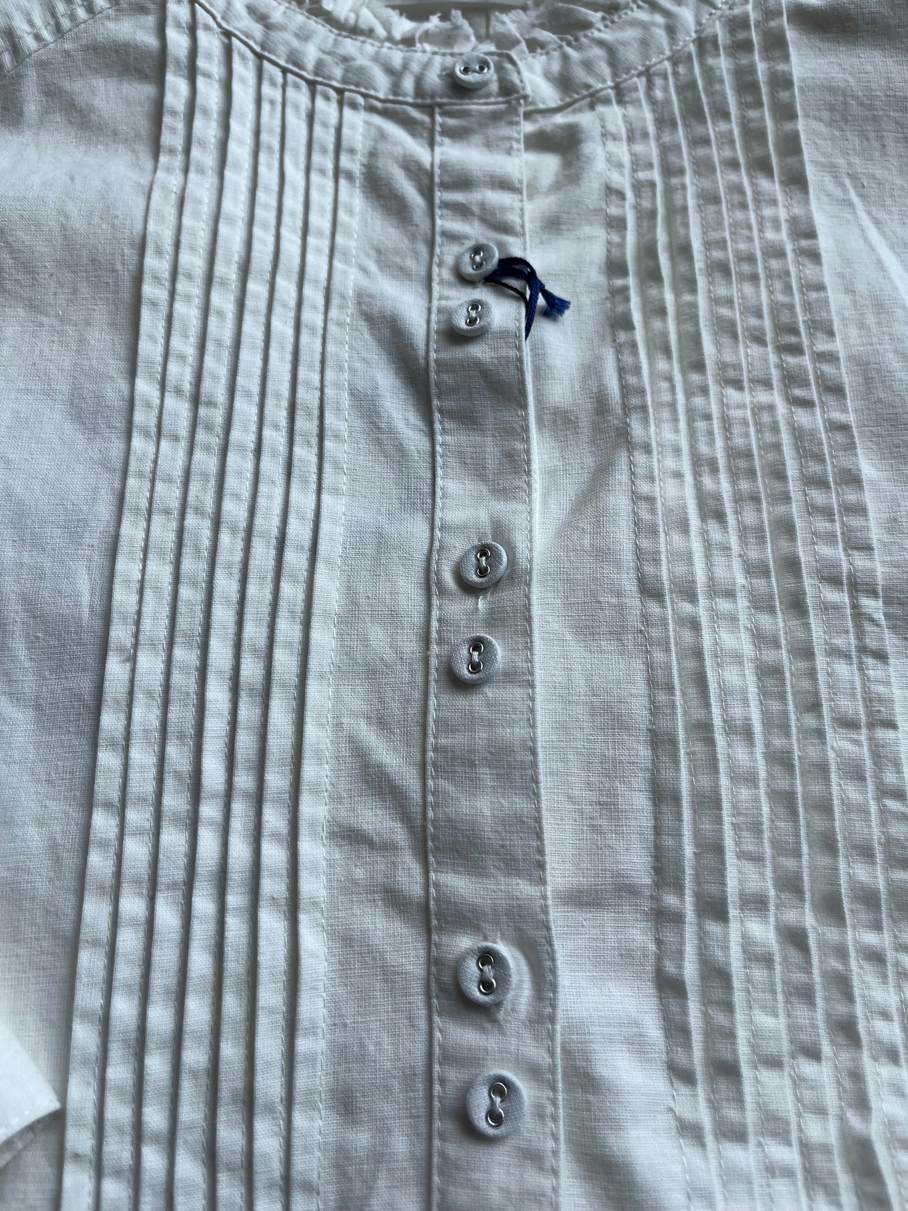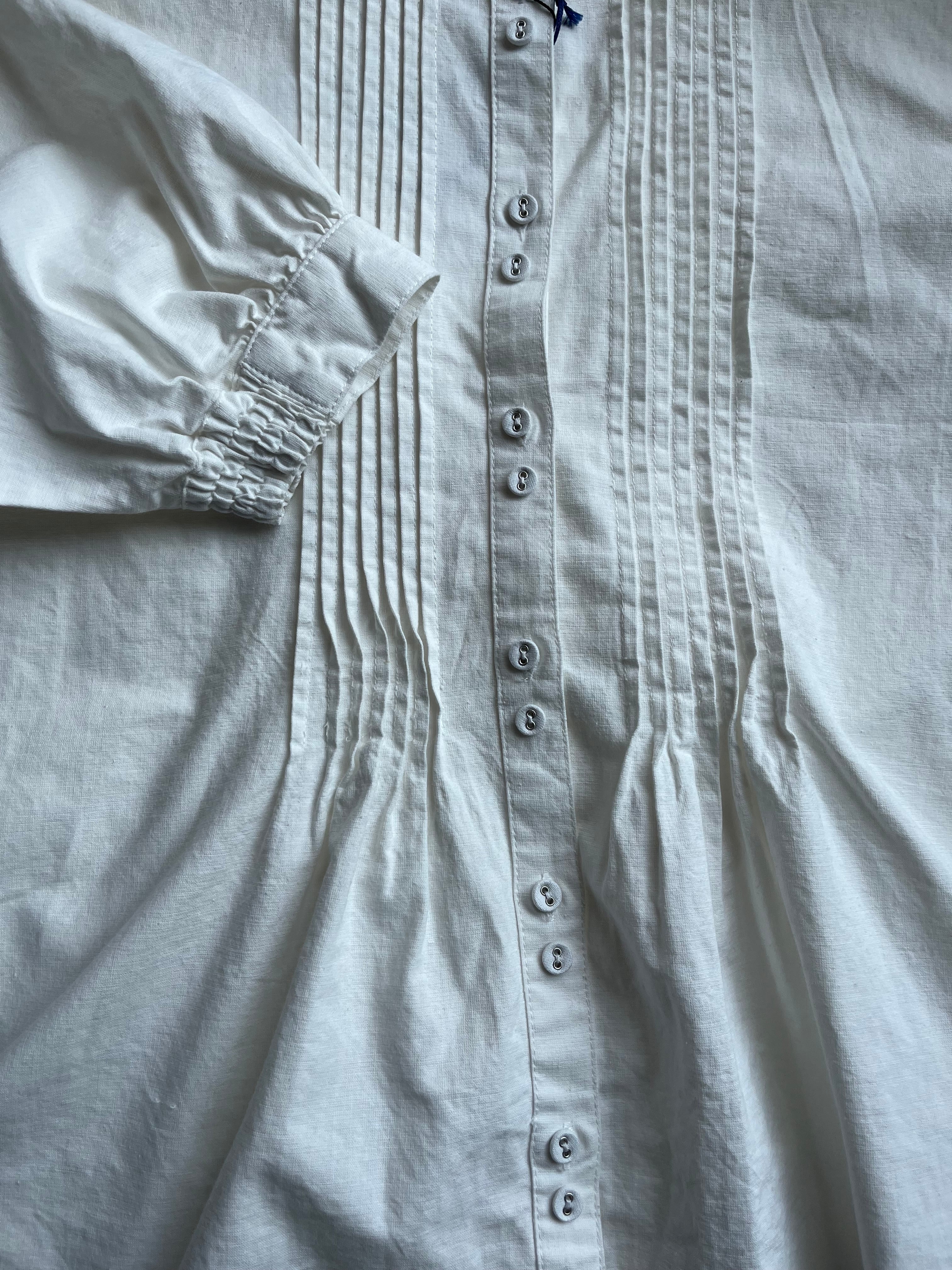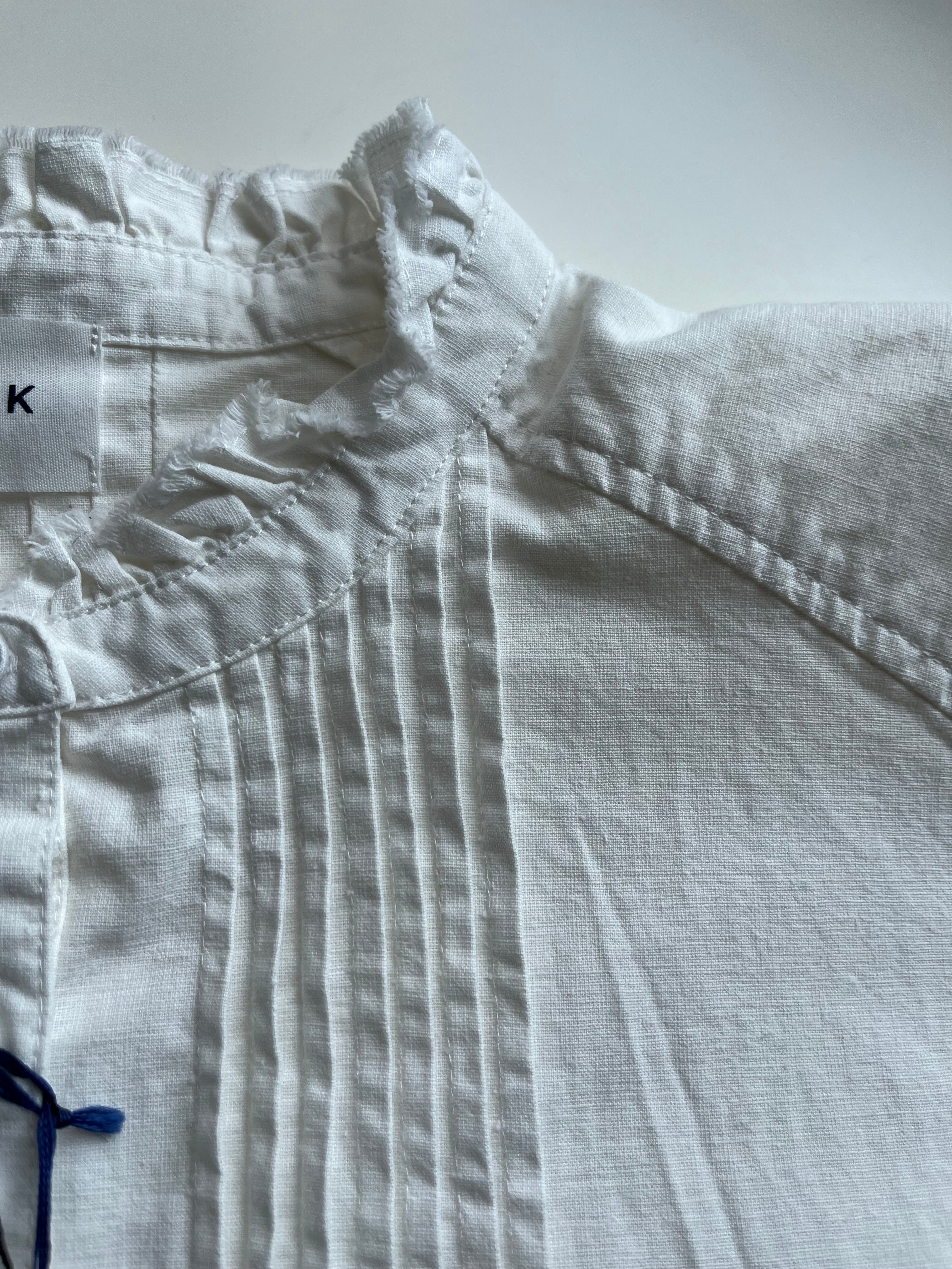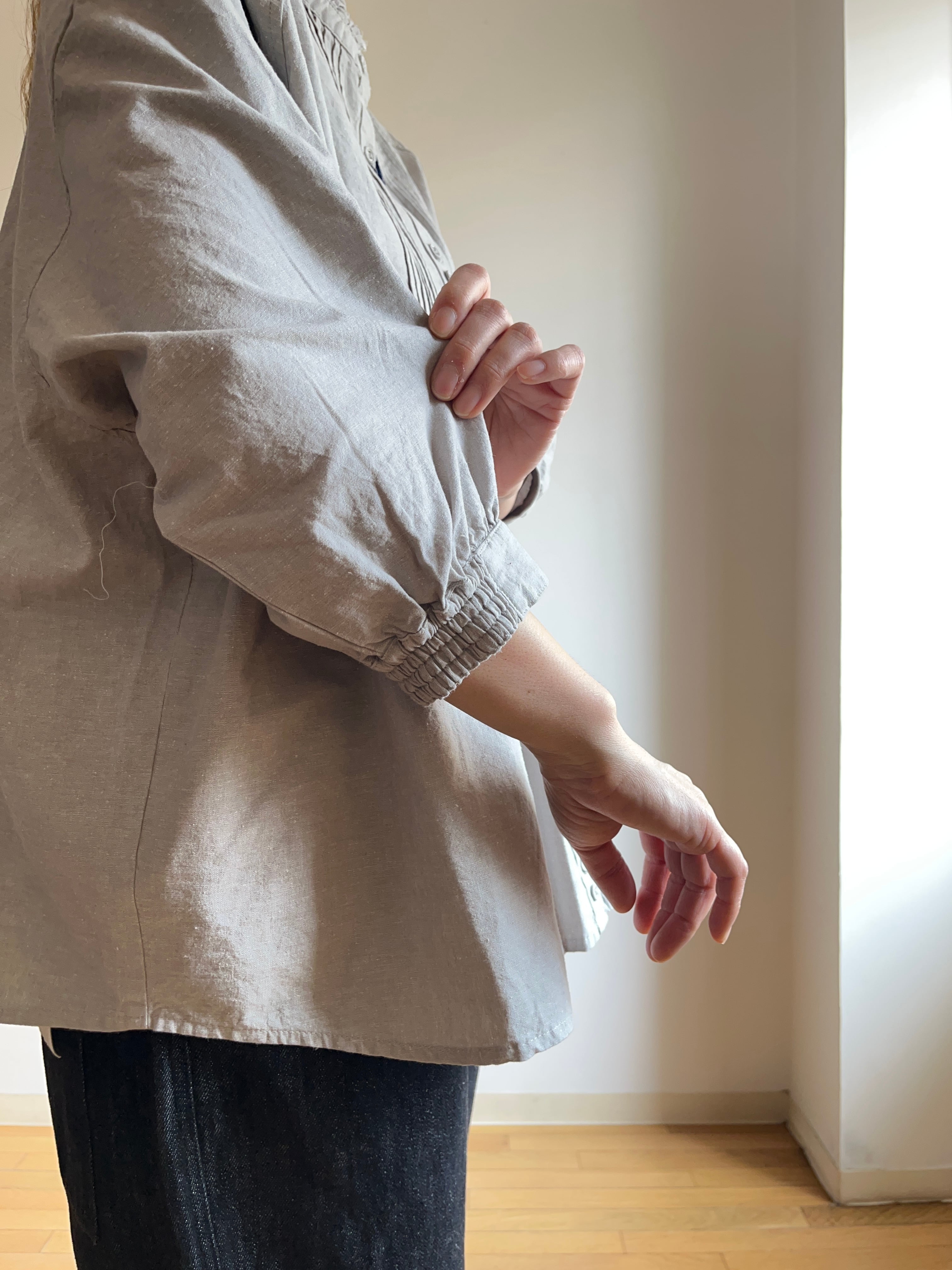 ハリのある綿麻素材を使用したこのシャツは、ふんわりとしたフリンジ衿が特徴で、シンプルながらもこなれた印象を与えます。カジュアルなスタイルでも、ちょっとしたお出かけにも適したアイテムです!
